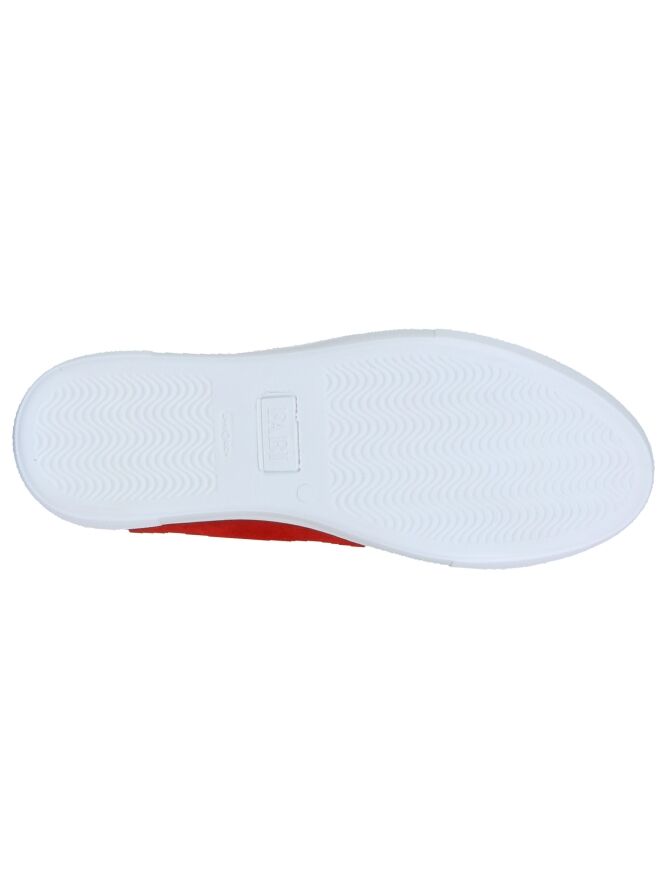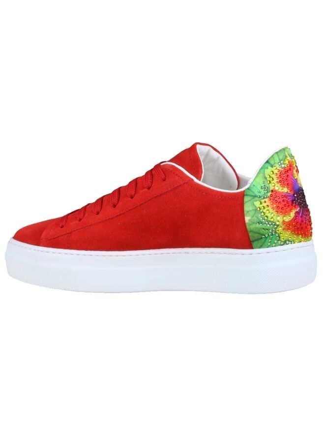 Roter Sneaker der Designerschuhmarke Fabi. Die Schnürsenkel sind in der Farbe des Wildleders, die Sohle ist weiß. Die Ferse ist mit einer Blume aus gelbem, grünem und rotem Strass versehen. Der Sneaker hat ein Innenfutter aus Leder und eine herausnehmbare Innensohle.
