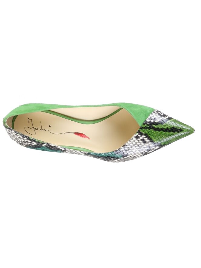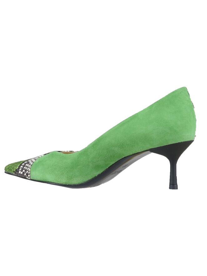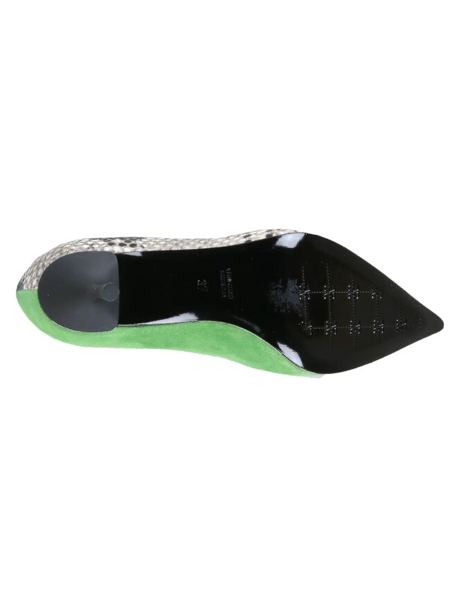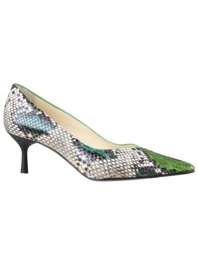 Pumps der Schuhmarke Fabi. Die Außenseite und der vordere Teil des Fußes kommen in einem Reptilprint in Cremeweiß, Grün und Schwarz. Die Innenseite ist aus Camoscio-Wildleder. Die Schuhspitze des Pumps ist schmal, die Queenie-Absätze sind schwarz. Der Pumps hat ein Innenfutter aus Leder.