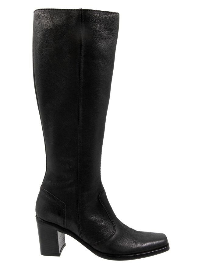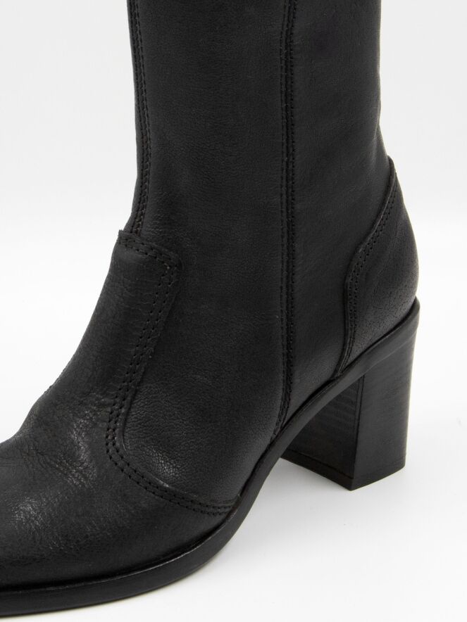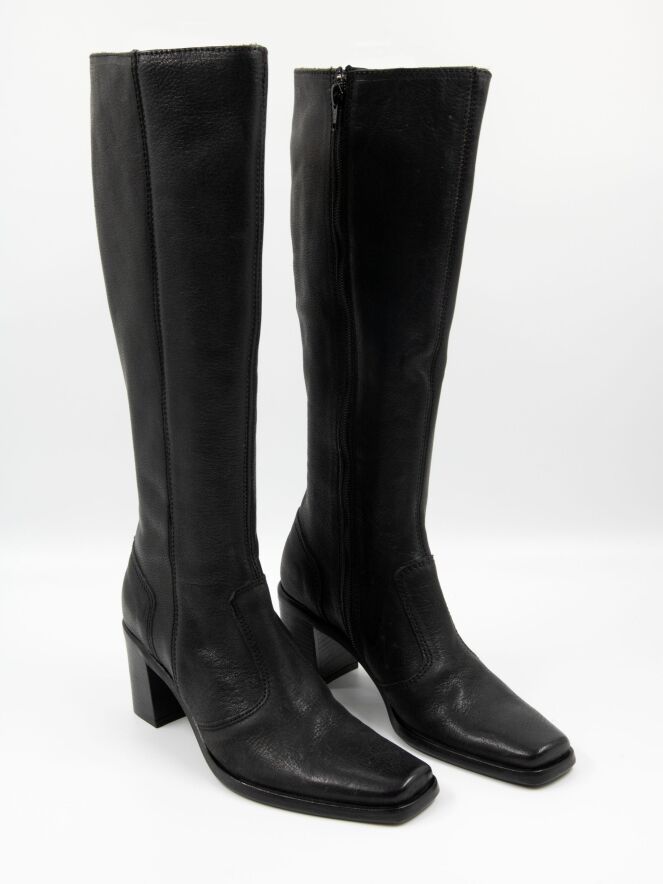 Hoher Stiefel von Franco Troise in Schwarz. Am unteren Schaft befindet sich ein Riemchen mit silberfarbener Schnalle. Der Stiefel hat eine spitze Kappe und einen schmalen Absatz. Am oberen Schaftrand sorgt ein elastischer Einsatz in einem Einschnitt für mehr Komfort. Das Innenfutter besteht aus Leder.