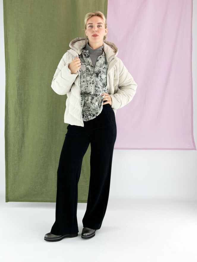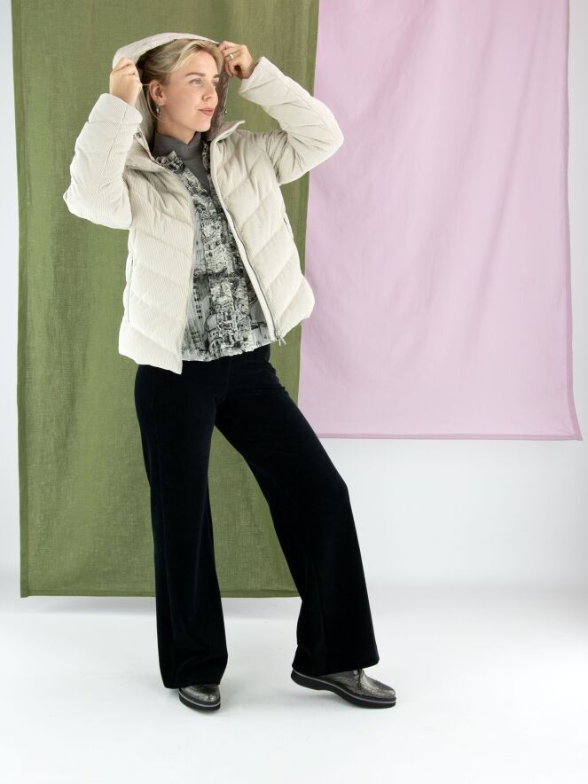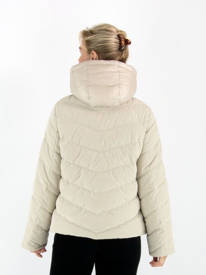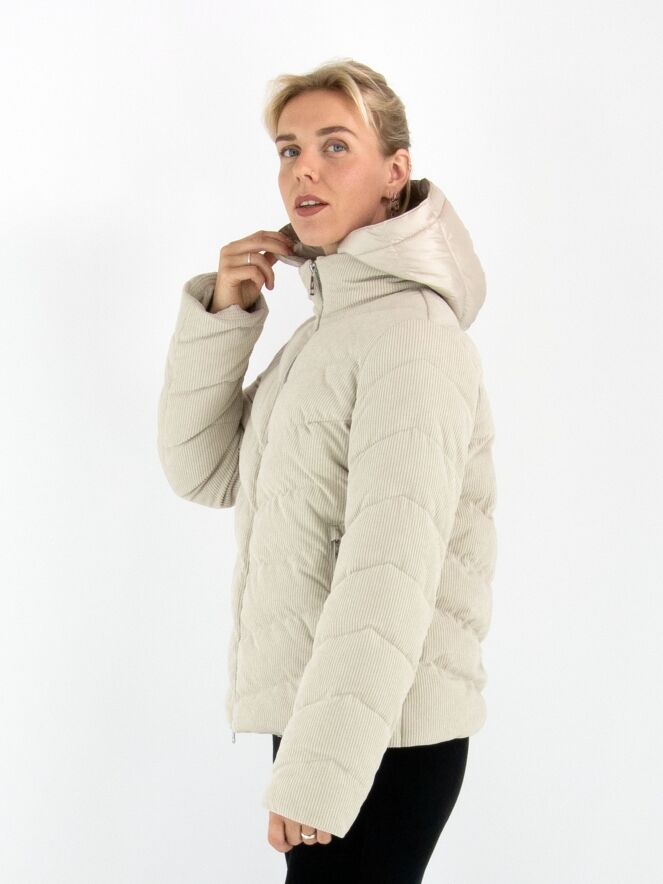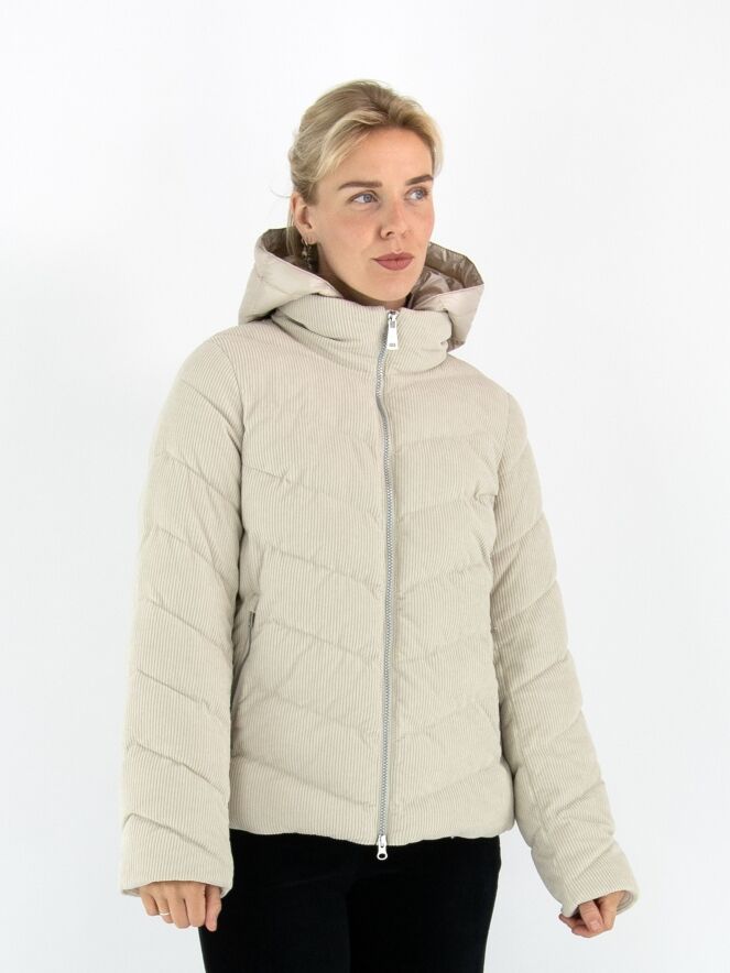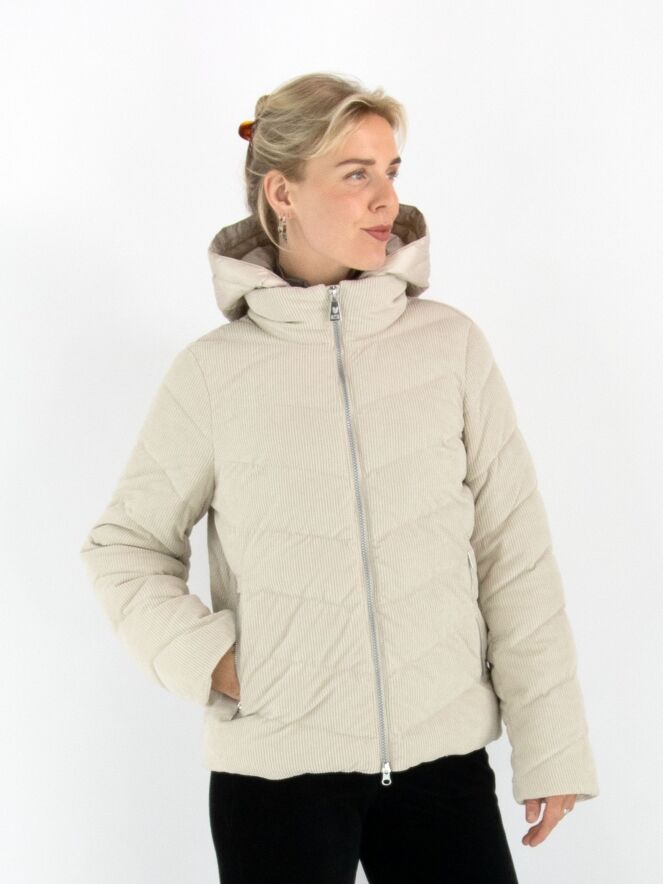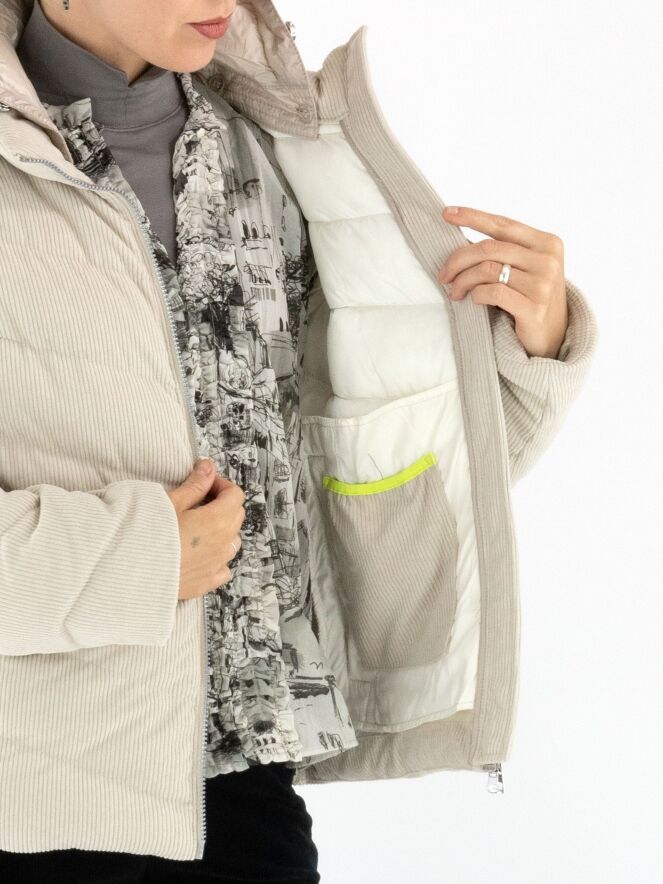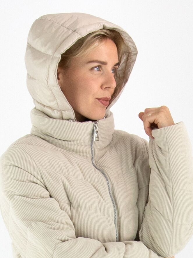 Ein Mantel von Fuchs Schmitt aus beige-farbenem Cordstoff. Der Mantel hat eine abnehmbare Kapuze aus Fallschirmstoff. Der Verschluss erfolgt mit einem Reißverschluss, und auch die Taschen sind mit Reißverschlüssen versehen. Dieser Mantel kann bei 30 Grad gewaschen werden.