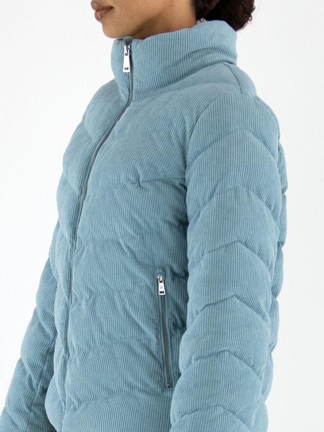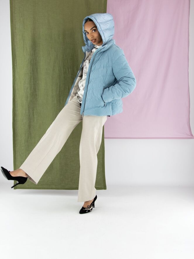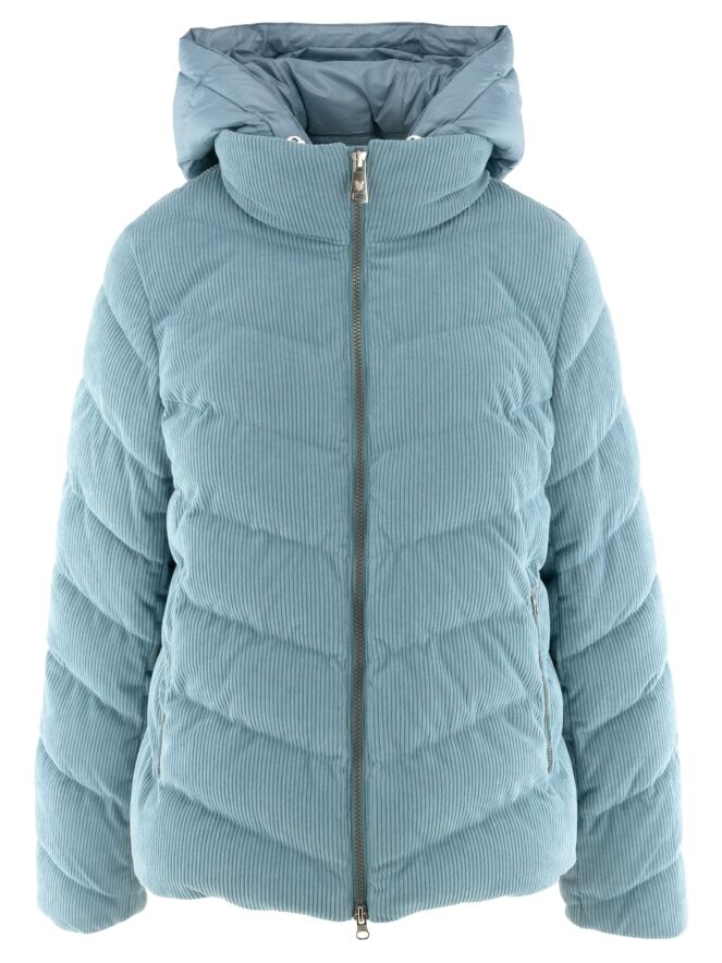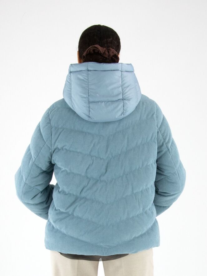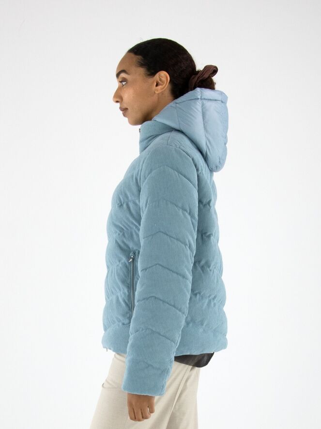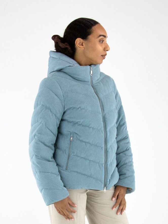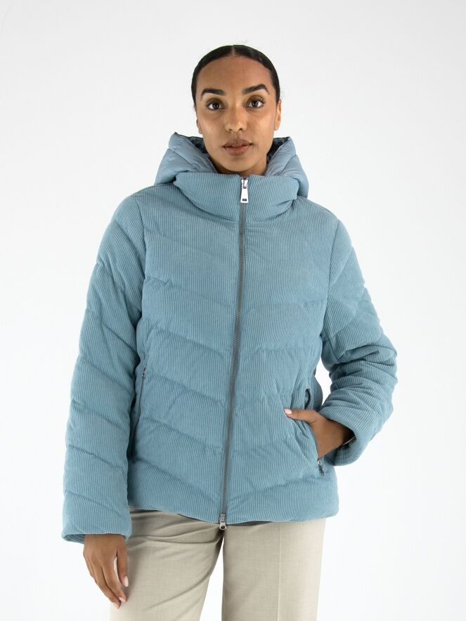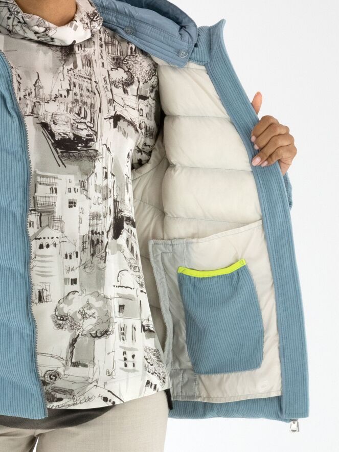 Ein Mantel von Fuchs Schmitt aus Cordstoff in Blau. Der Mantel hat eine abnehmbare Kapuze aus Fallschirmstoff. Er wird mit einem Reißverschluss geschlossen, und auch die Taschen sind mit Reißverschlüssen versehen. Dieser Mantel kann bei 30 Grad gewaschen werden.