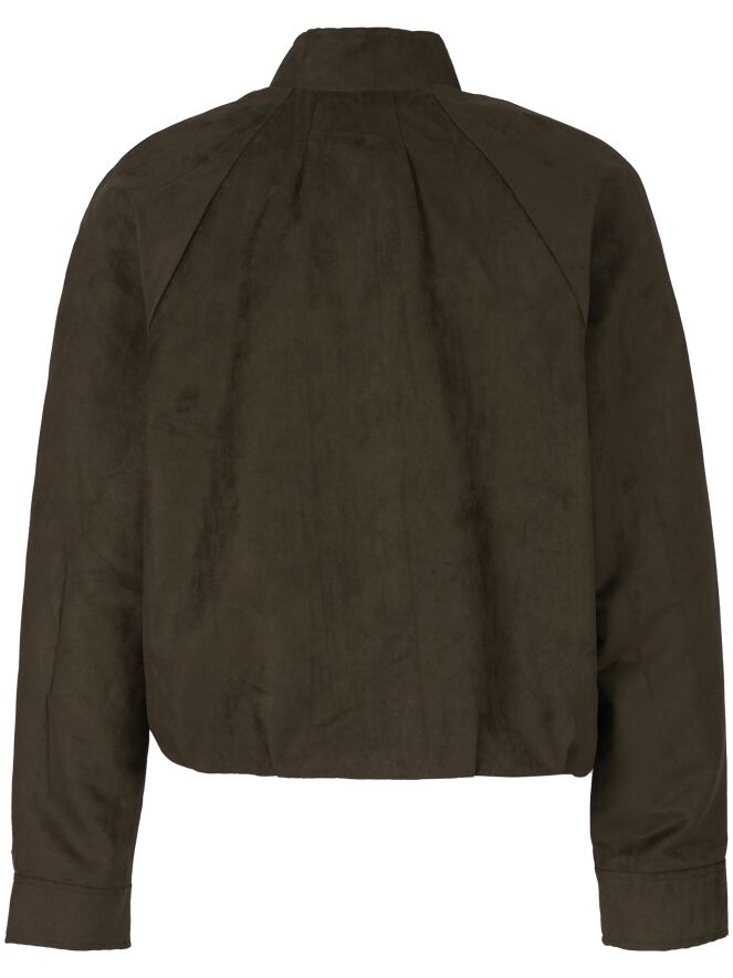 Eine kurze Jacke von Fuchs Schmitt in Mokabraun. Entlang des Kragenrandes verlaufen mehrere Nähte nach unten, die einen leichten Falteneffekt erzeugen. Die Jacke hat einen Reißverschluss und Seitentaschen auf Taillenhöhe. Diese Jacke kann bei 30 Grad gewaschen werden.
