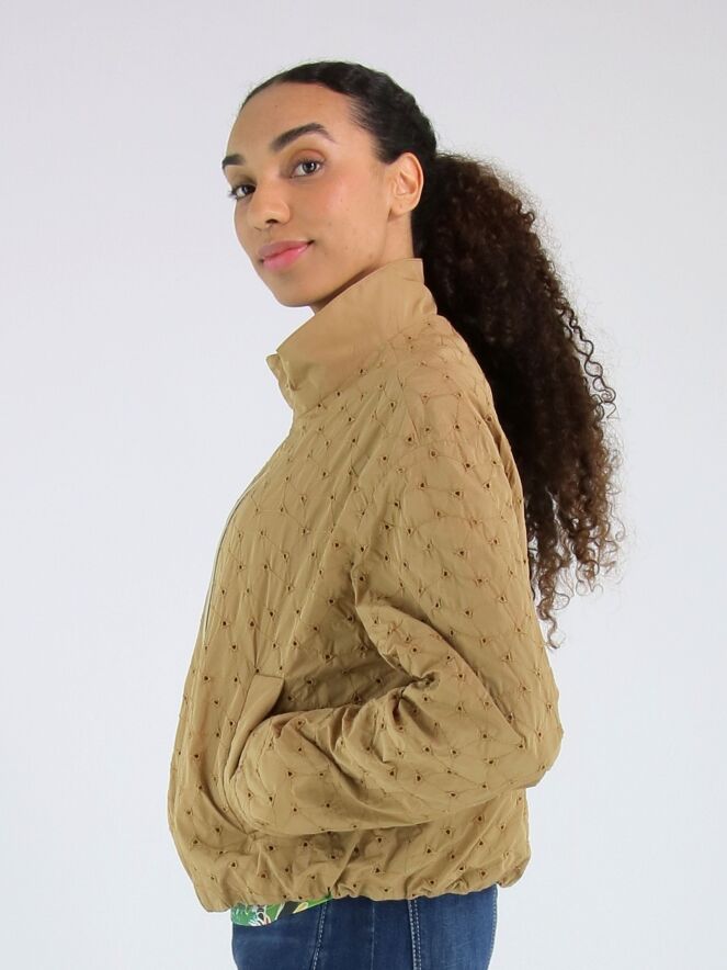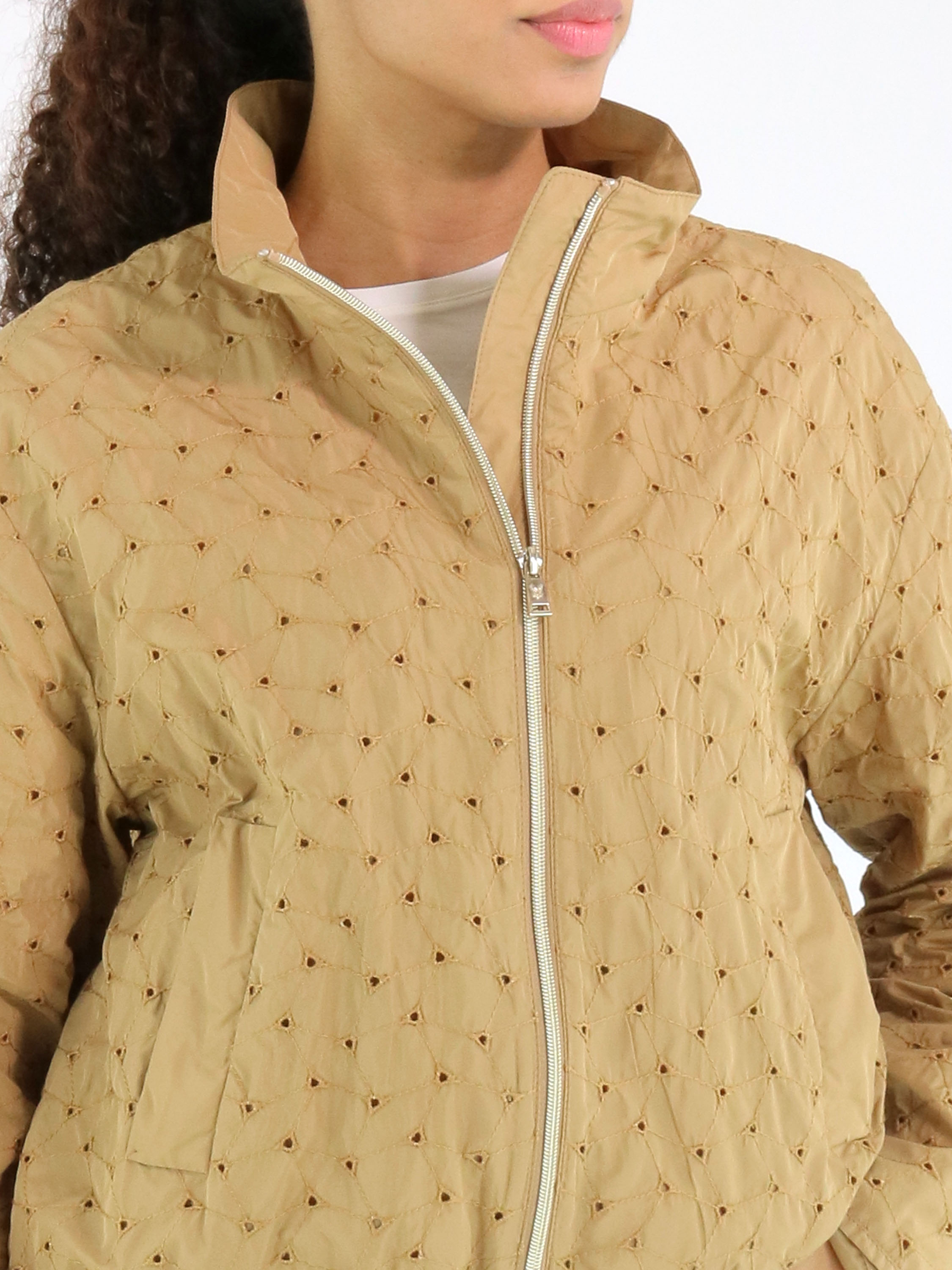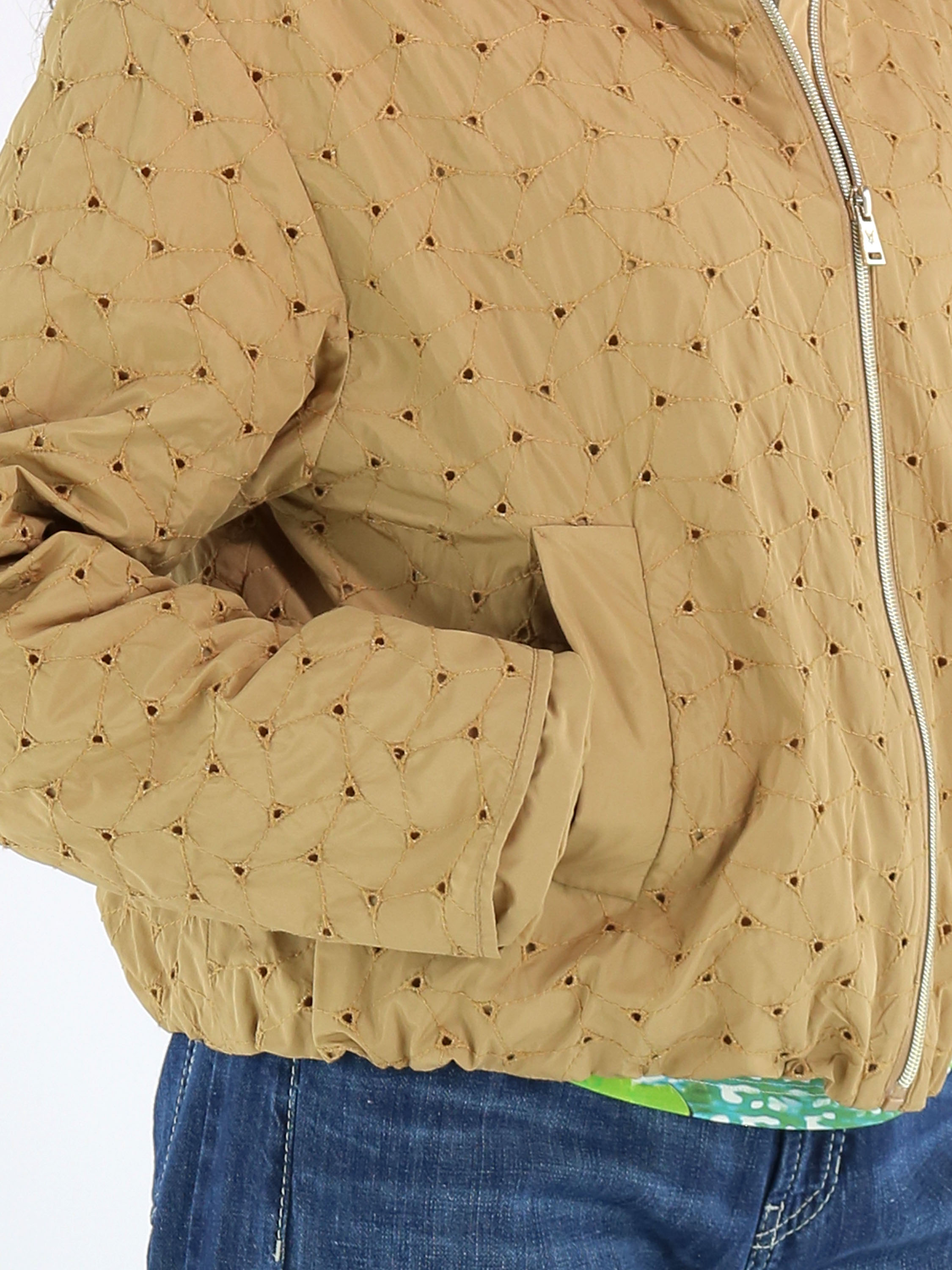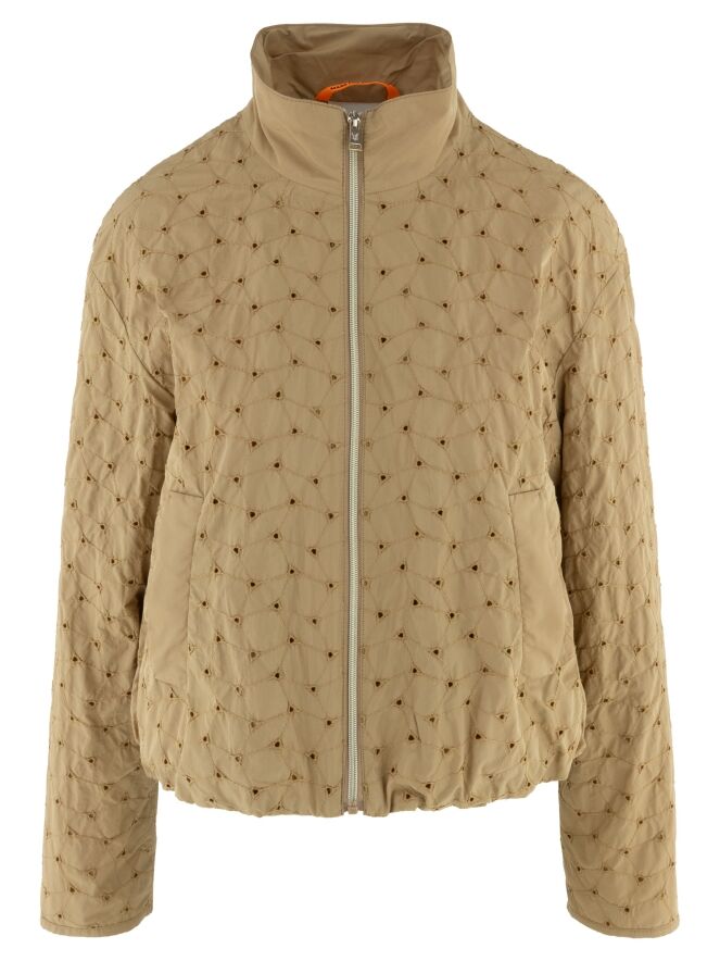 Sommermantel von Fuchs Schmitt in einem warmen Camelton. Der Stoff ist mit dekorativen Steppnähten in einem dezenten Rautenmuster versehen und an den Kreuzungspunkten perforiert, was eine luftige und elegante Optik erzeugt. Der Mantel verfügt über einen silberfarbenen Reißverschluss und praktische Eingrifftaschen. Dieser exklusive Damenmantel kann bei 30 Grad gewaschen werden.