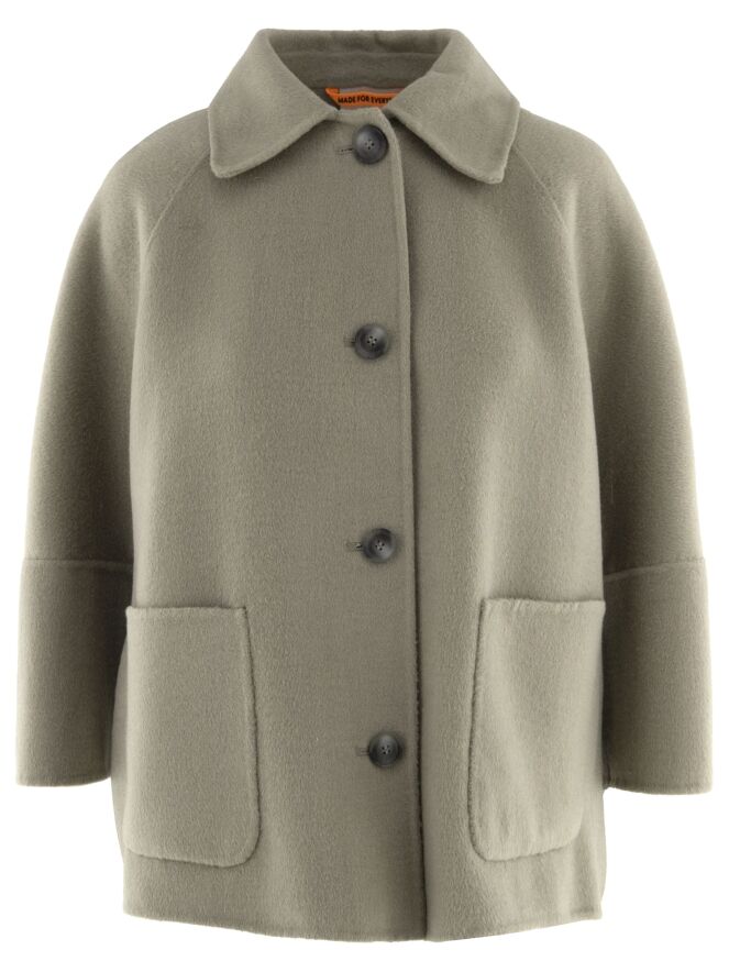 Ein Mantel von Fuchs Schmitt in einem weichen Taupeton. Der Mantel hat einen Verschluss mit vier Knöpfen. Er ist ungefüttert, verfügt über halblange Fledermausärmel und darf nicht gewaschen werden.