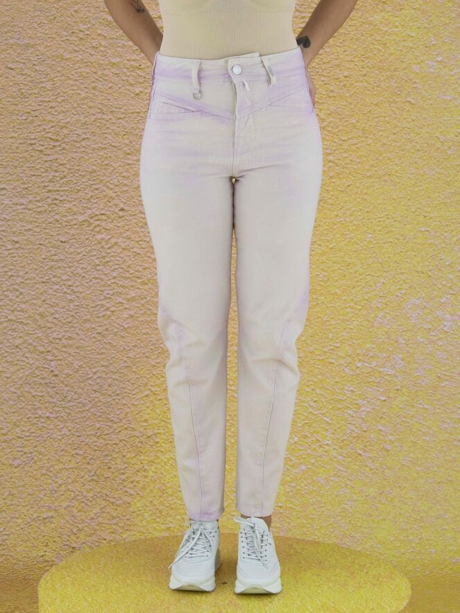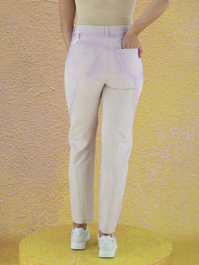 Eine verwaschene Jeans der Designermarke High in Cremeweiß und verschiedenen Rosatönen. Die Jeans kommt als 5-Pocket-Modell und kann bei 30 Grad gewaschen werden.