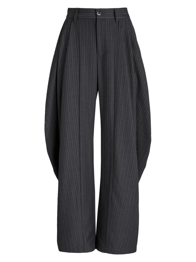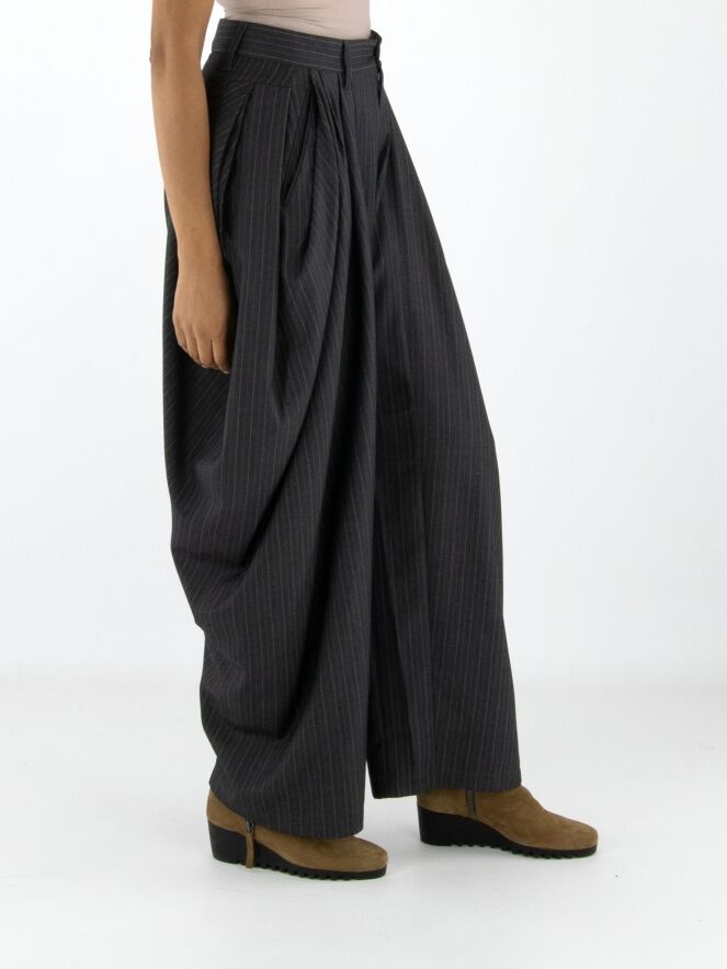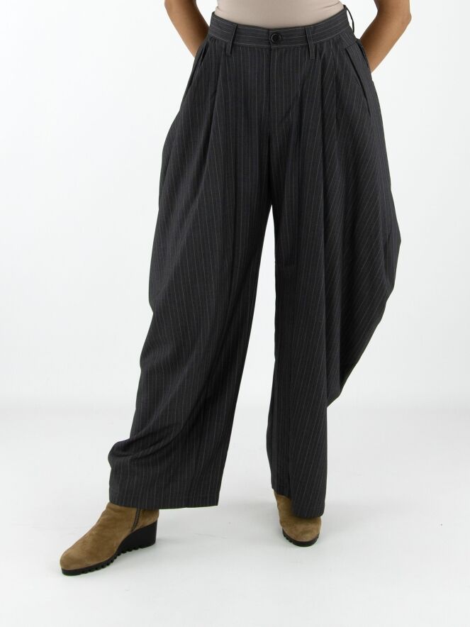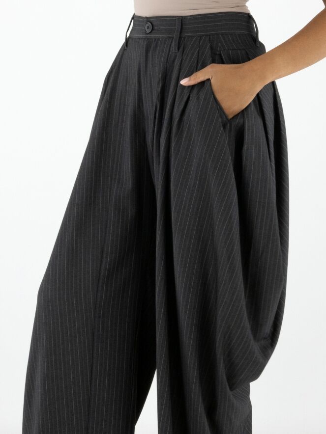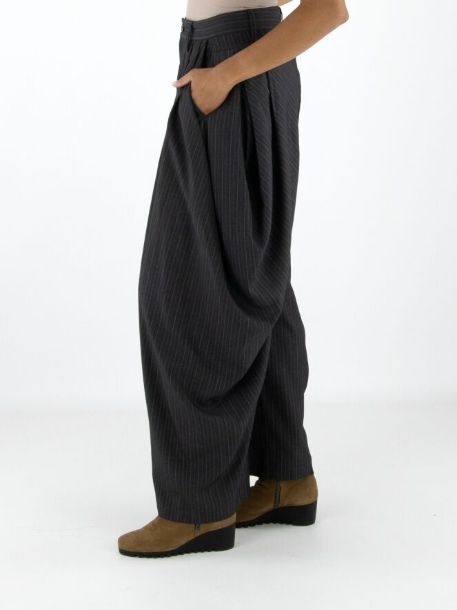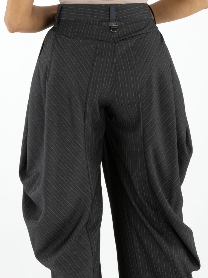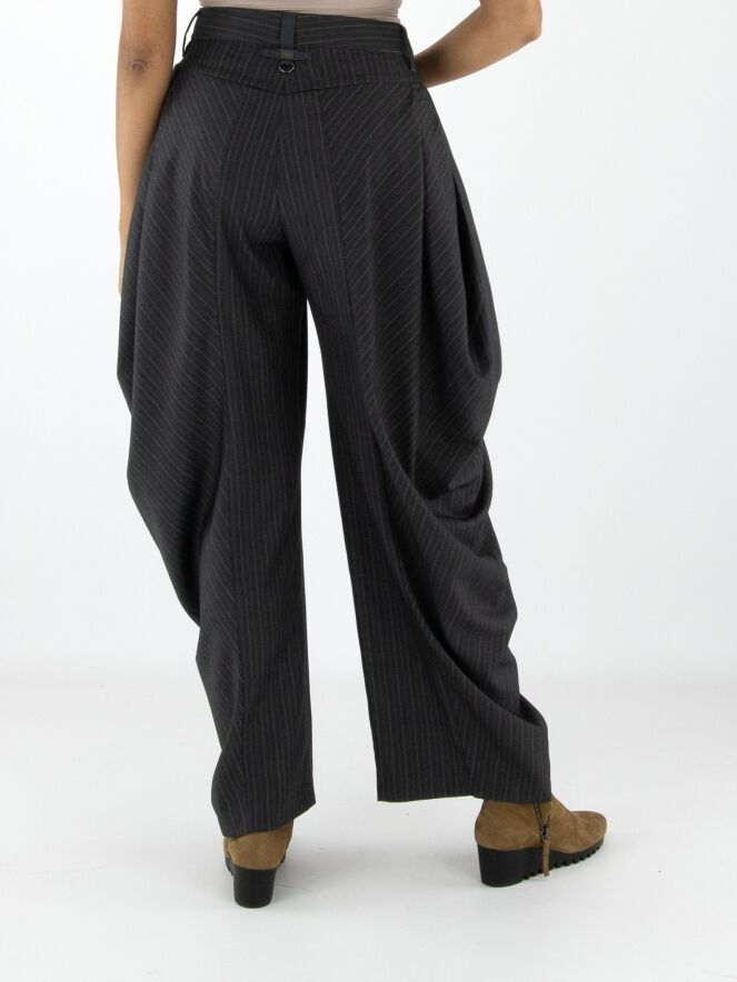 Hose von High im Reitstil-Design mit Nadelstreifen in Grau, Blau und Cremeweiß. Mehrere Falten verlaufen vom Bund, wobei extra breite seitliche Falten den ballonförmigen Effekt ab der Taille betonen. Die Hose hat seitliche Eingrifftaschen und sollte per Hand gewaschen werden.