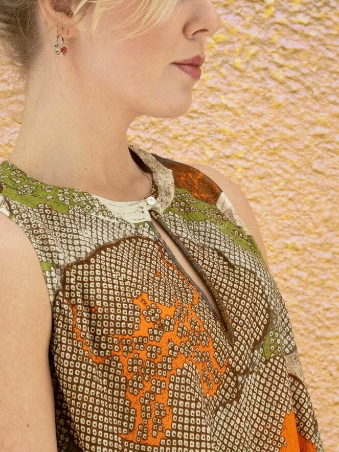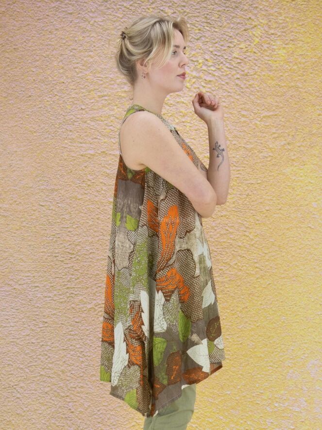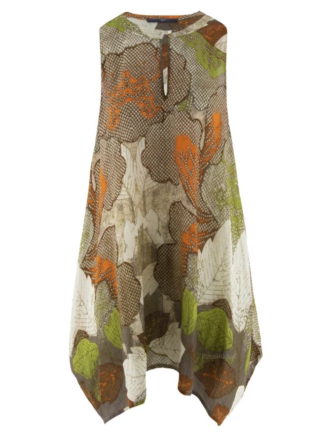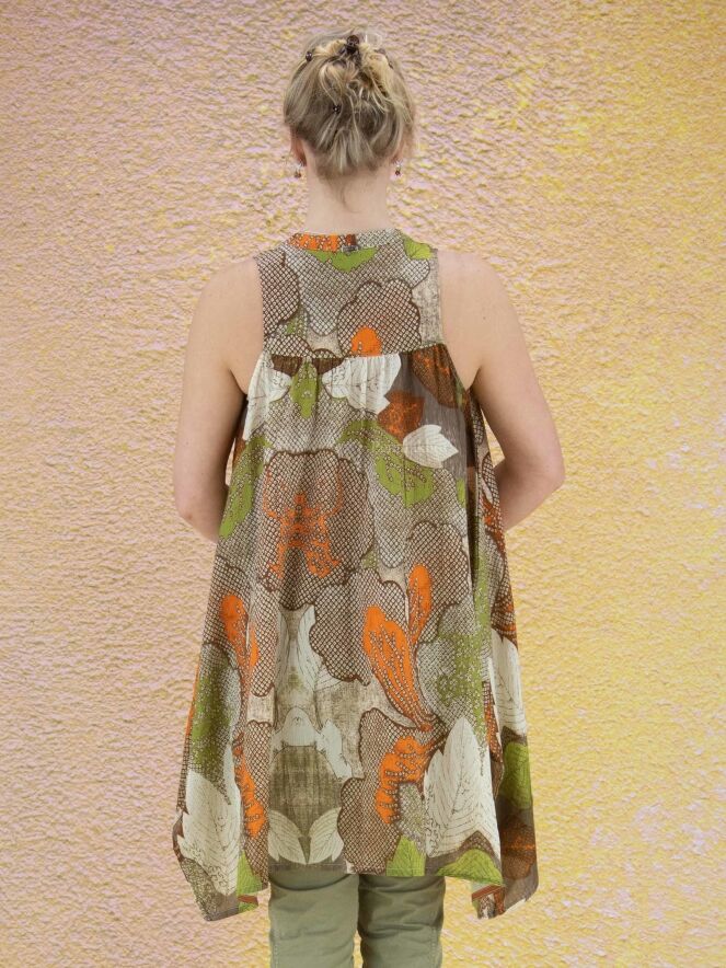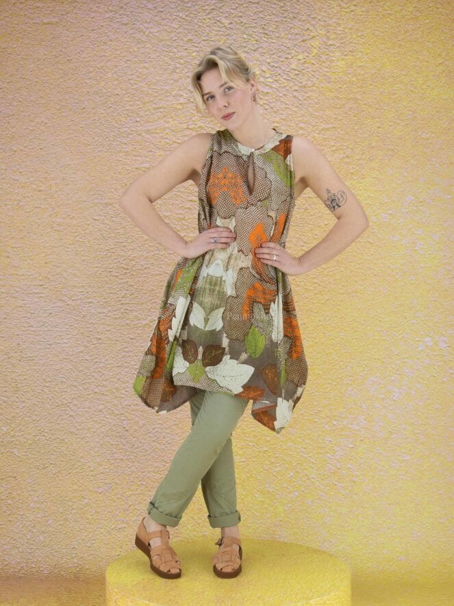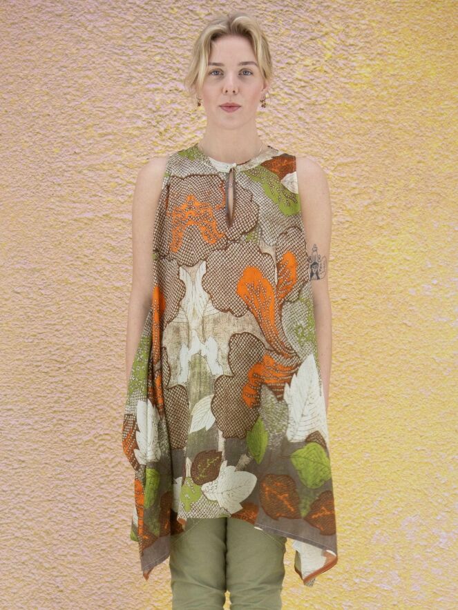 Eine Tunika der Designermarke High mit grafischem Druck aus Blättern in verschiedenen Taupe-Tönen, Orange, Grün und Weiß. Die Tunika hat eine A-Linie und kann bei 30 Grad gewaschen werden.