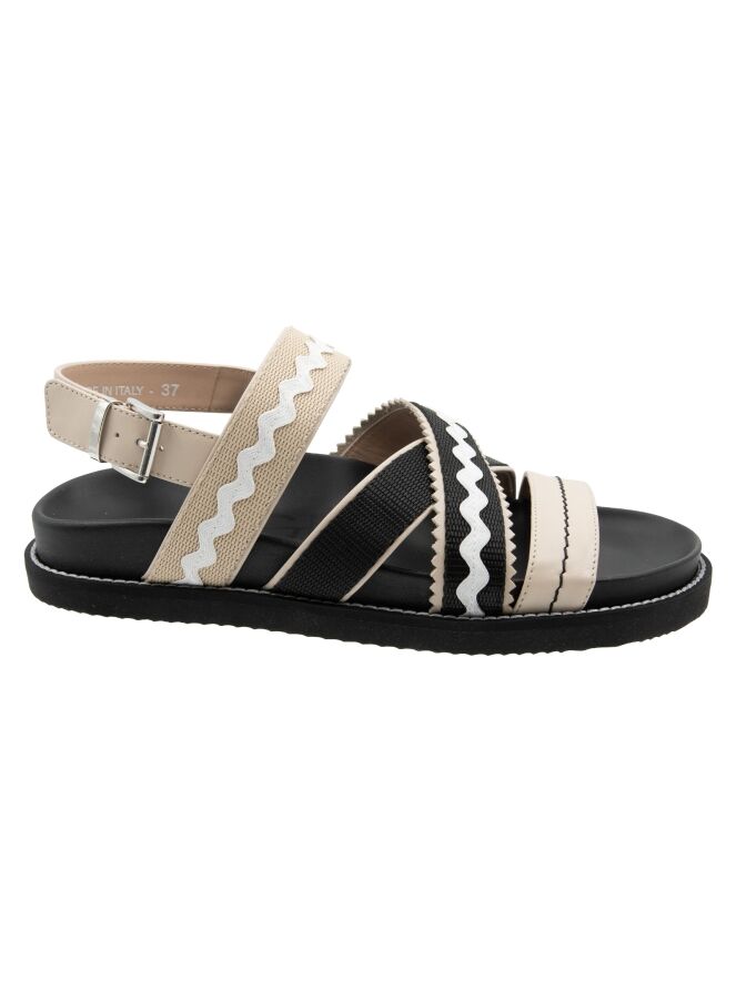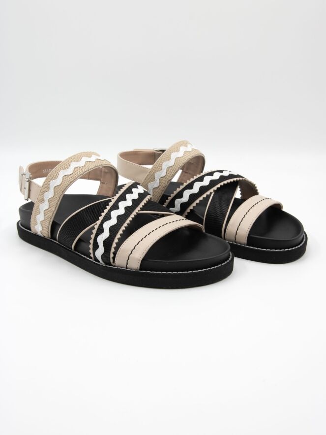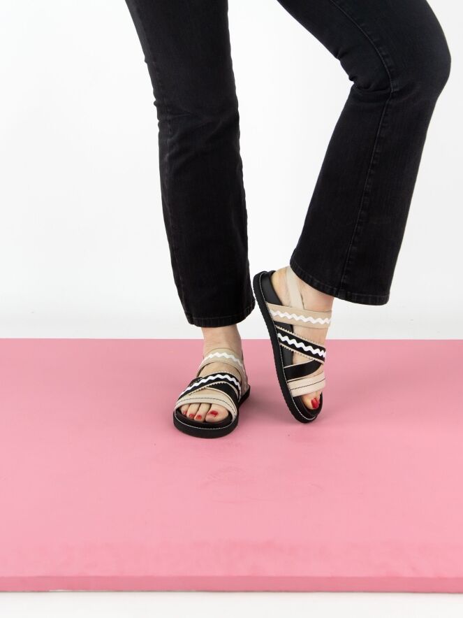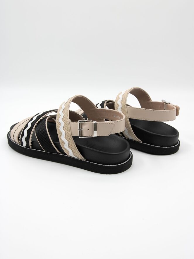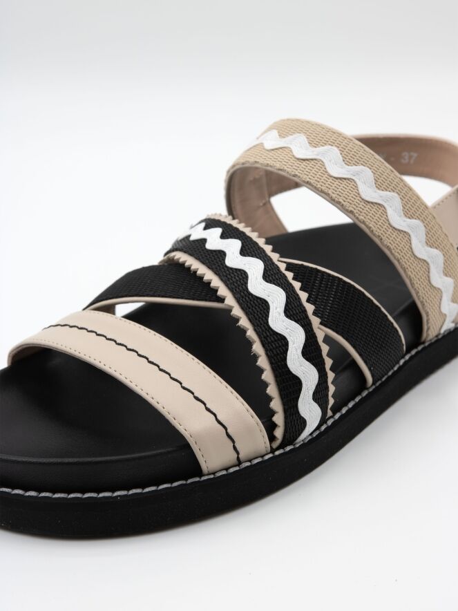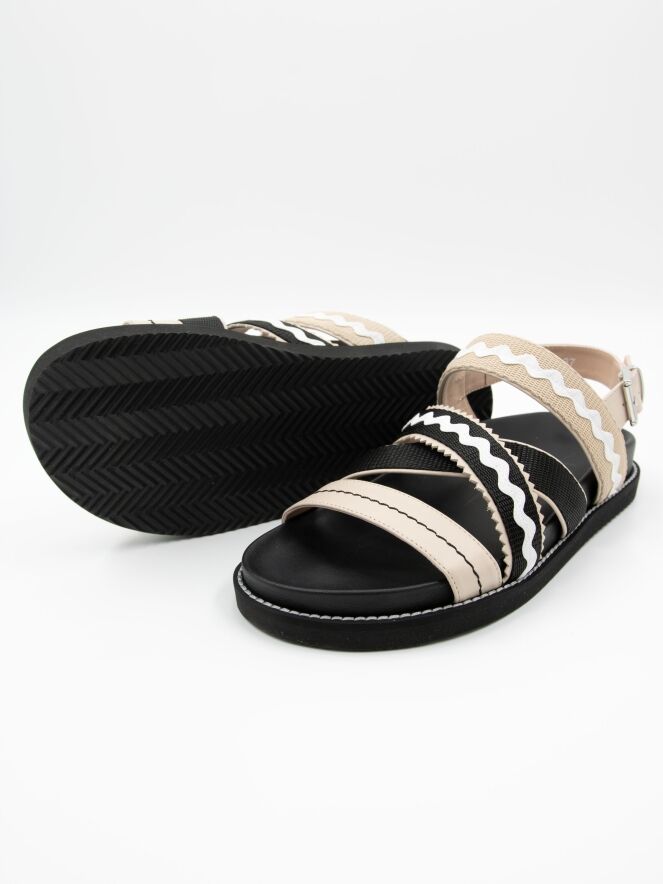 Eine Sandale von High mit überkreuzten Riemen über dem Vorfuß, die ein wellenförmiges Muster und gezackte Kanten haben. Der Fersenriemen ist mit einer silberfarbenen Schnalle verstellbar.