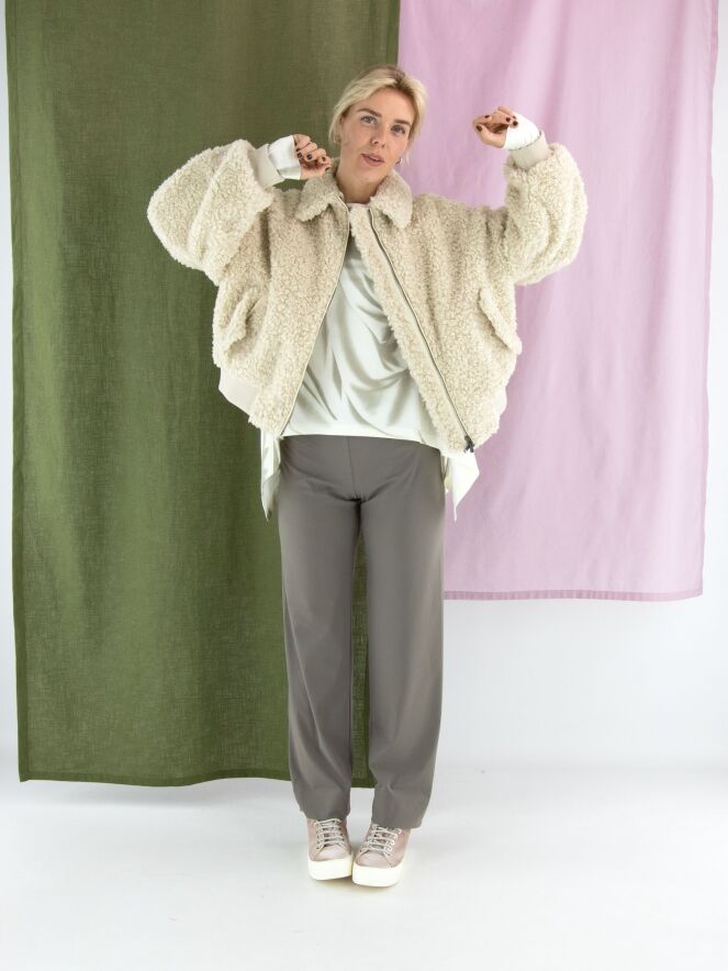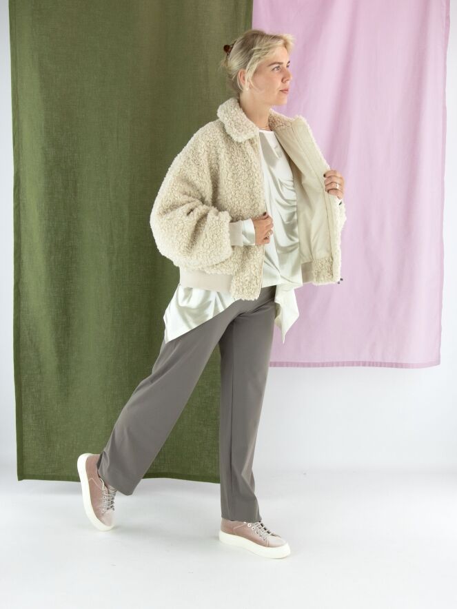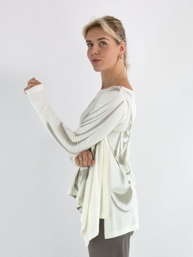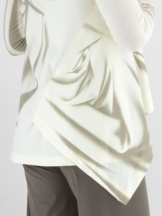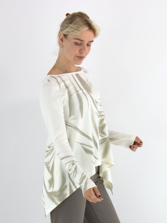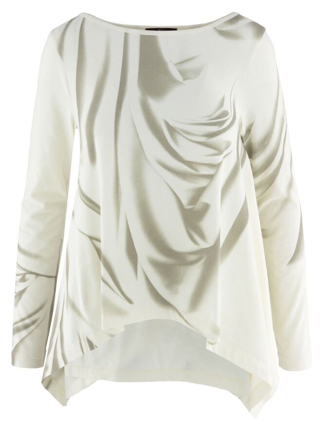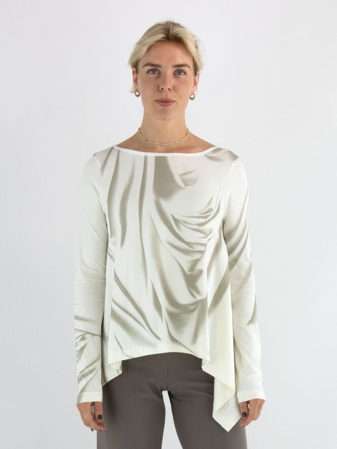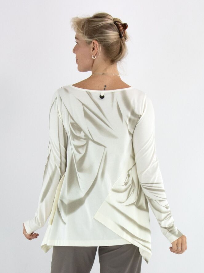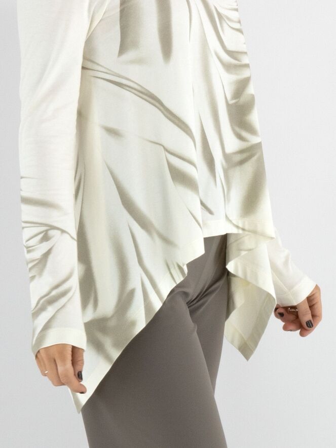 A-Linien-Shirt von High mit einem marmorierten Print in verschiedenen Taupetönen auf cremeweißem Hintergrund. Auf der linken Seite befindet sich ein Schlitz bis zur Armöffnung. Dieses Shirt sollte von Hand gewaschen werden.