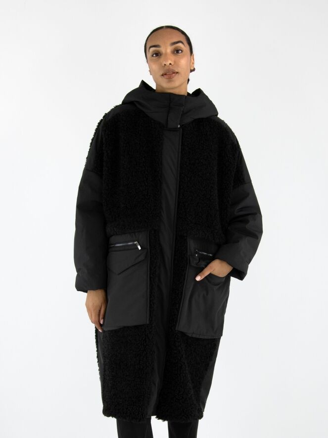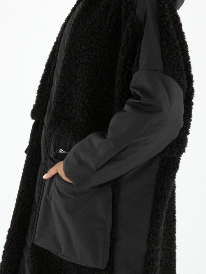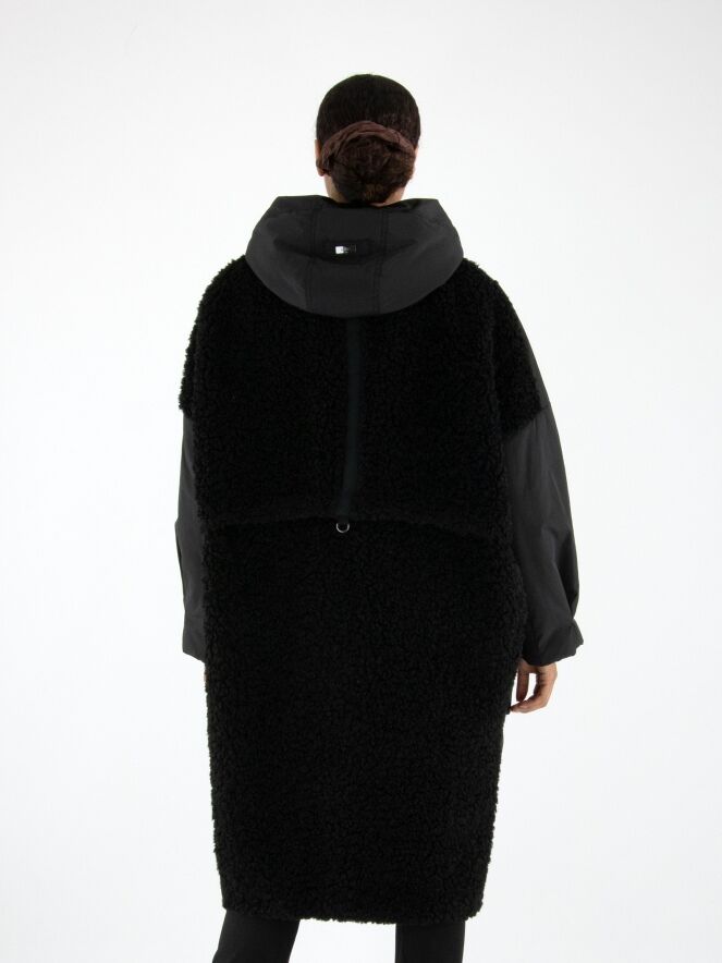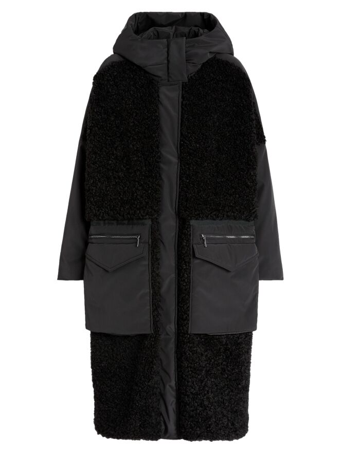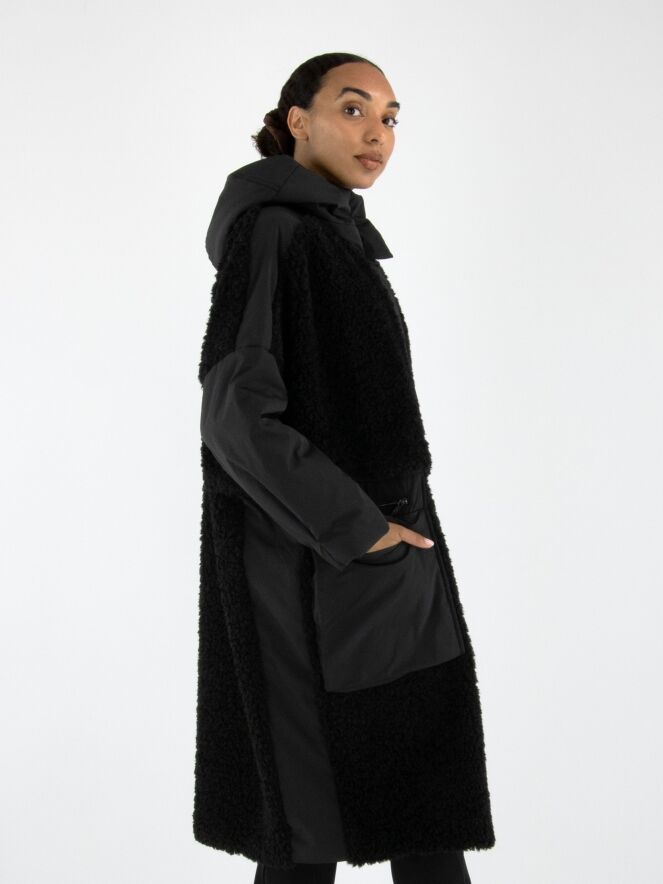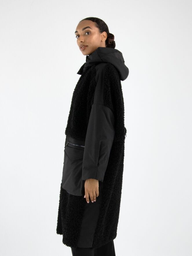 Ein Mantel von High in Schwarz. Die Vorderseite besteht bis unter die Brust aus Kunstfell mit Lockenstruktur, darunter aus Fallschirmstoff. Die Rückseite ist vollständig aus dem Kunstfell gefertigt. Die großen Vordertaschen sind mit Reißverschlüssen versehen. Der Mantel hat eine Kapuze und darf nicht gewaschen werden.