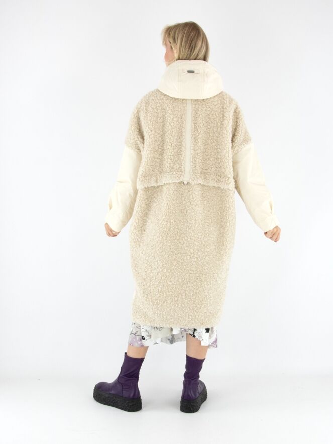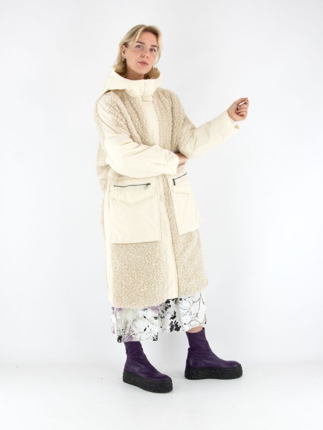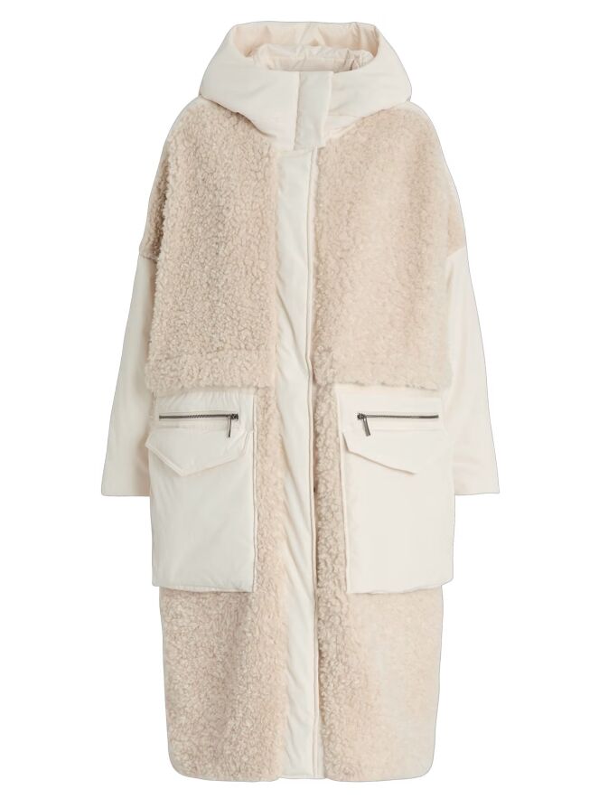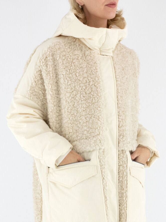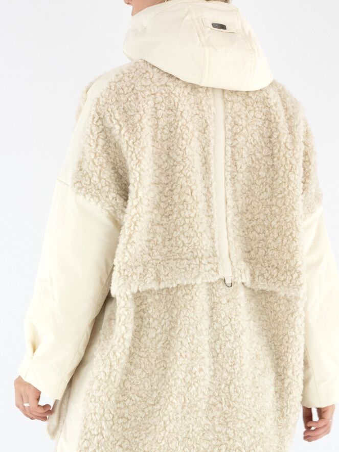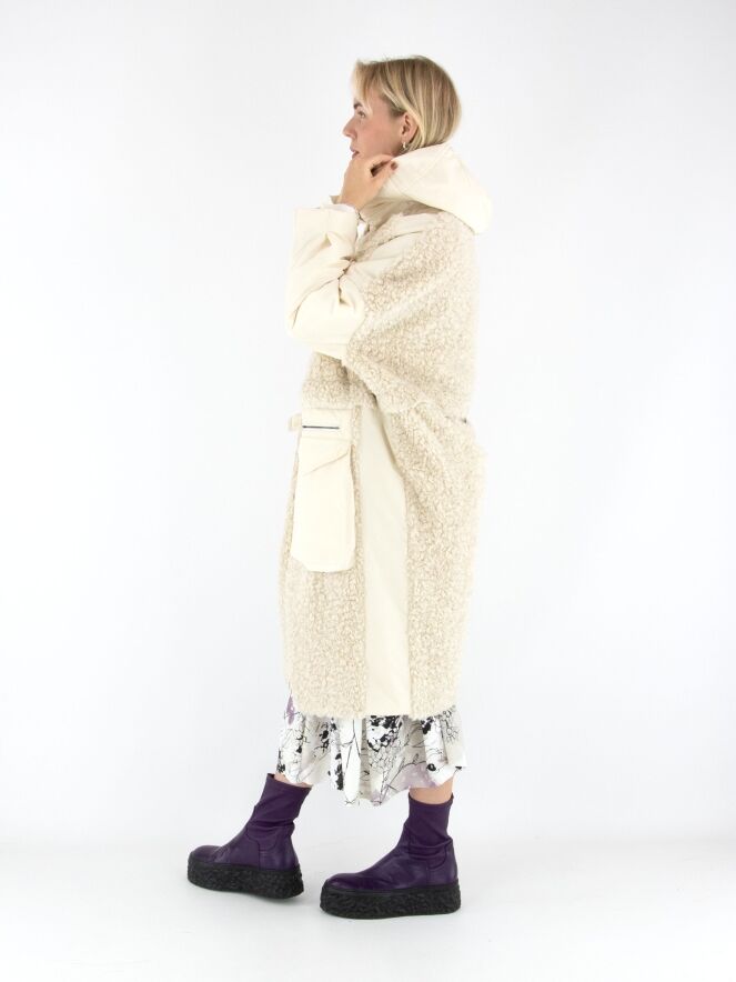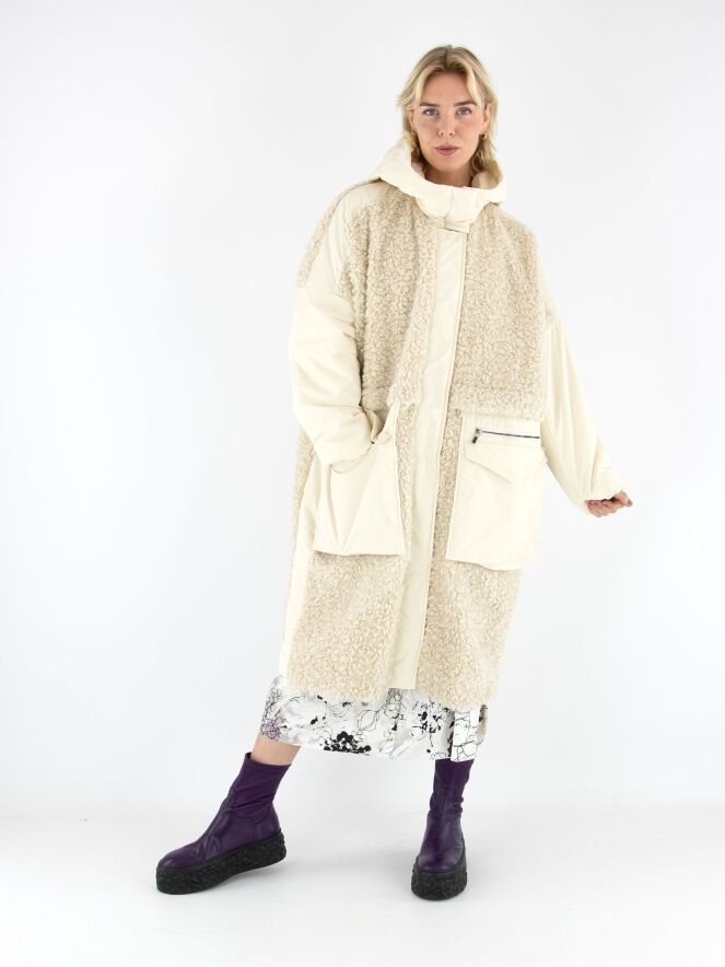 Ein Mantel von High in Cremeweiß. Die Vorderseite ist bis unter die Brust aus Kunstfell in Curly-Optik gearbeitet und geht darunter in Fallschirmstoff über. Die Rückseite besteht vollständig aus Kunstfell in Curly-Optik. Die großen Vordertaschen sind mit Reißverschlüssen versehen. Der Mantel hat eine Kapuze und darf nicht gewaschen werden.