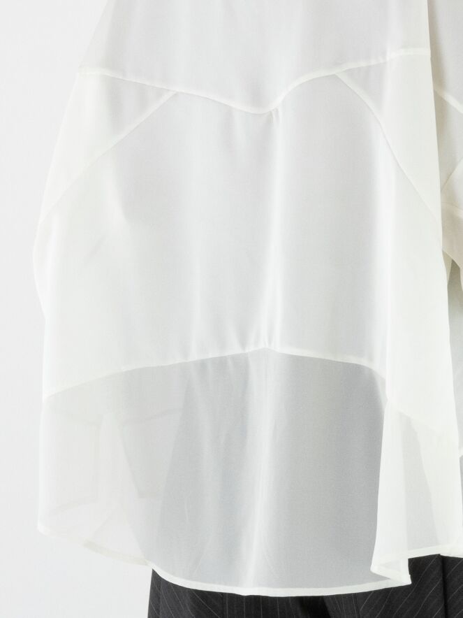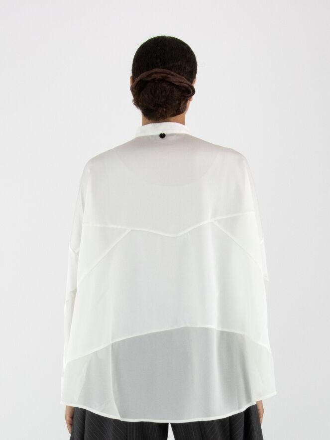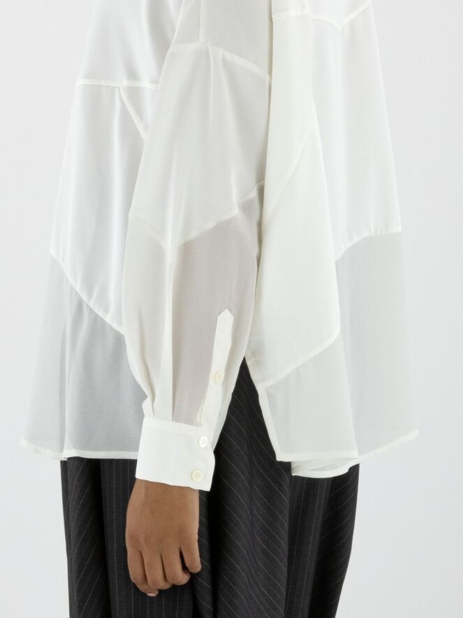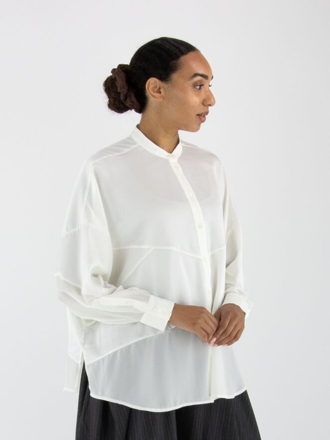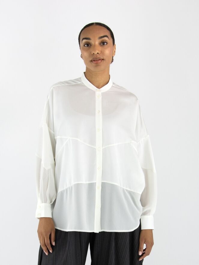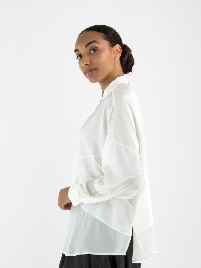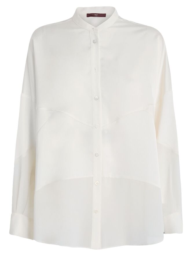 Bluse von High in Cremeweiß. Sie besteht aus einer Kombination aus matter Satinqualität und leicht transparenter, matter Stoffpartie. Diese Bluse kann bei 30 Grad gewaschen werden.