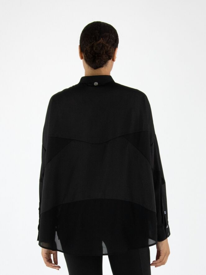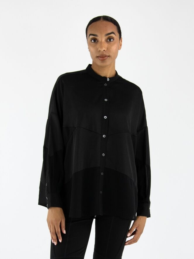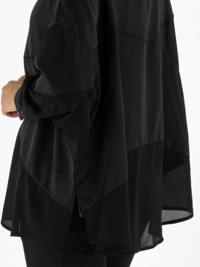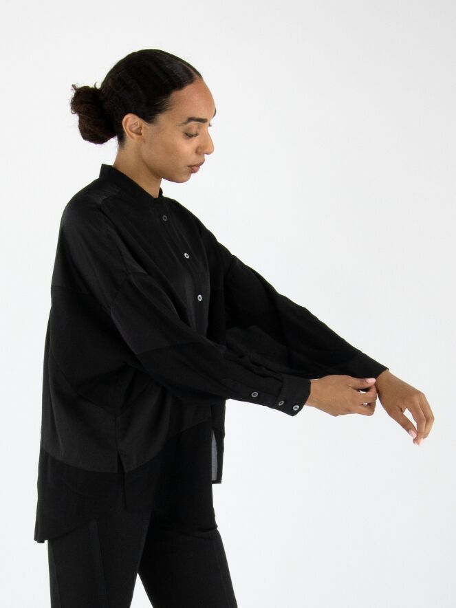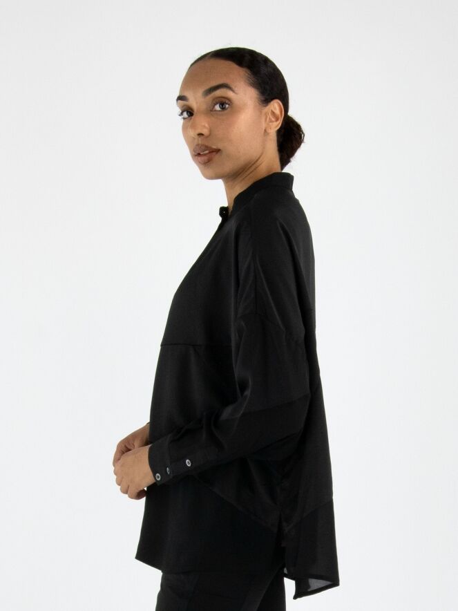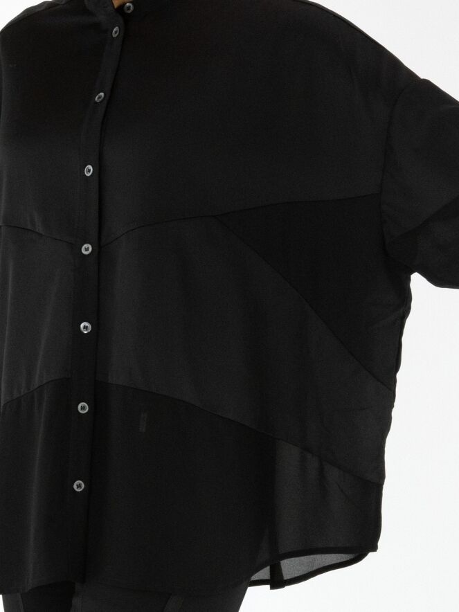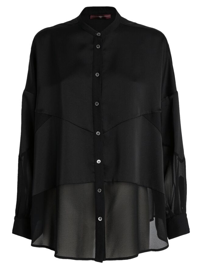Bluse von High in Schwarz. Die Bluse besteht aus einer Kombination von mattem Satinstoff und leicht transparentem, mattem Gewebe. Diese Bluse kann bei 30 Grad gewaschen werden.