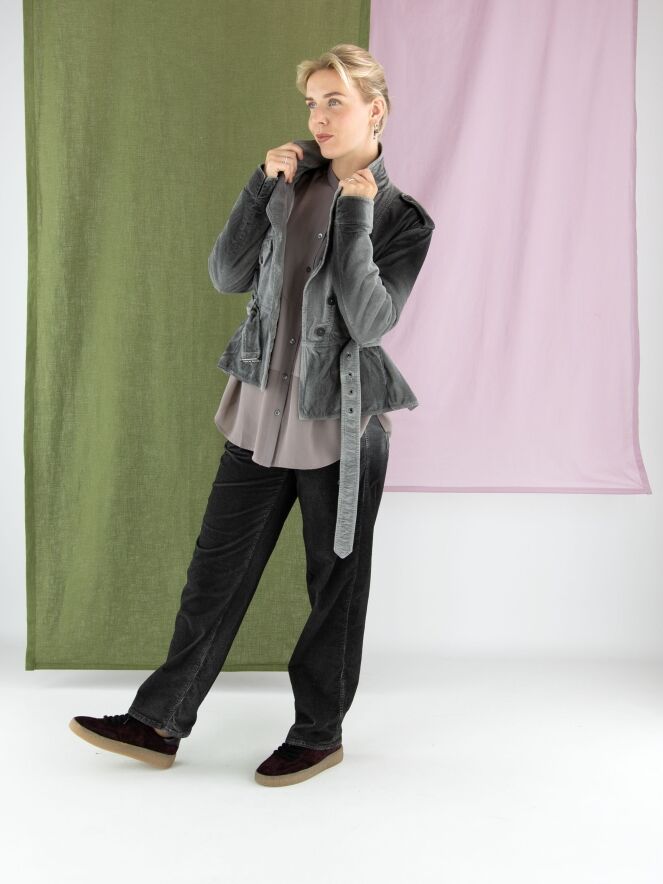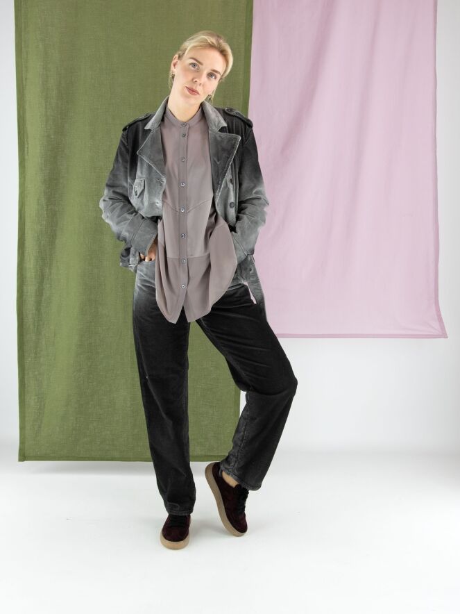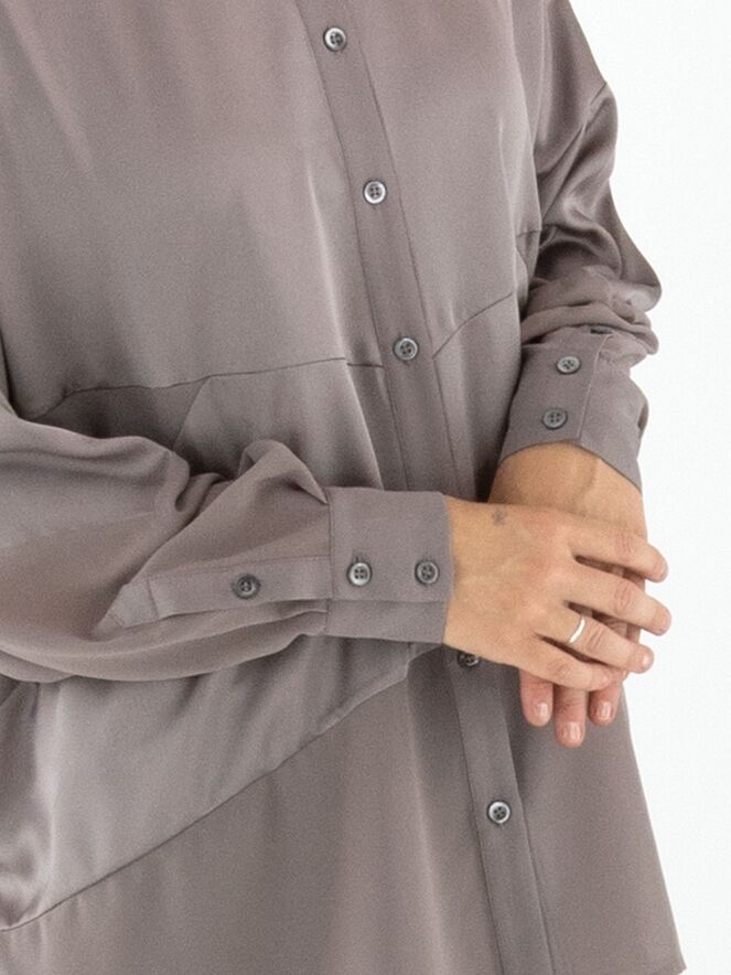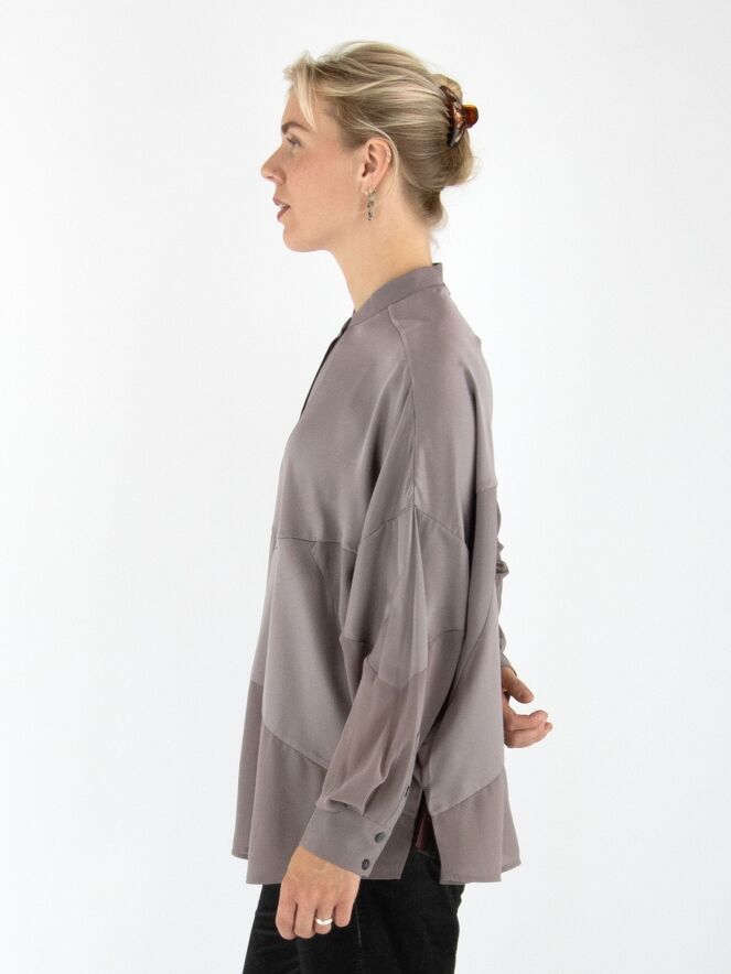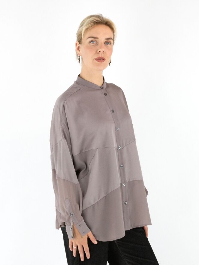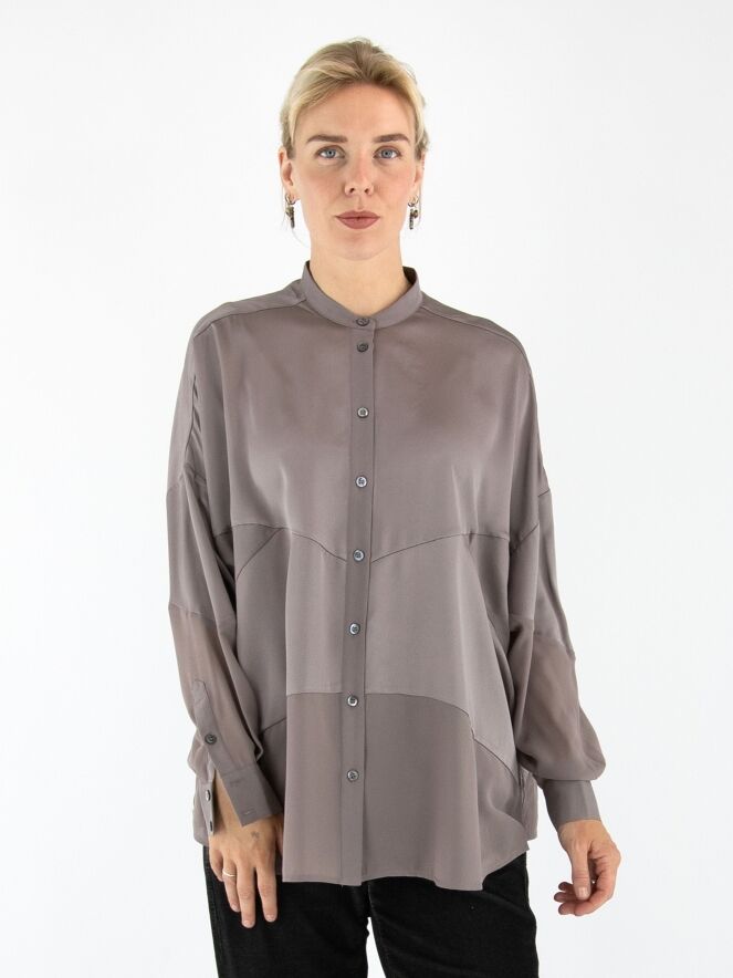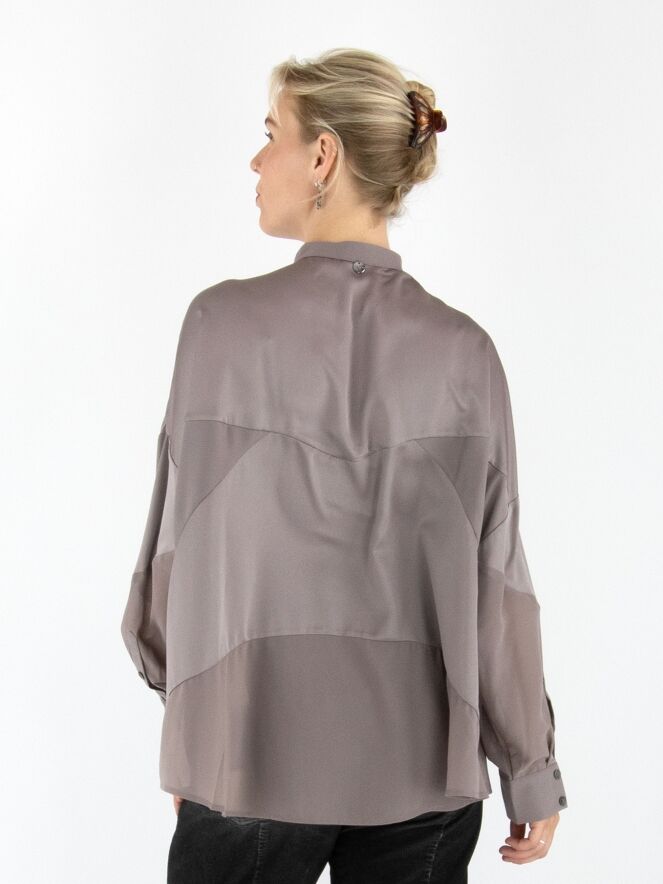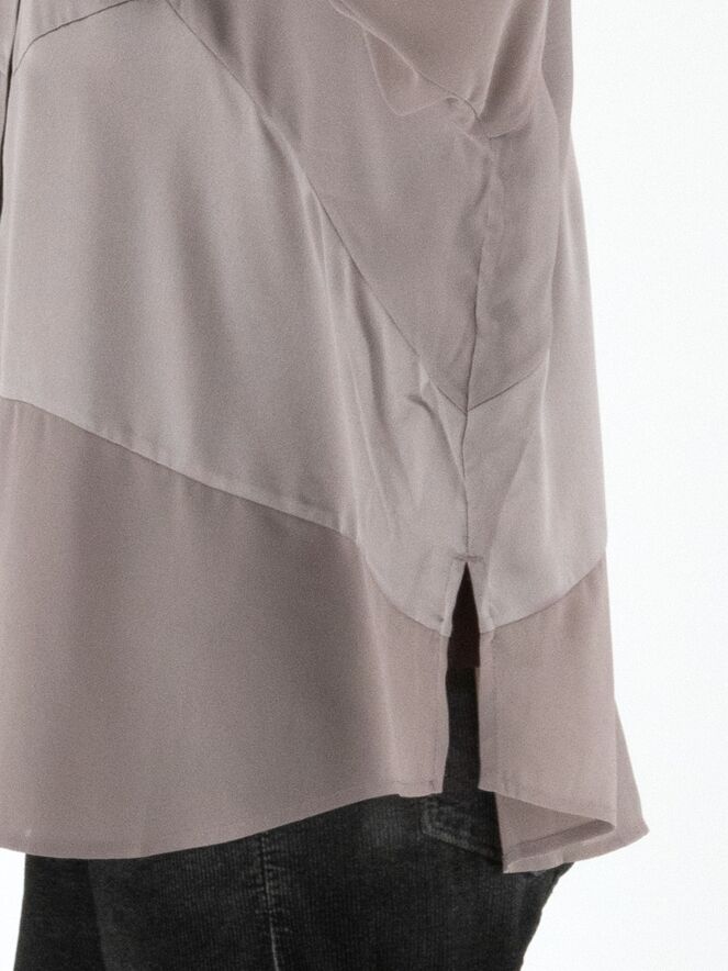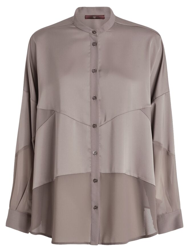 Bluse von High in Grau. Die Bluse kombiniert Partien aus mattem Satin mit leicht transparentem, mattem Stoff. Diese Bluse kann bei 30 Grad gewaschen werden.