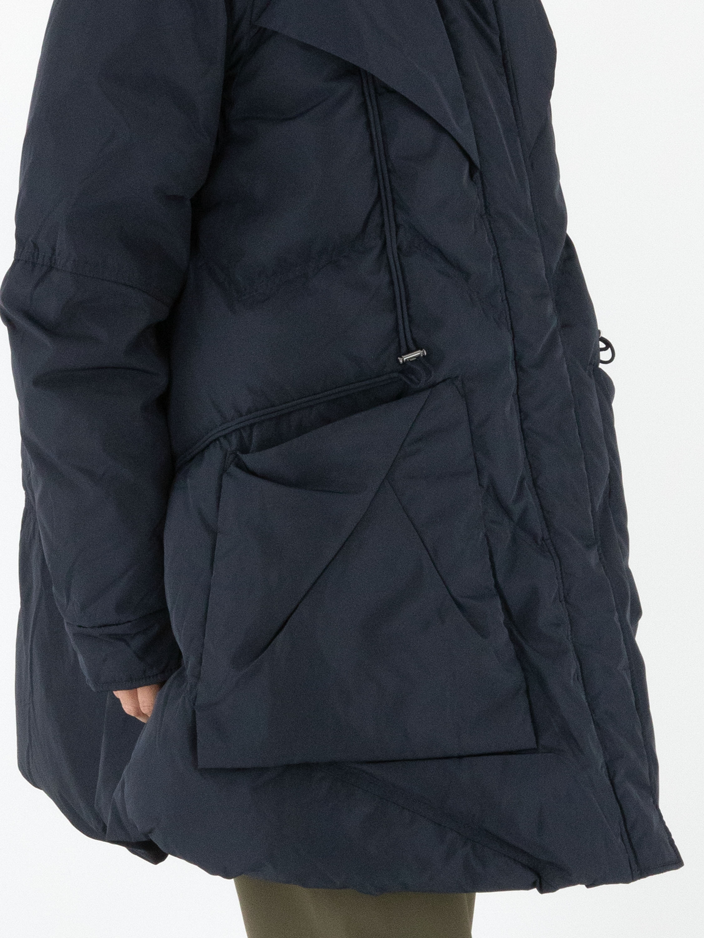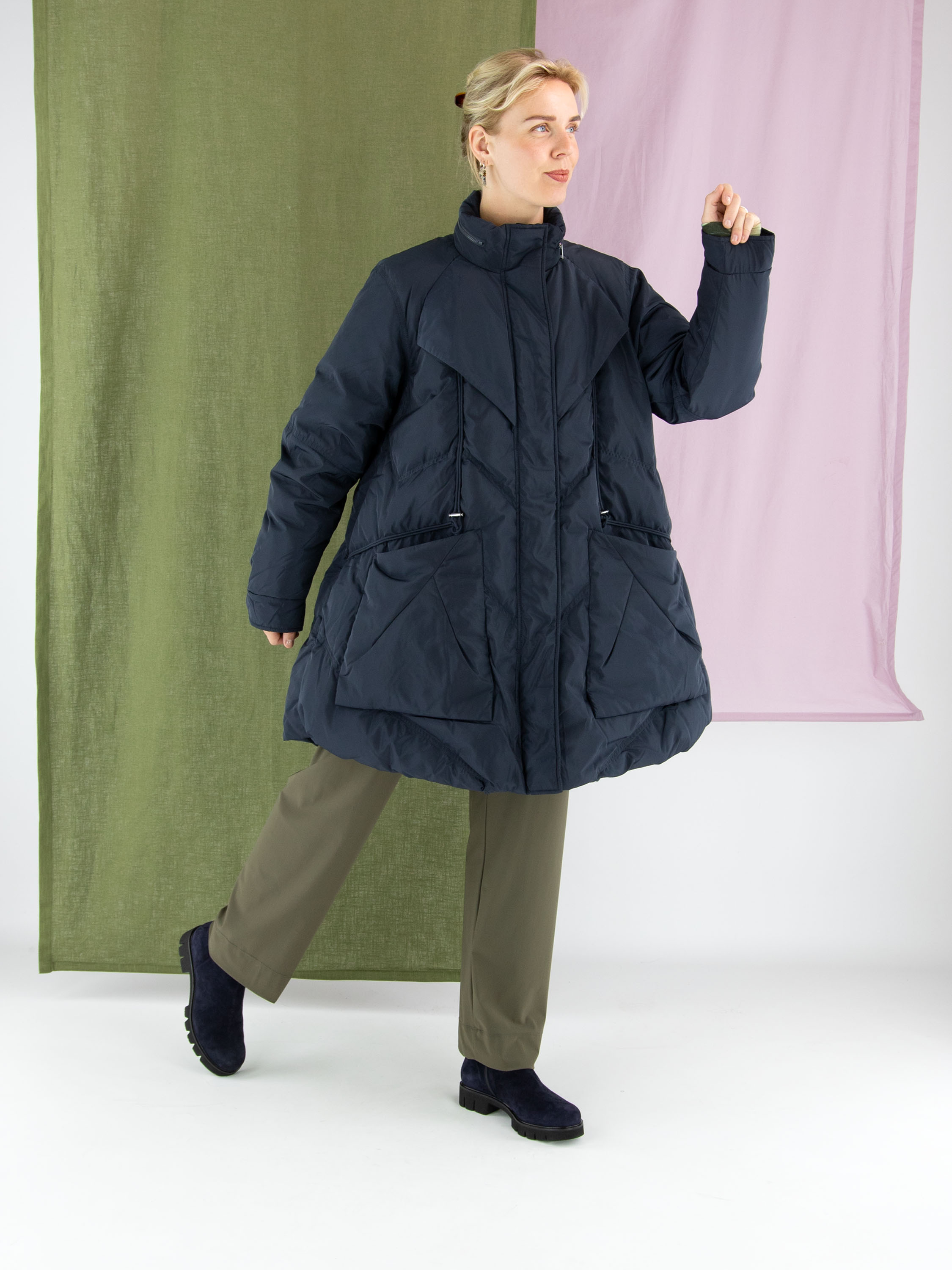 Halblanger Mantel von High in Marineblau. Im Kragen befindet sich ein Reißverschluss, hinter dem eine versteckte Kapuze verborgen ist. Über dem Reißverschluss verläuft eine zweite Knopfleiste mit Druckknöpfen. Der Mantel verfügt über großzügige Taschen und ist mit mehreren diagonalen Ziernähten gearbeitet. Dieser Mantel kann bei 30 Grad gewaschen werden.