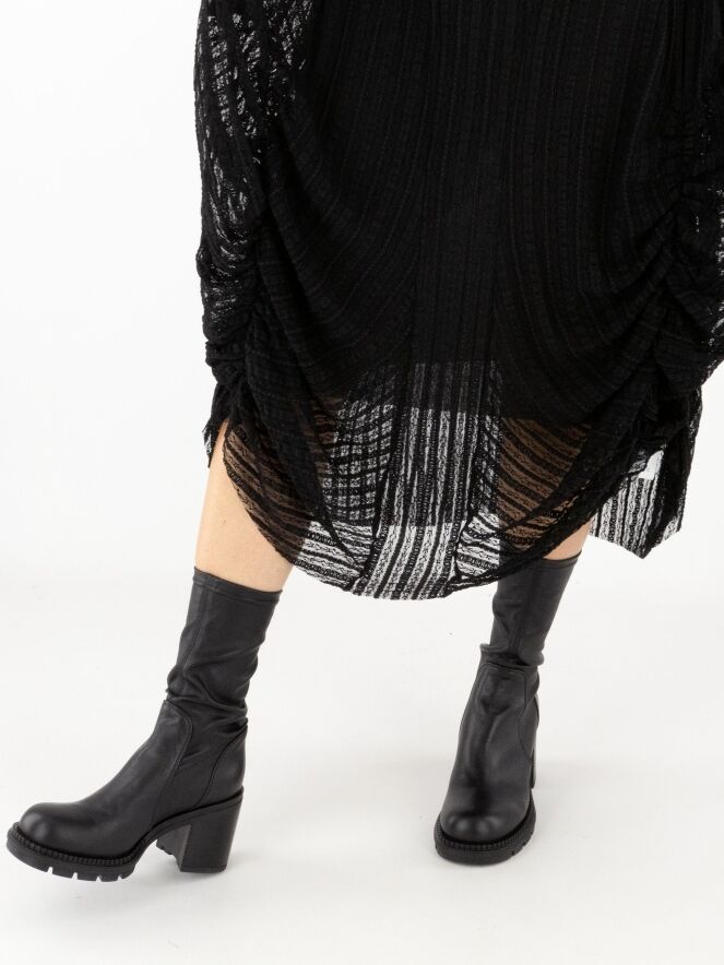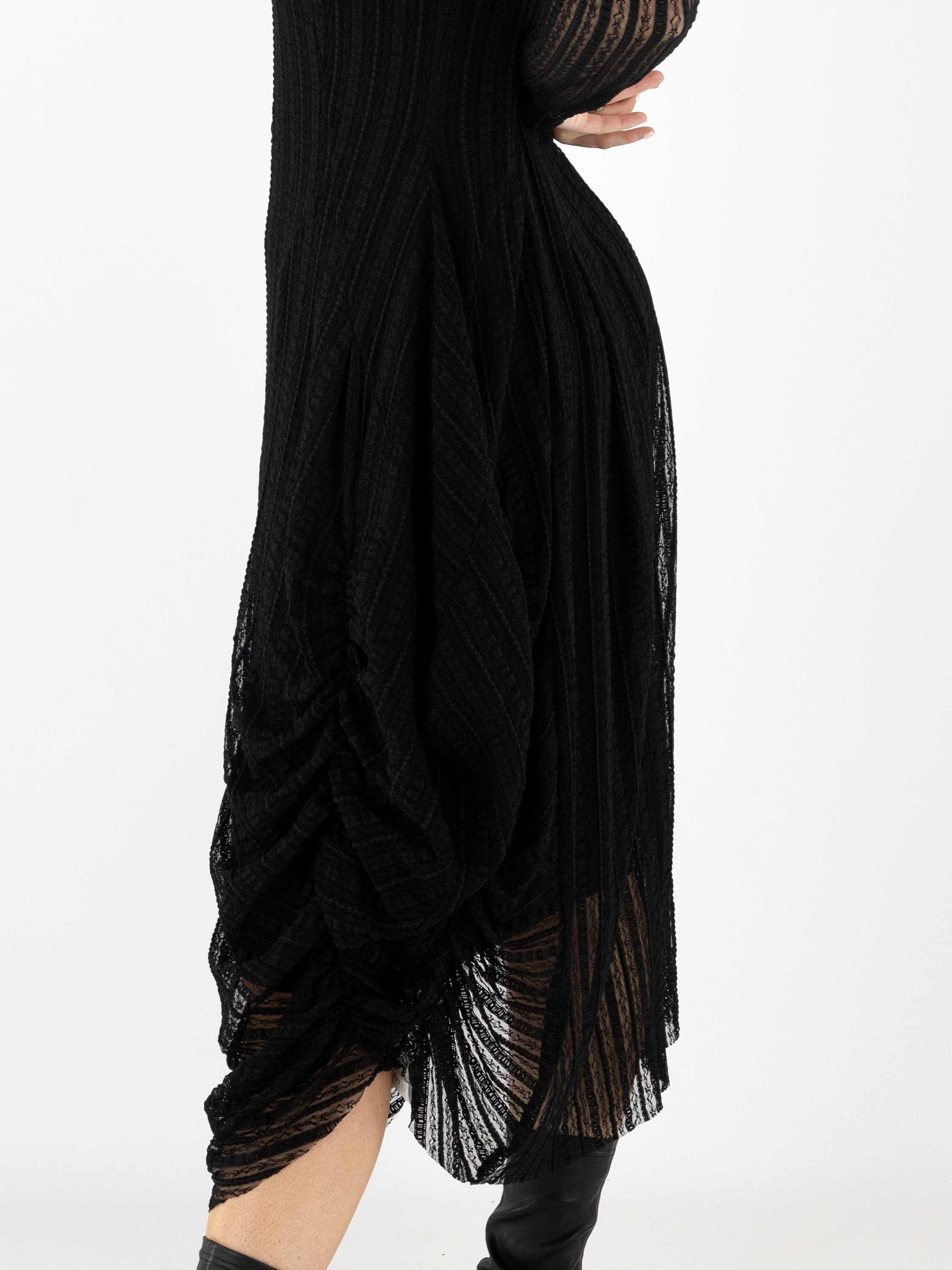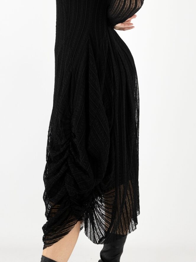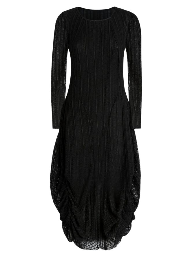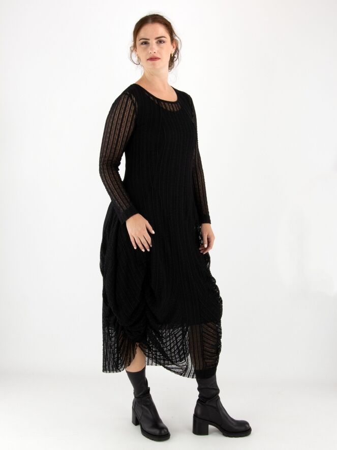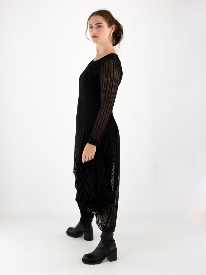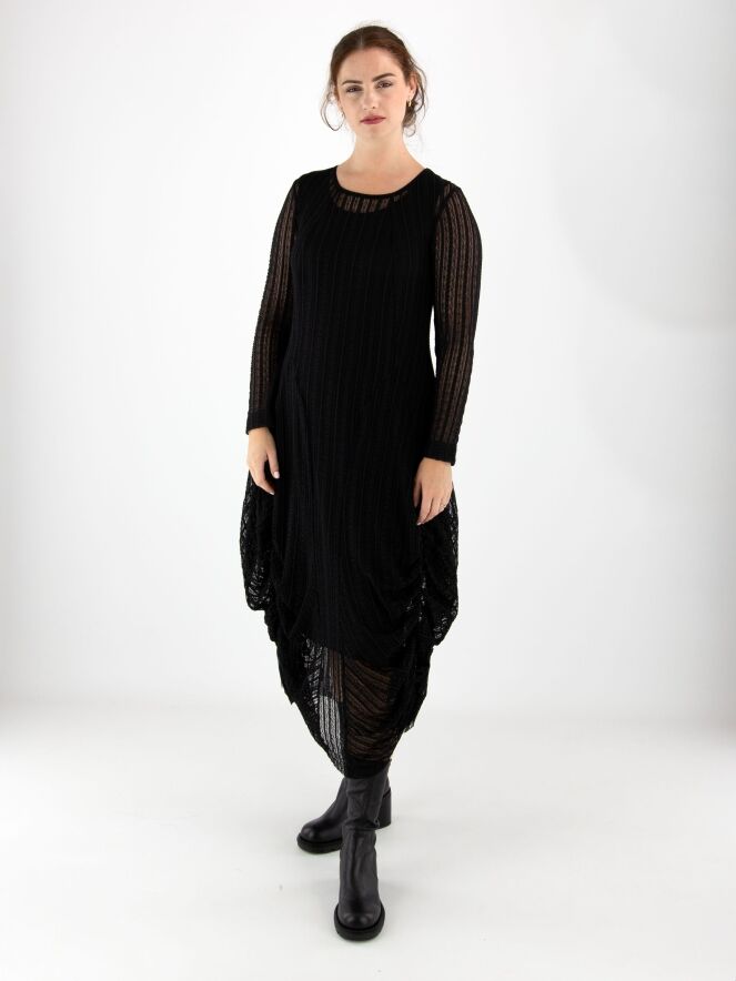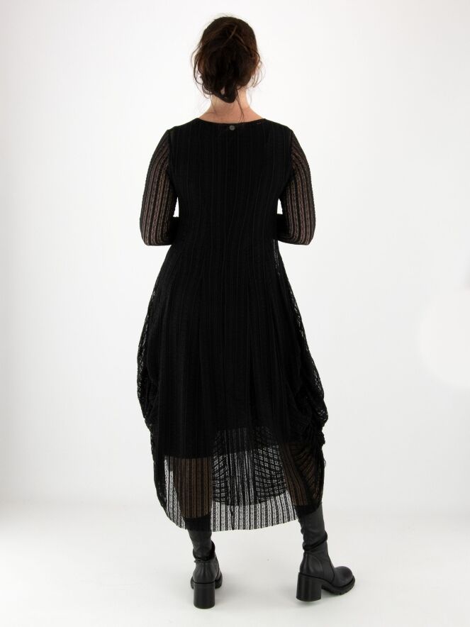 Kleid von High in Schwarz. Das Unterkleid besteht aus einem einfarbigen schwarzen Stoff, darüber liegt eine transparente, teilweise gesmokte Lage, die ab der Taille eine Ballonform bildet. Das Kleid hat lange Ärmel und einen runden Ausschnitt. Dieses Kleid sollte von Hand gewaschen werden.