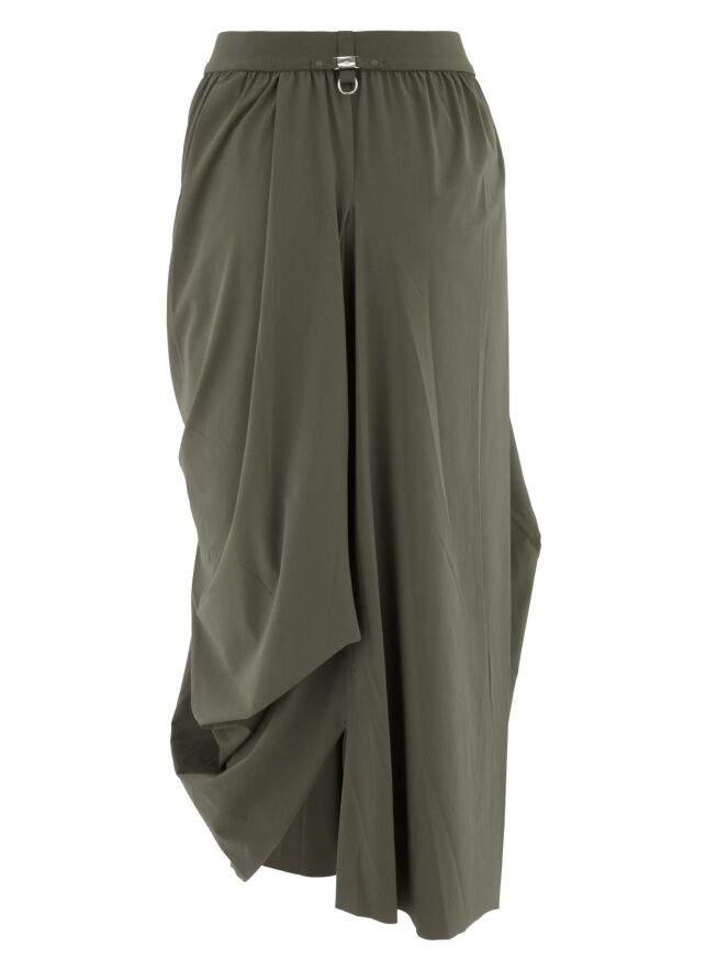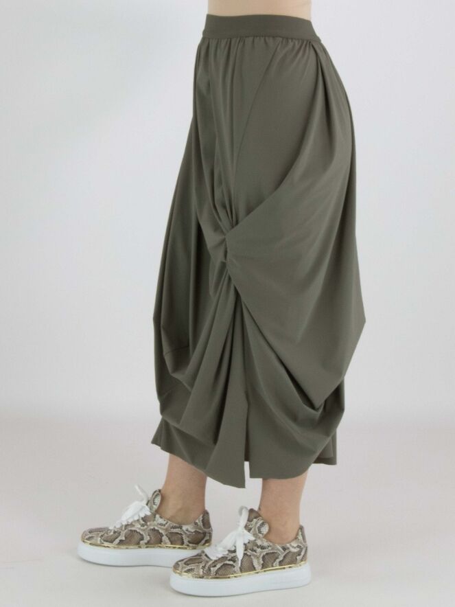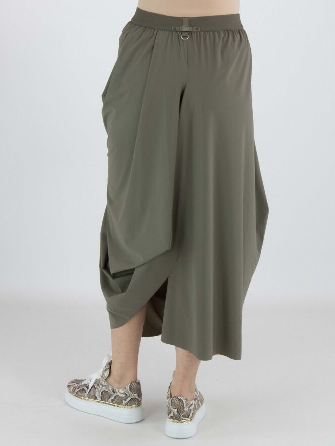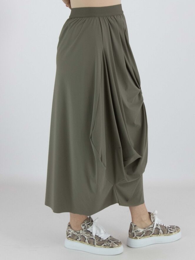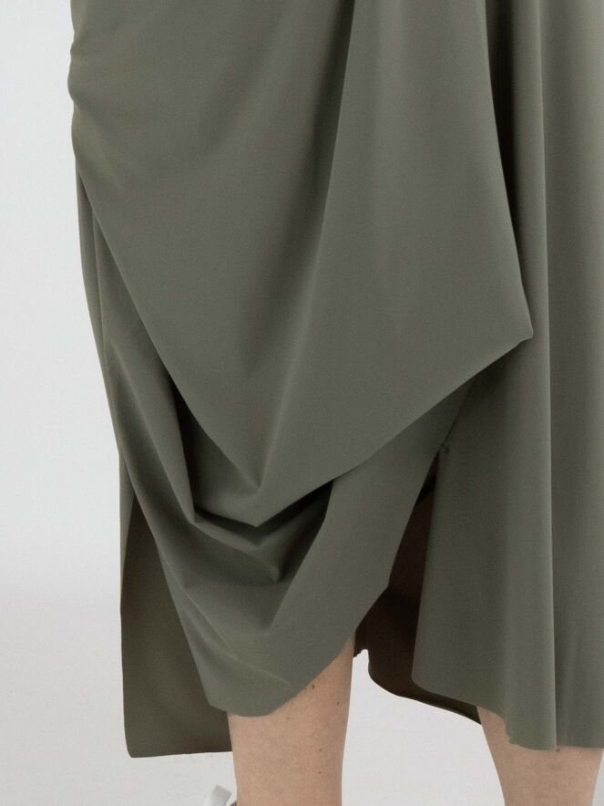 Ein Rock von High Tech in Olivgrün. In der Taille befindet sich ein elastischer Bund. Von der Taillennaht auf der rechten Seite verlaufen mehrere Falten, die nach unten einen Drapiereffekt erzeugen. Auf Kniehöhe befindet sich auf der linken Seite eine Raffvorrichtung, die einen Falteneffekt entstehen lässt. Dieser Rock kann bei 30 Grad gewaschen werden.