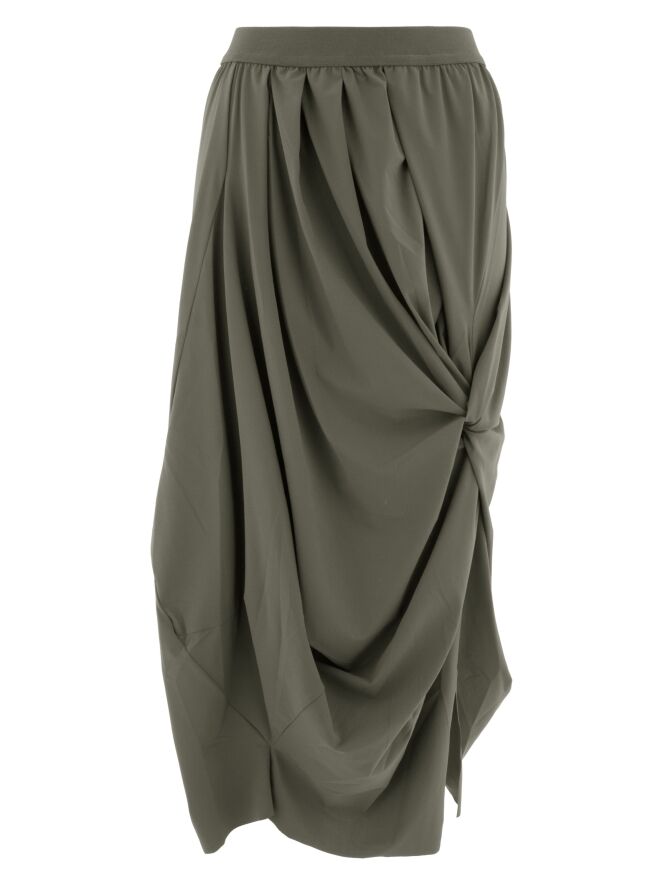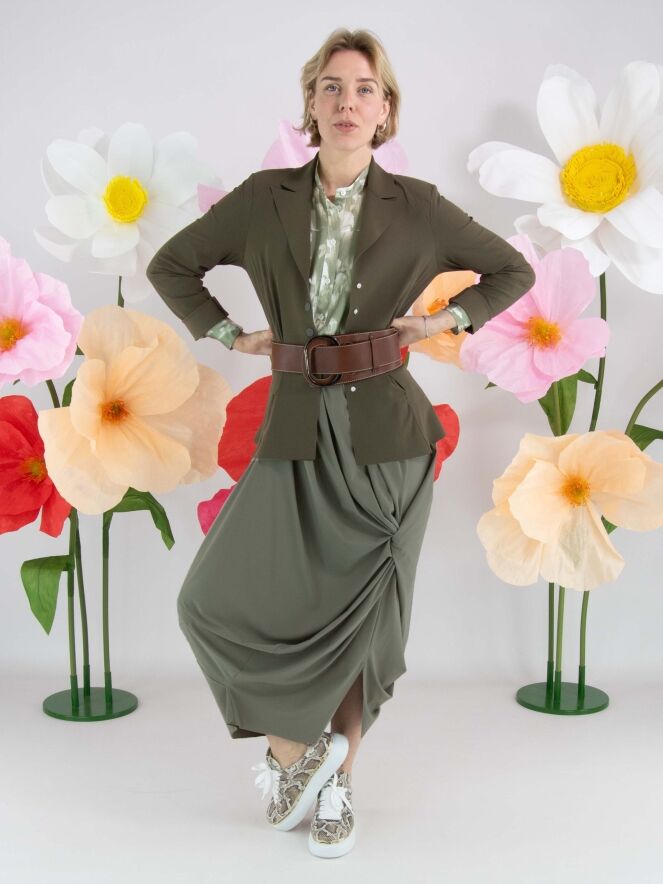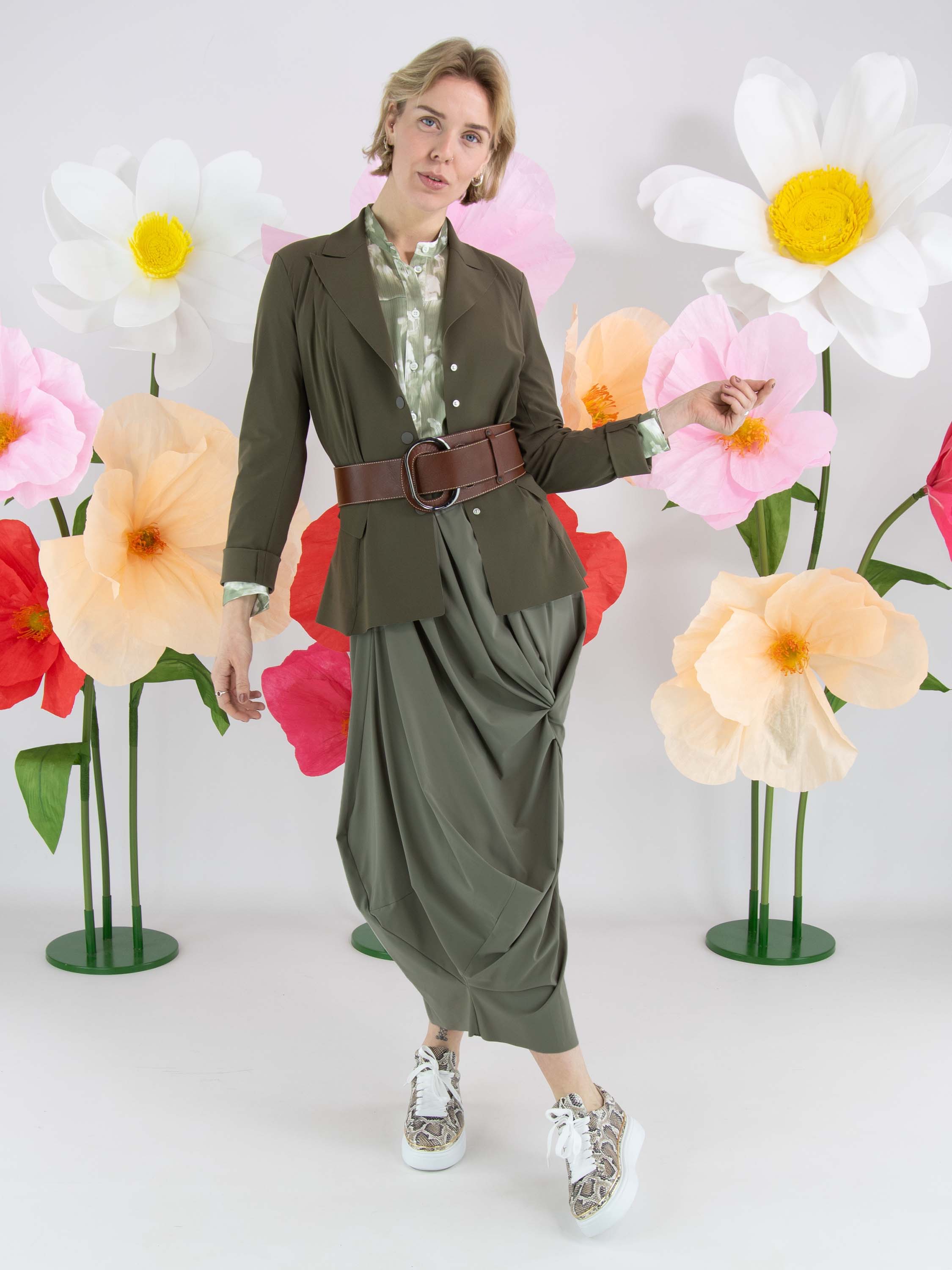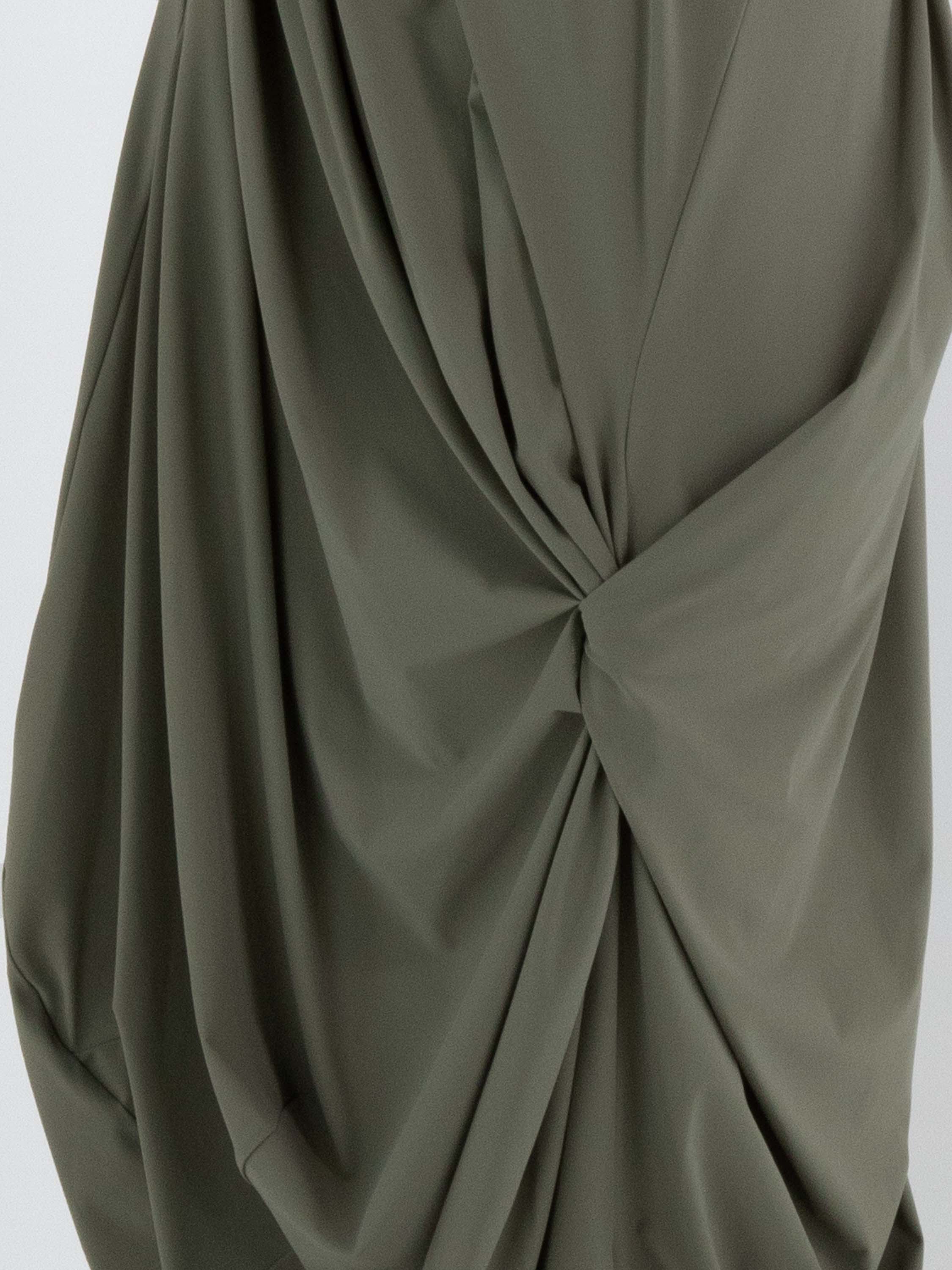 Ein Rock von High Tech in Olivgrün. In der Taille befindet sich ein elastischer Bund. Von der Taillennaht auf der rechten Seite verlaufen mehrere Falten, die nach unten einen Drapiereffekt erzeugen. Auf Kniehöhe befindet sich auf der linken Seite eine Raffvorrichtung, die einen Falteneffekt entstehen lässt. Dieser Rock kann bei 30 Grad gewaschen werden.