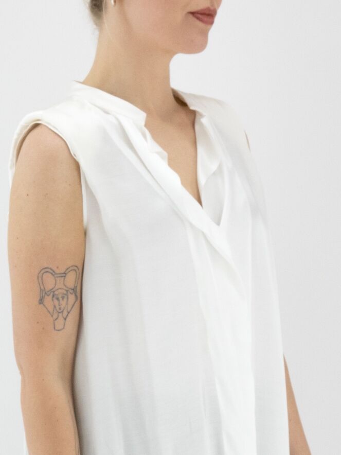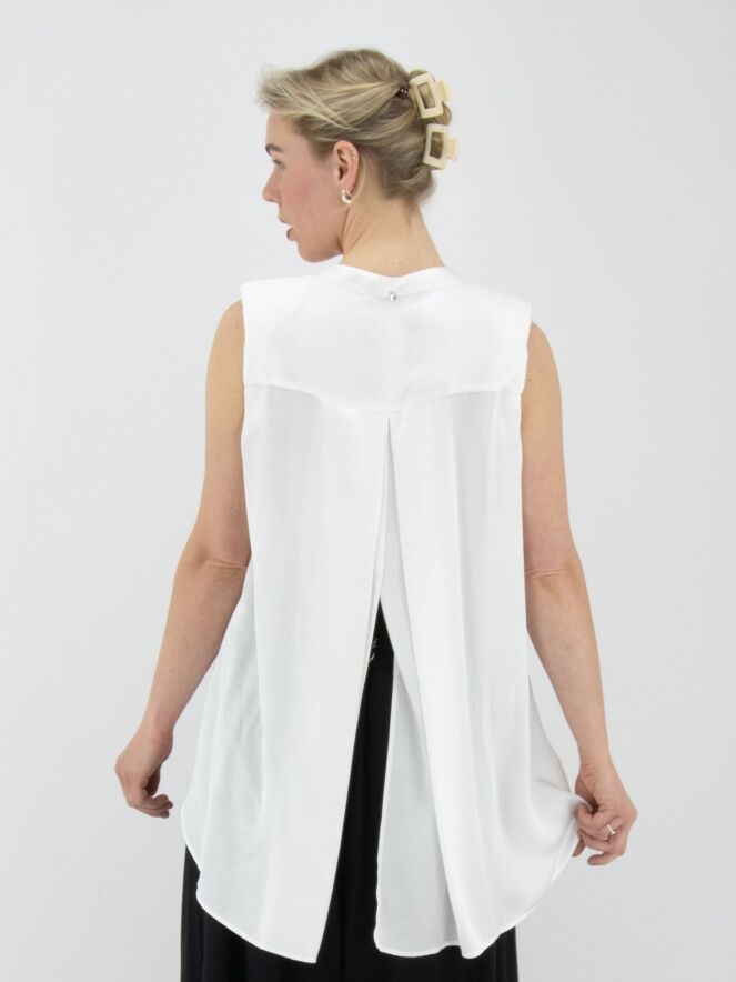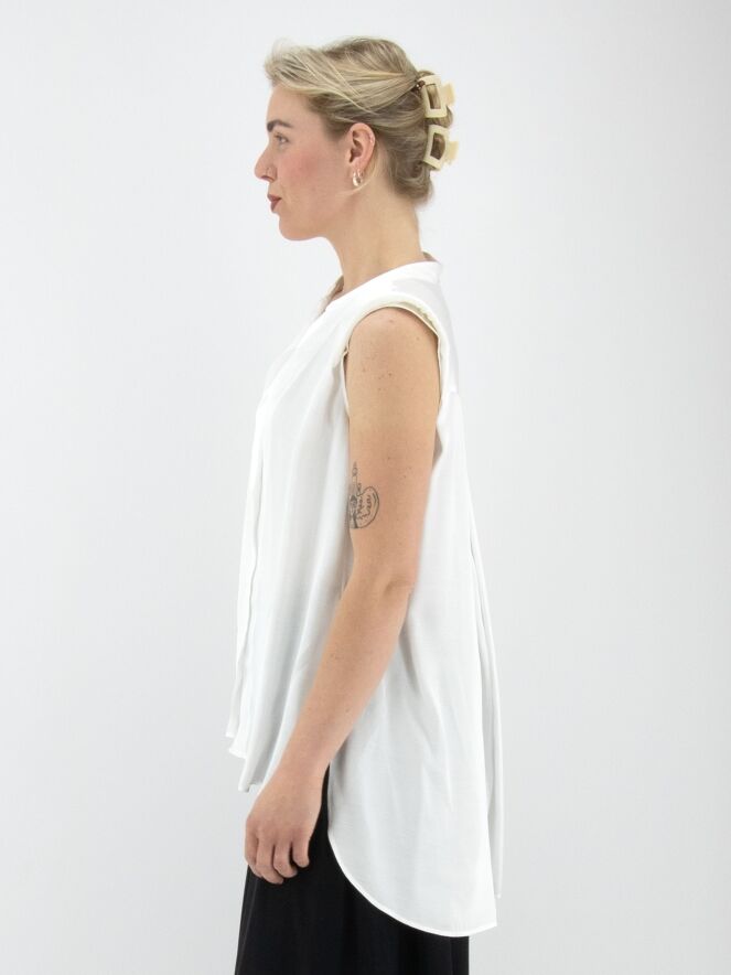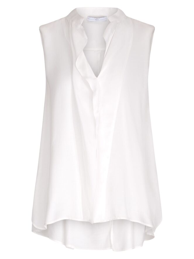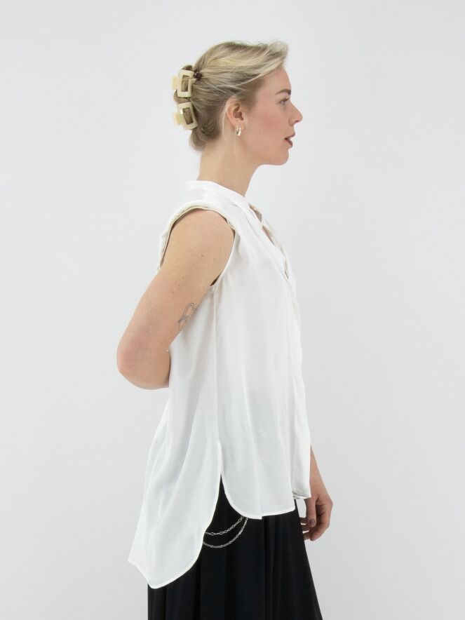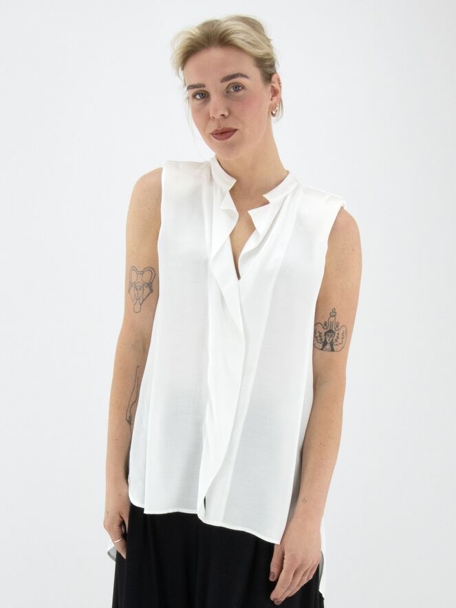 Eine lange, matt satinierte Top von High in Cremeweiß. Von der Spitze des V-Ausschnitts verläuft ein Volant nach unten. Auf der Rückseite ist eine Falte eingearbeitet, die von der mittleren Naht zwischen den Schulterblättern ausgeht. Die Schultern sind mit Polstern verstärkt. Dieses Top darf nicht gewaschen werden.