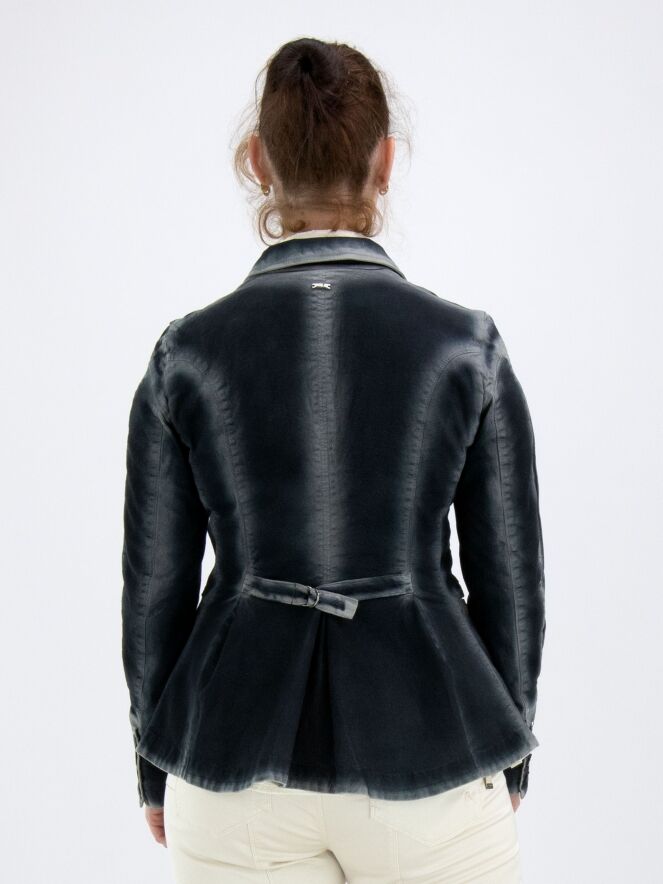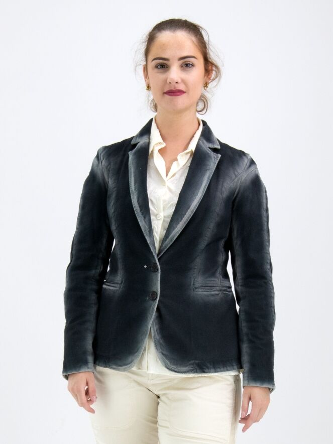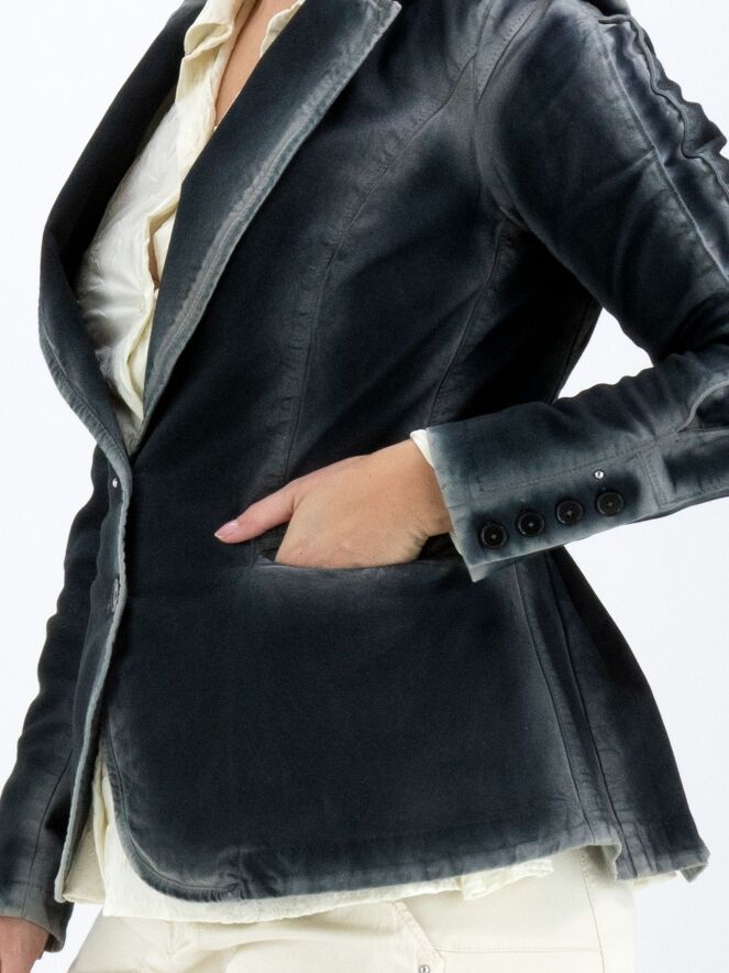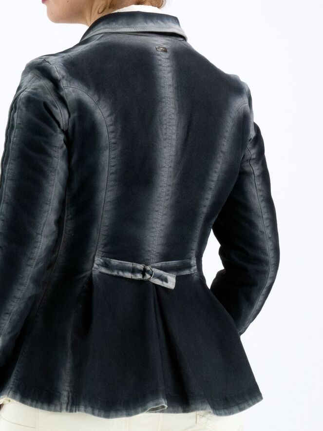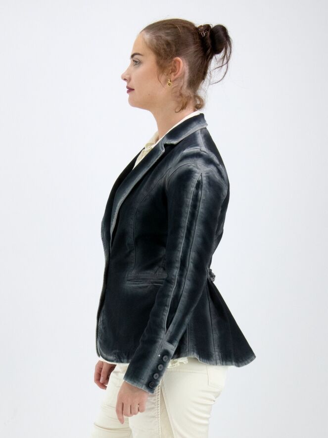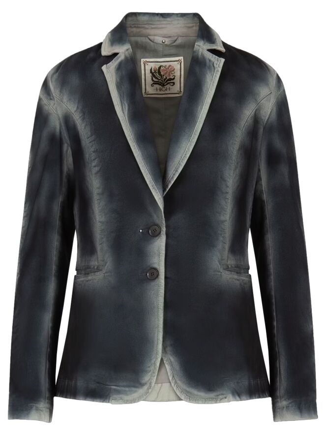Ein Blazer von High in blauer Farbe. Entlang der Nähte und Kanten verblasst die Farbe zu einem gebleichten Blau, was einen Dégradé-Effekt erzeugt. Der Blazer hat eine Zweiknopf-Verschluss und ist gefüttert. Am Ende der langen Ärmel befinden sich Manschetten mit vier Knöpfen und einem dekorativen silberfarbenen Stud. Dieser Blazer darf nicht gewaschen werden.