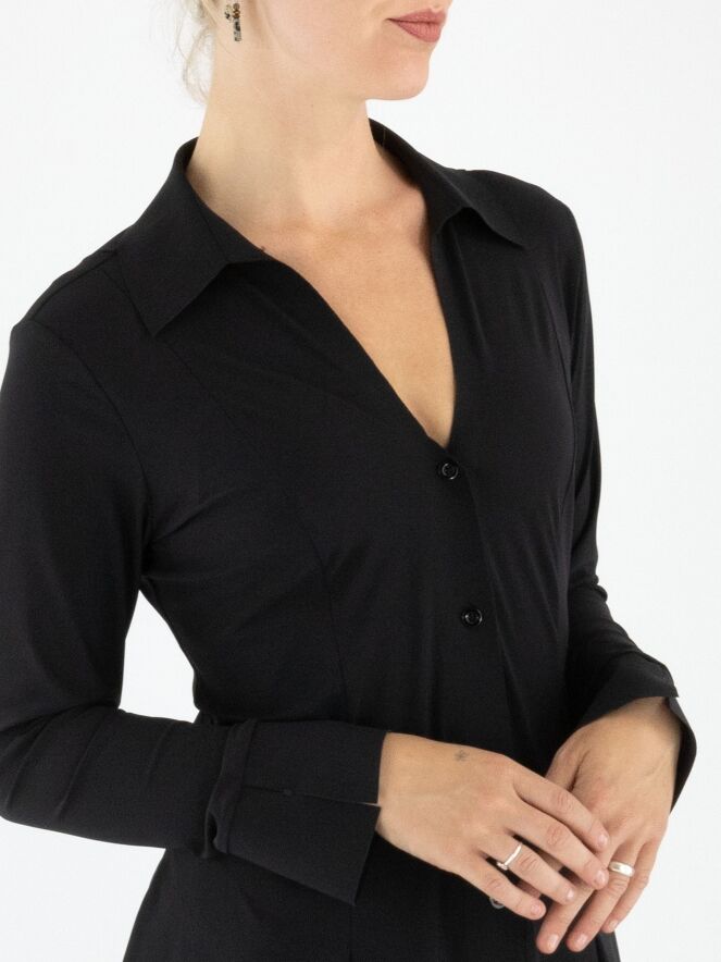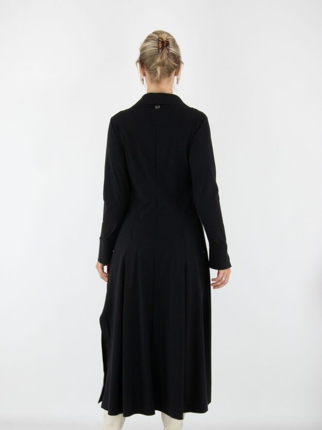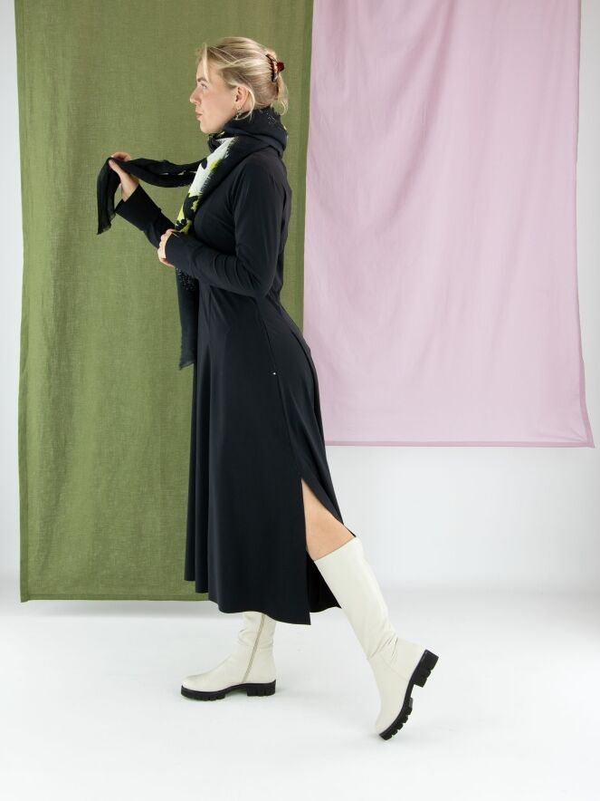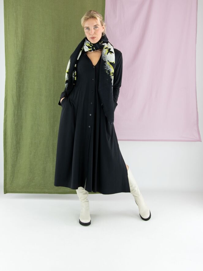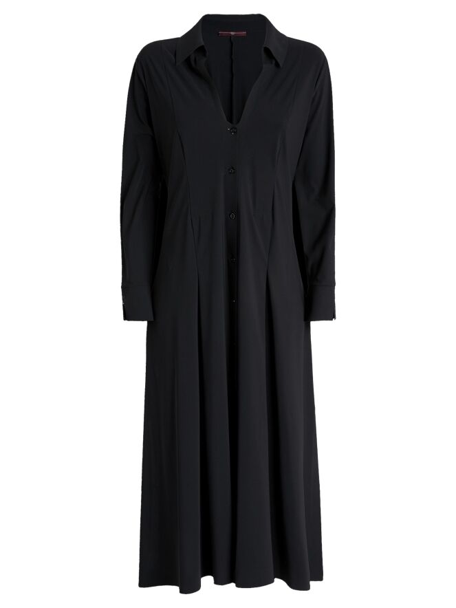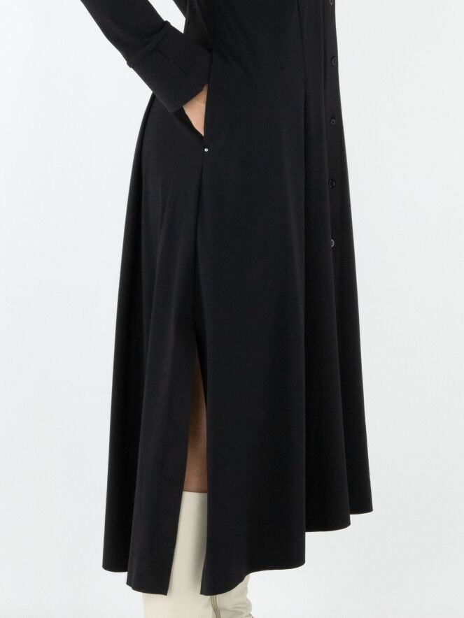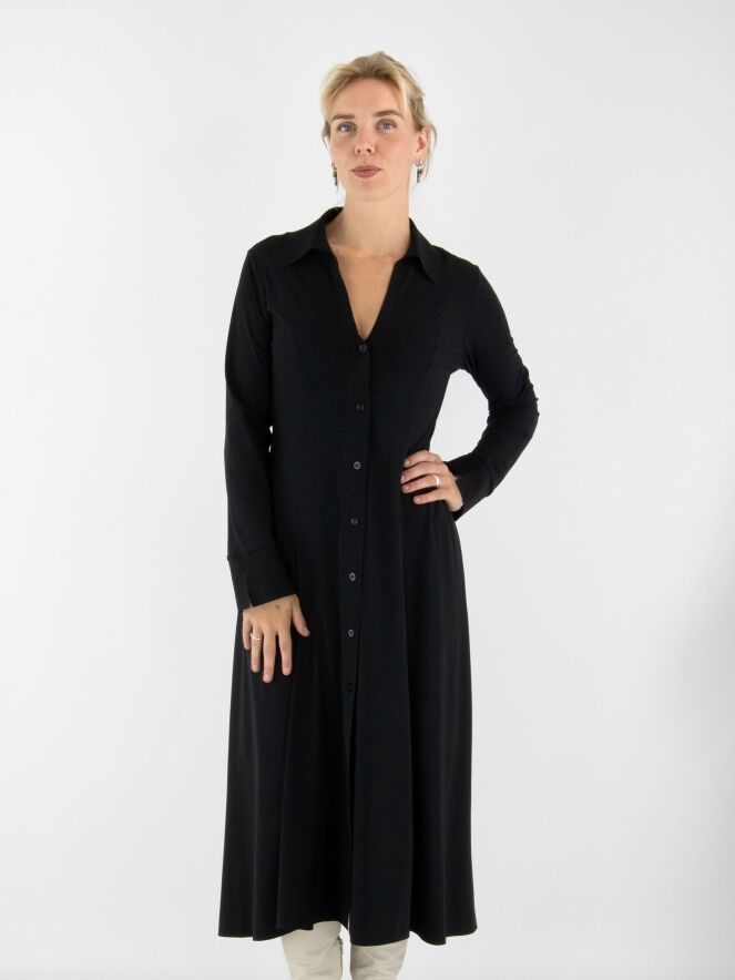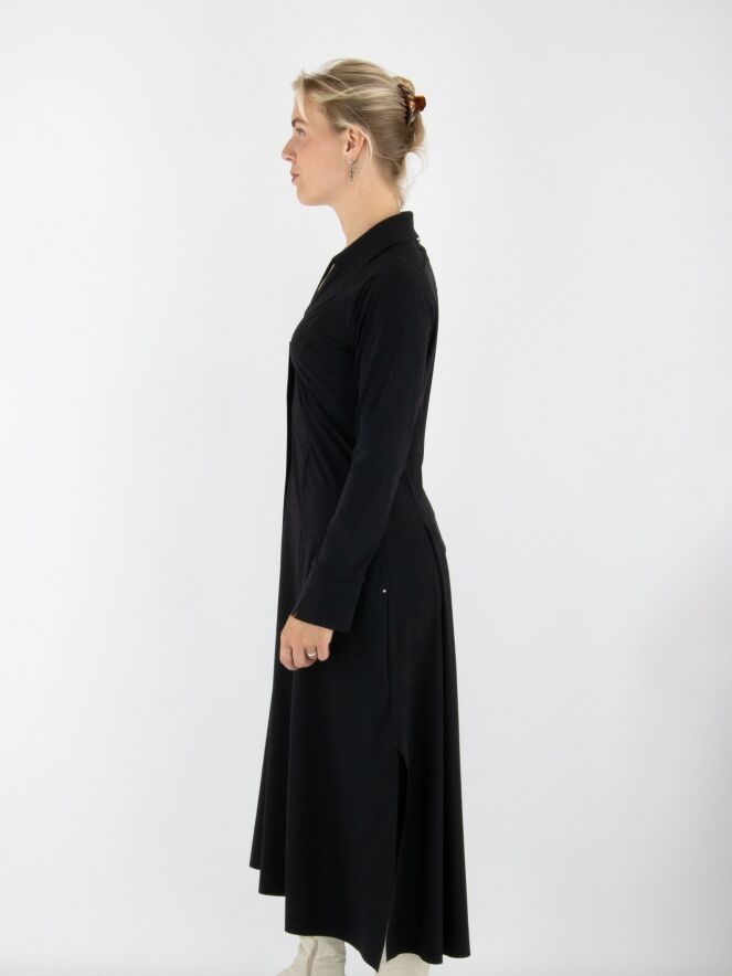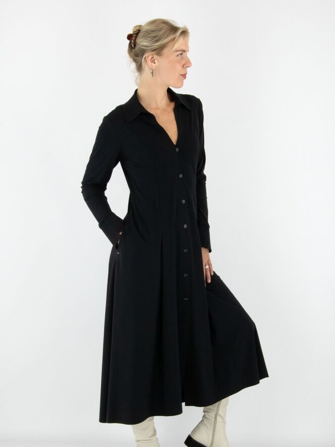 Ein durchgeknöpftes Kleid von High in Schwarz. Das Kleid ist ab der Taille ausgestellt und hat seitliche Eingrifftaschen auf Taillenhöhe. Die Manschetten an den langen Ärmeln sind mit einem kleinen Schlitz versehen. Dieses Kleid sollte von Hand gewaschen werden.