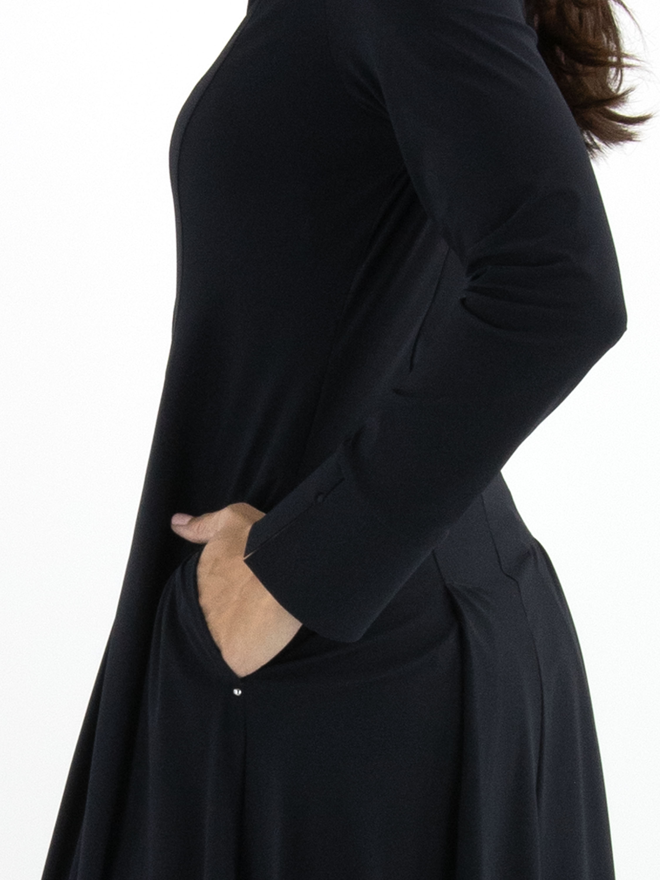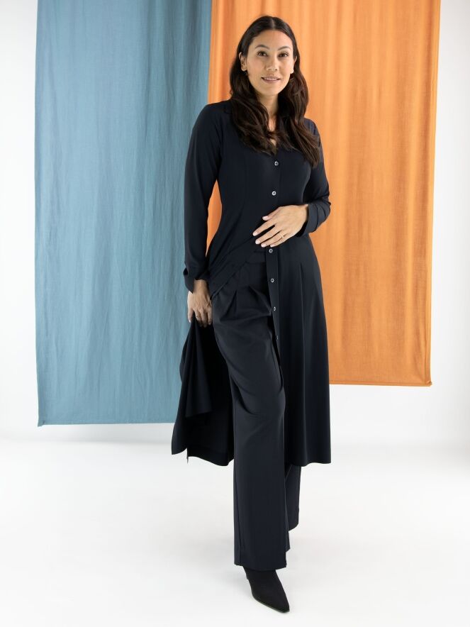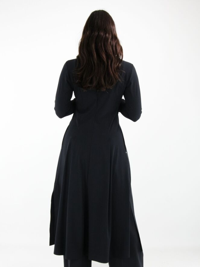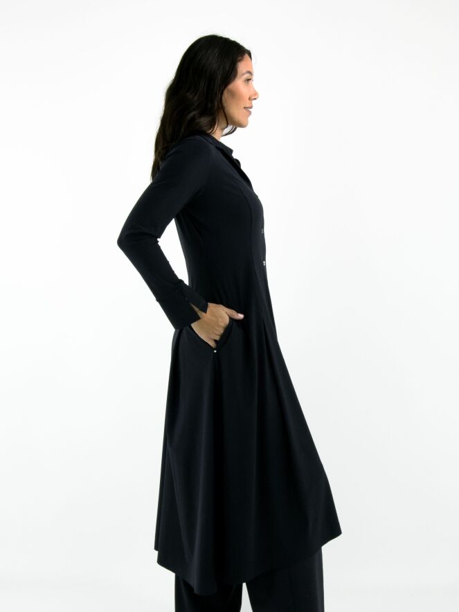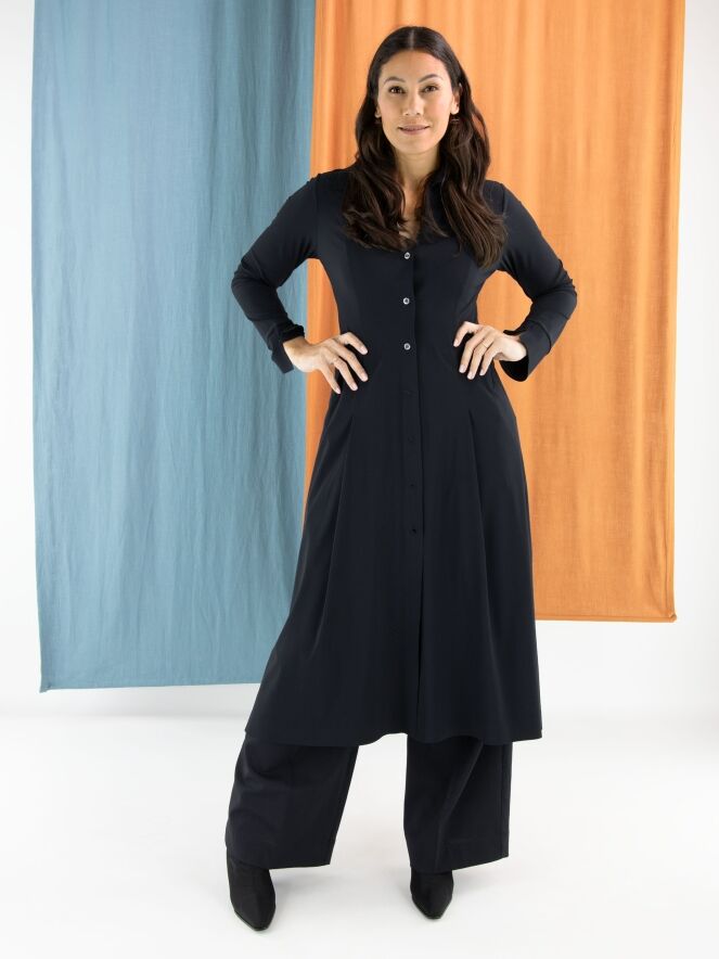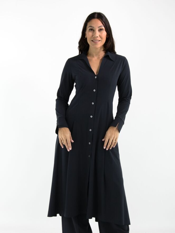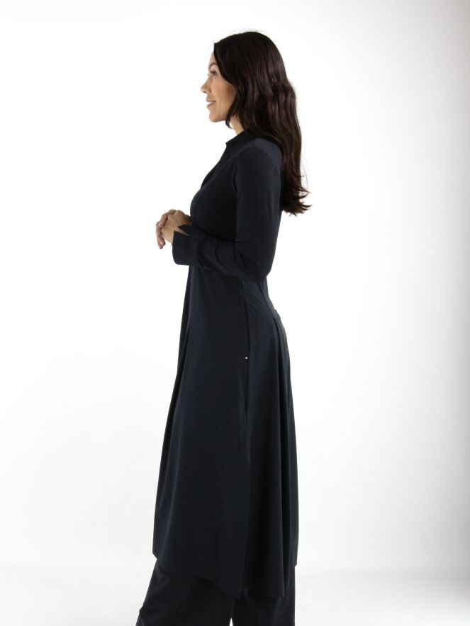 Ein durchgeknöpftes Kleid von High in Marineblau. Das Kleid ist ab der Taille ausgestellt und verfügt über Eingrifftaschen auf Taillenhöhe. Die Manschetten an den langen Ärmeln sind mit einem kleinen Schlitz versehen. Dieses Kleid sollte von Hand gewaschen werden.
