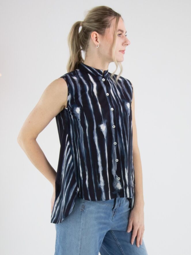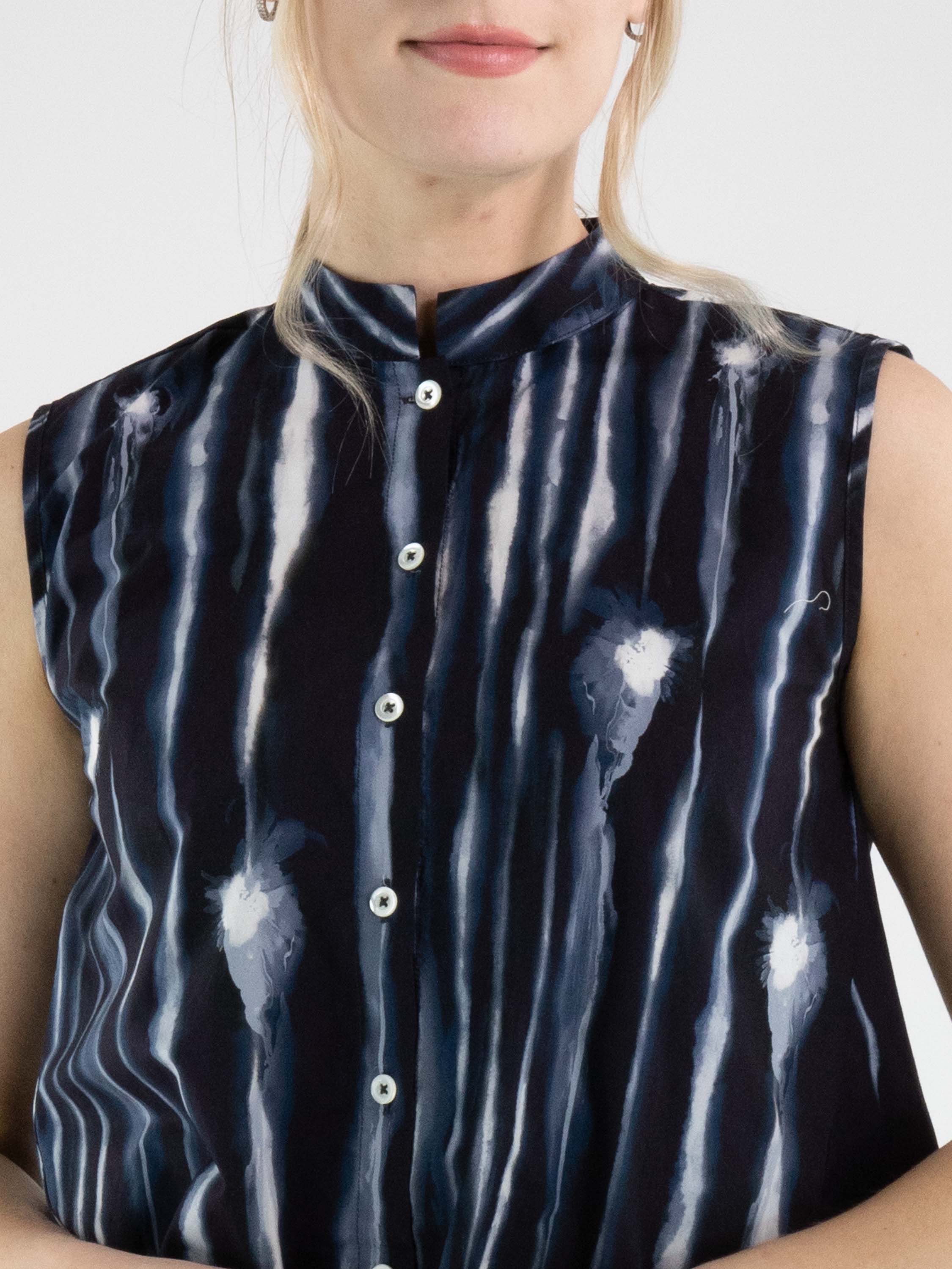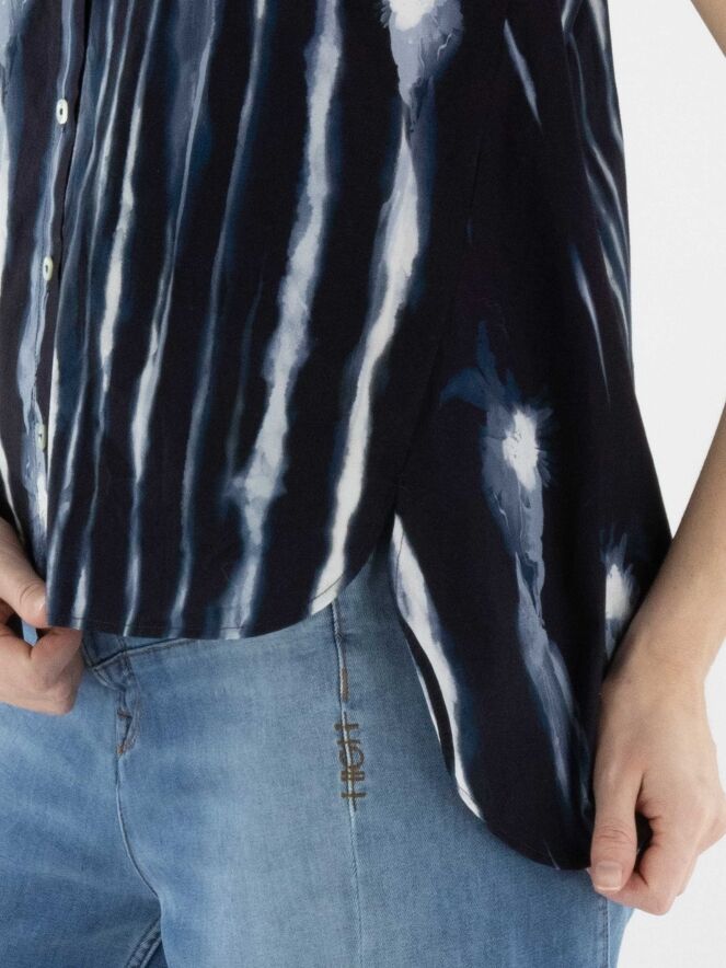 Top von High mit grafischem Paint-Print in vertikalen Linien in mehreren Blau- und Cremeweißtönen. Mit Knopfleiste gearbeitet und in leichter A-Linie geschnitten, entsteht eine fließende, moderne Silhouette. Dieses exklusive Designertop kann bei 30 Grad gewaschen werden.