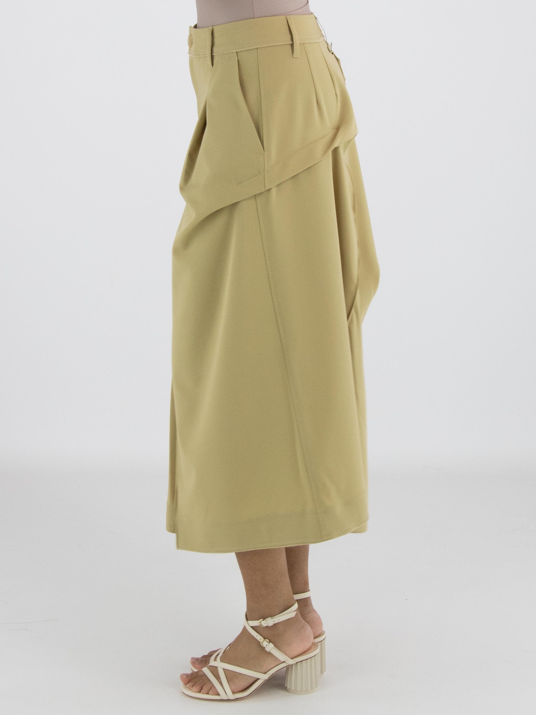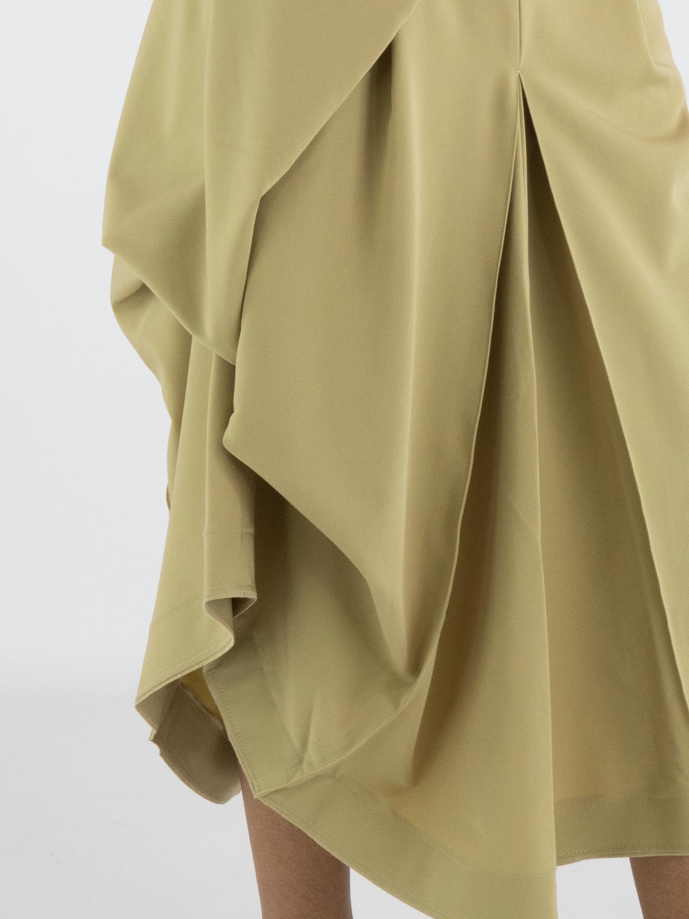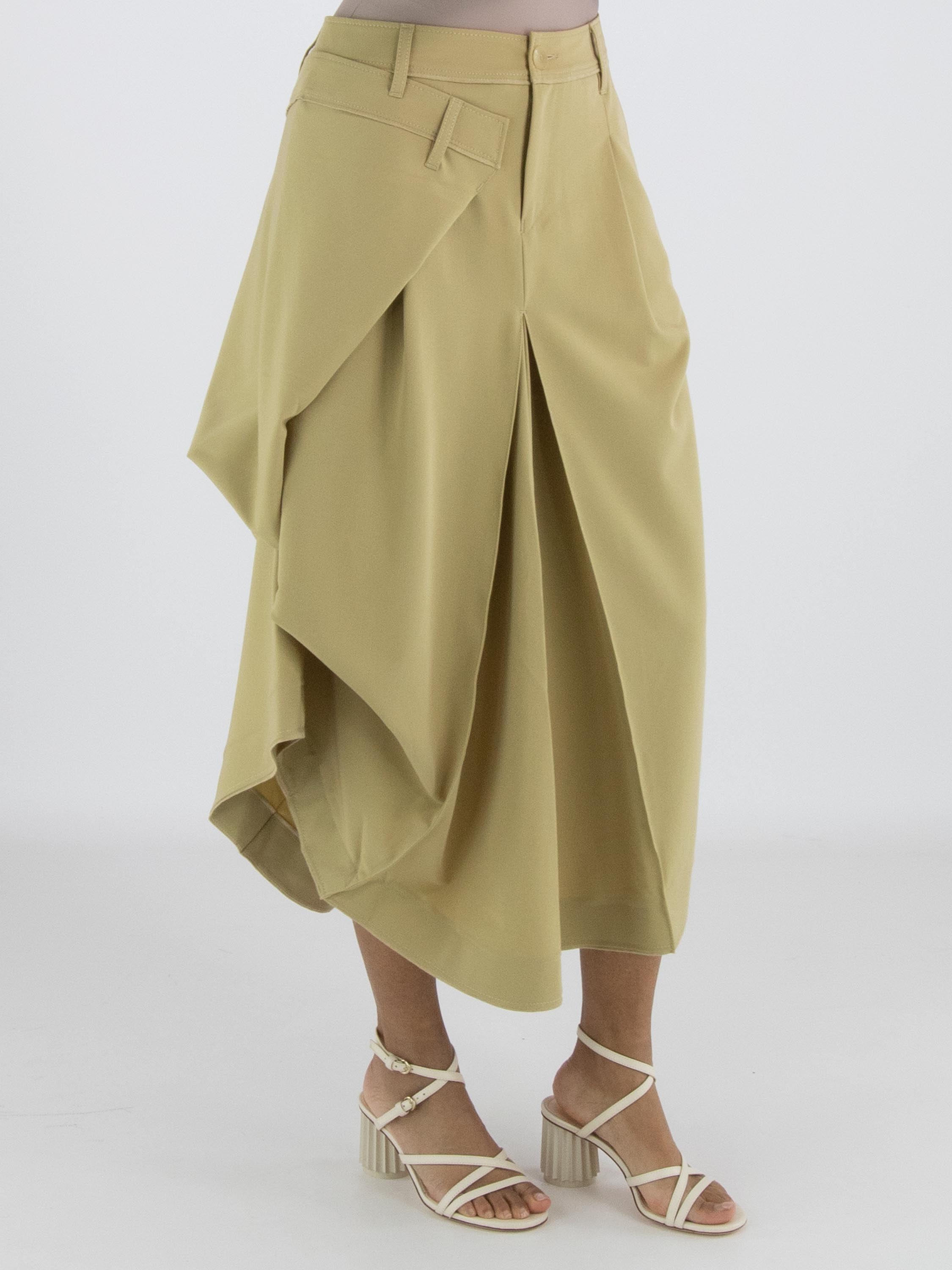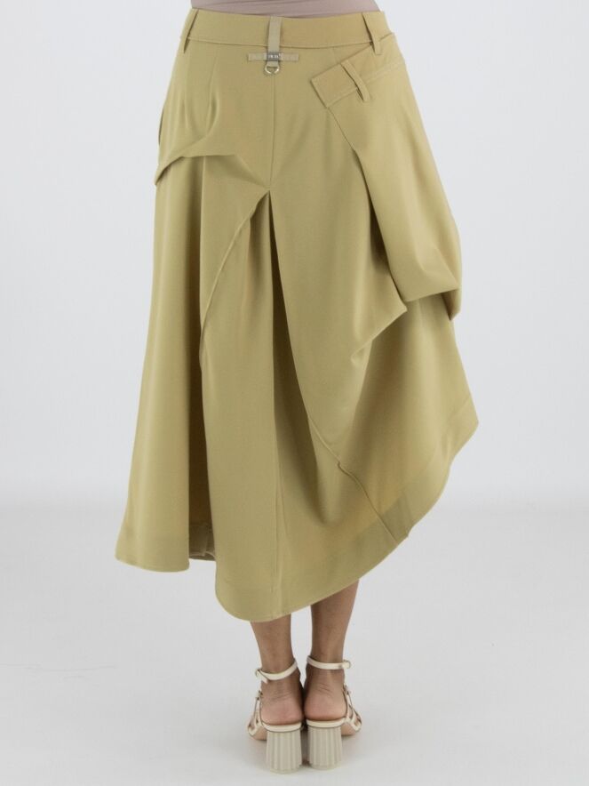 Ein Rock von High Tech in Senfgelb. Unterhalb der Taille befindet sich vorne rechts eine Überlappungsfalte, die bis zur Rückseite weiterläuft. In der Mitte der Vorder- und Rückseite entsteht unterhalb der Hüfte aus der Mittelnaht eine Faltenbildung. Auf Hüfthöhe ist der Stoff an der linken Seite fixiert, was einen zusätzlichen Falteneffekt erzeugt. Der Rock hat auf der linken Seite eine Eingrifftasche. Dieser Rock kann per Hand gewaschen werden.