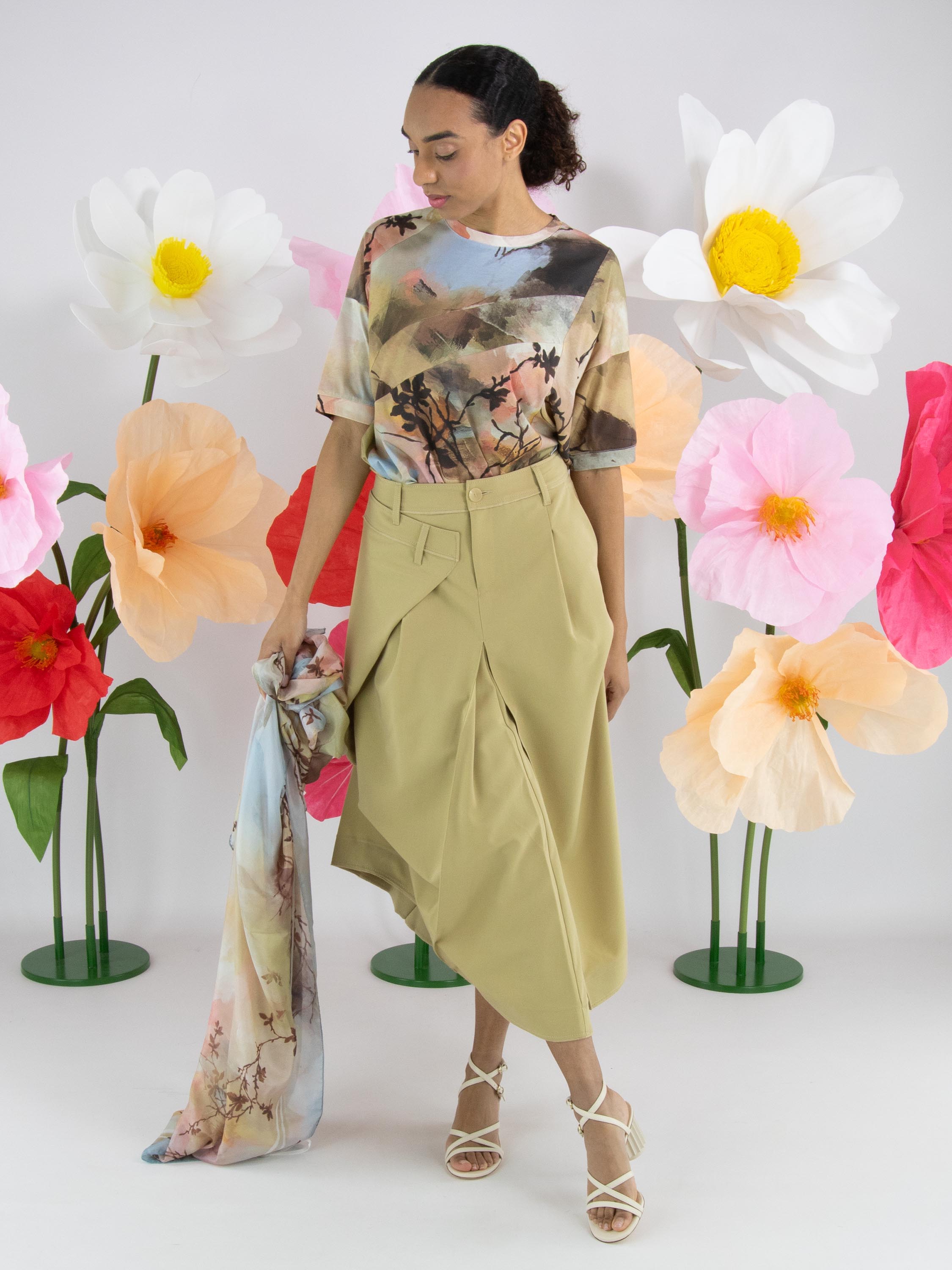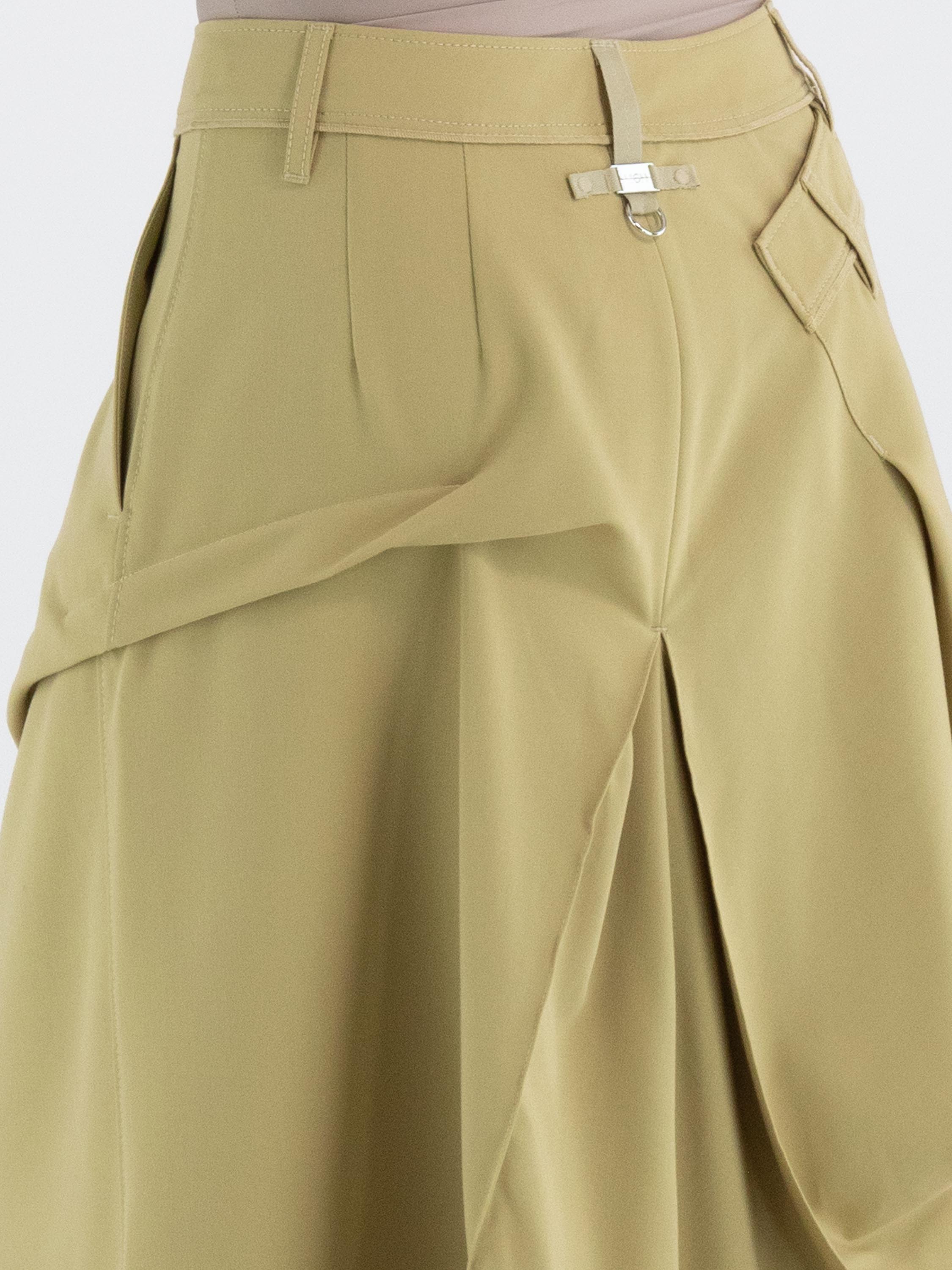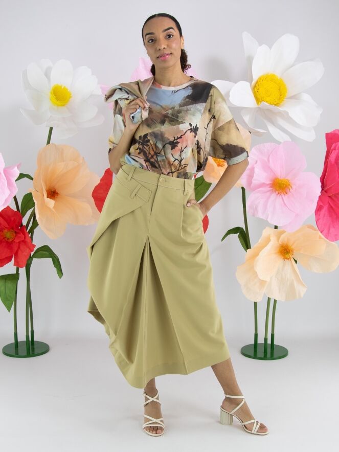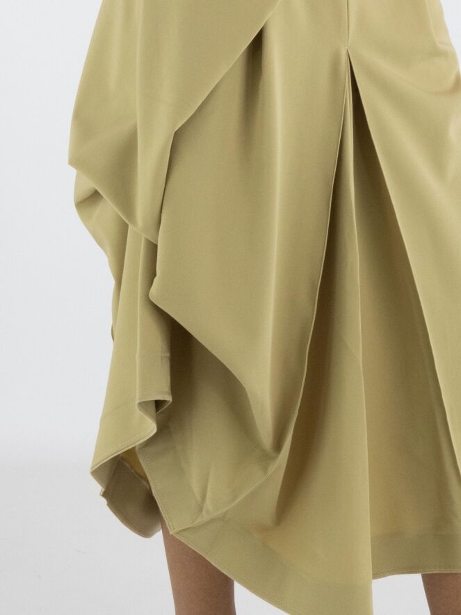 Ein Rock von High Tech in Senfgelb. Unterhalb der Taille befindet sich vorne rechts eine Überlappungsfalte, die bis zur Rückseite weiterläuft. In der Mitte der Vorder- und Rückseite entsteht unterhalb der Hüfte aus der Mittelnaht eine Faltenbildung. Auf Hüfthöhe ist der Stoff an der linken Seite fixiert, was einen zusätzlichen Falteneffekt erzeugt. Der Rock hat auf der linken Seite eine Eingrifftasche. Dieser Rock kann per Hand gewaschen werden.