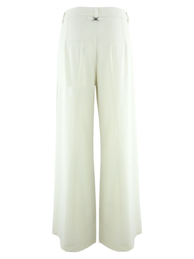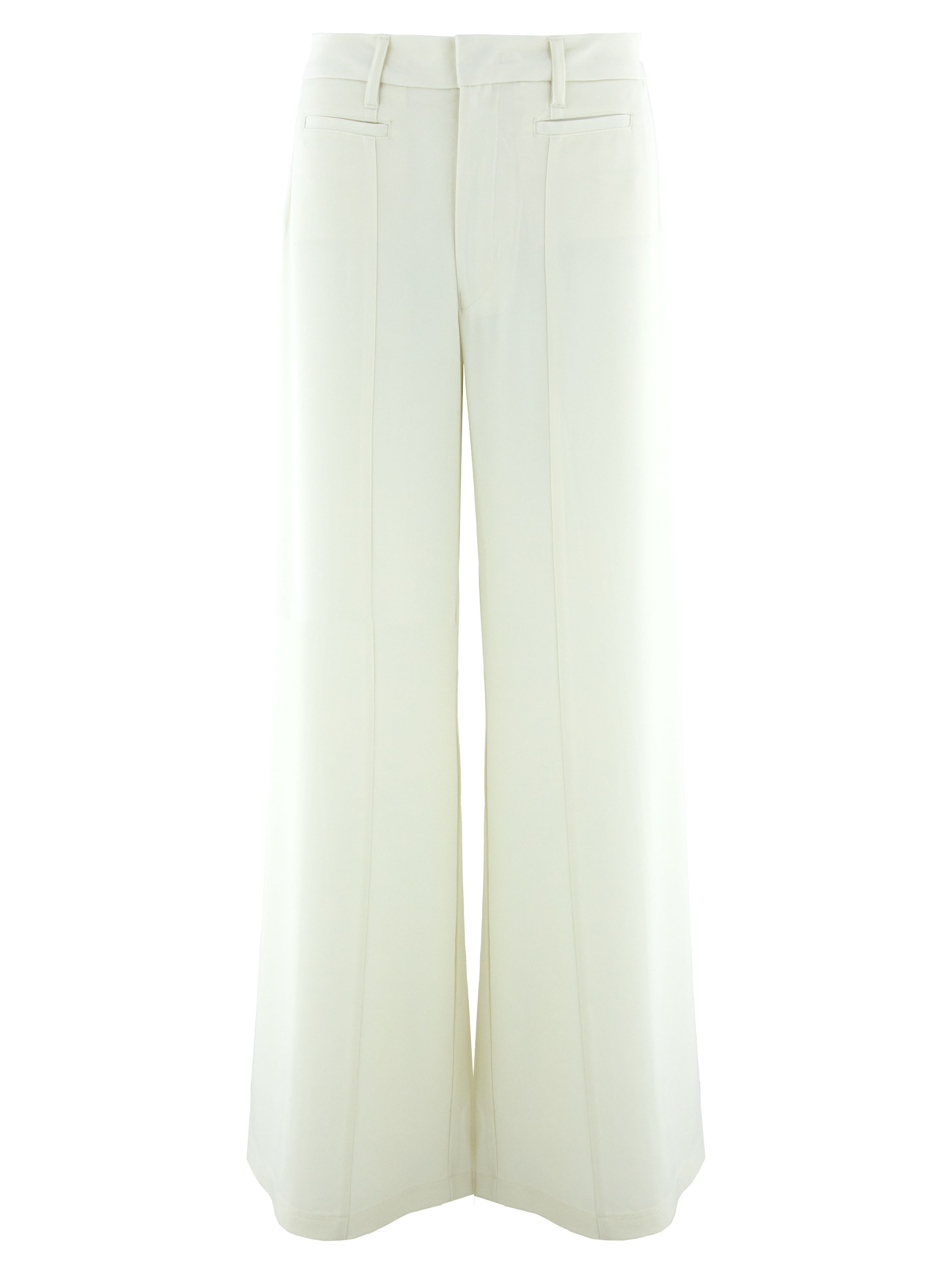 Weit geschnittene Hose von High in einem satten Cremeweiß. Vorderseitig, direkt unter dem Bund, sind zwei dekorative Taschen eingearbeitet, die dem Design eine markante Note verleihen. Eine mittige Naht verläuft über die gesamte Länge der Vorderseite der Hosenbeine und sorgt für eine schlanke, moderne Silhouette. Diese Hose darf nicht gewaschen werden.