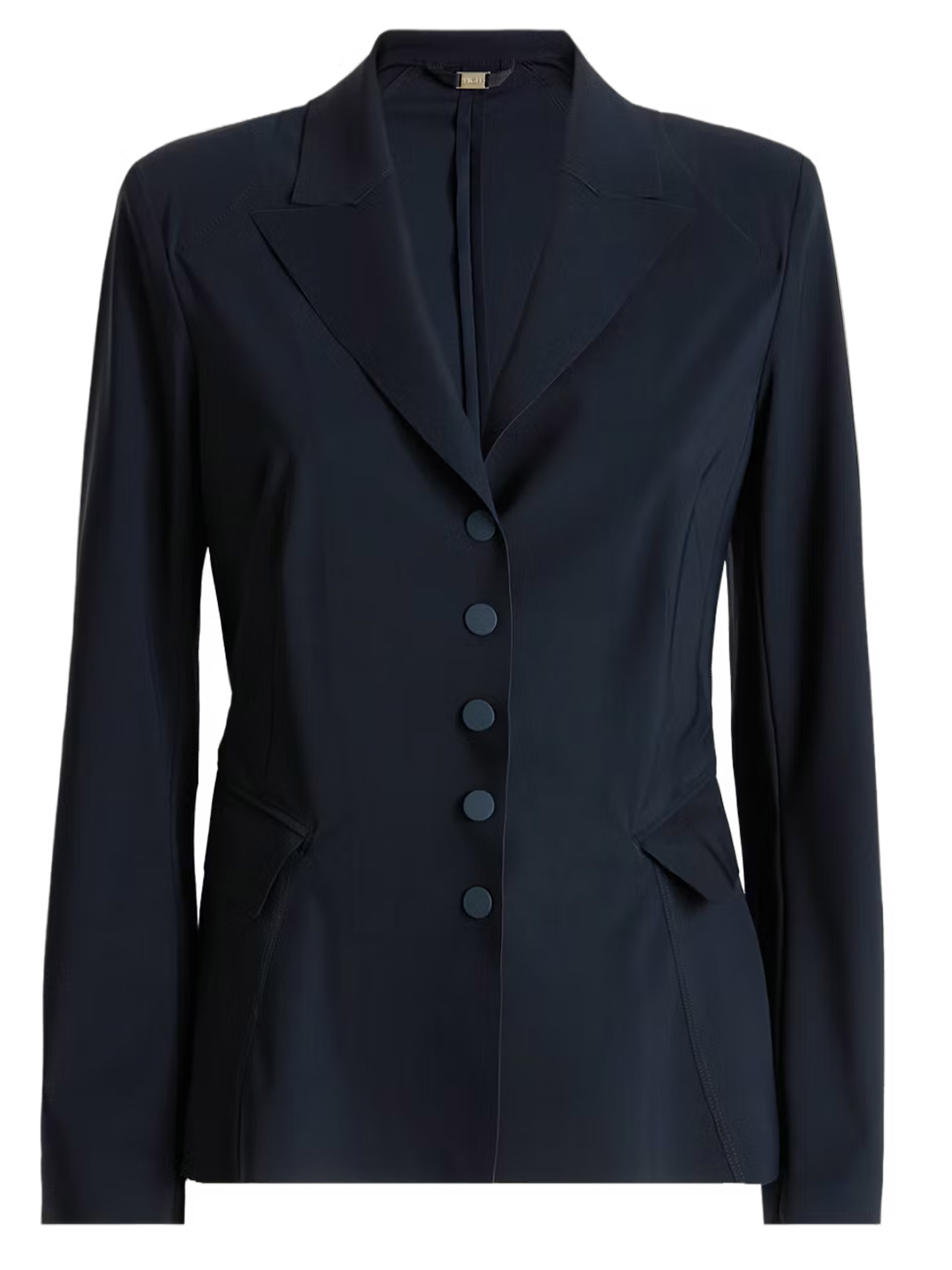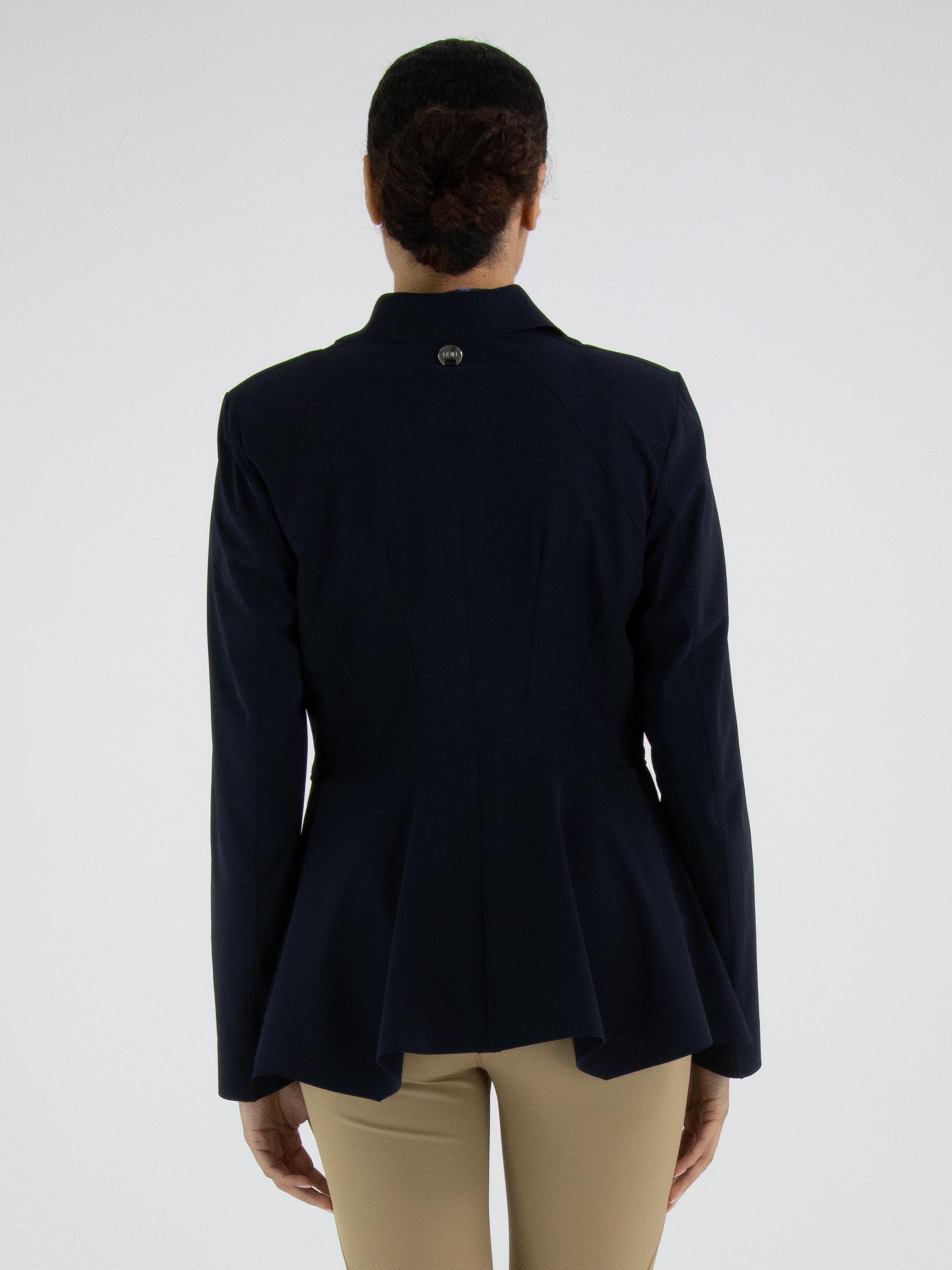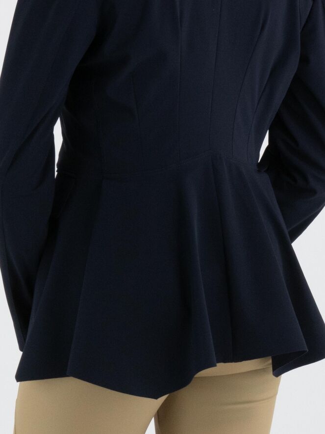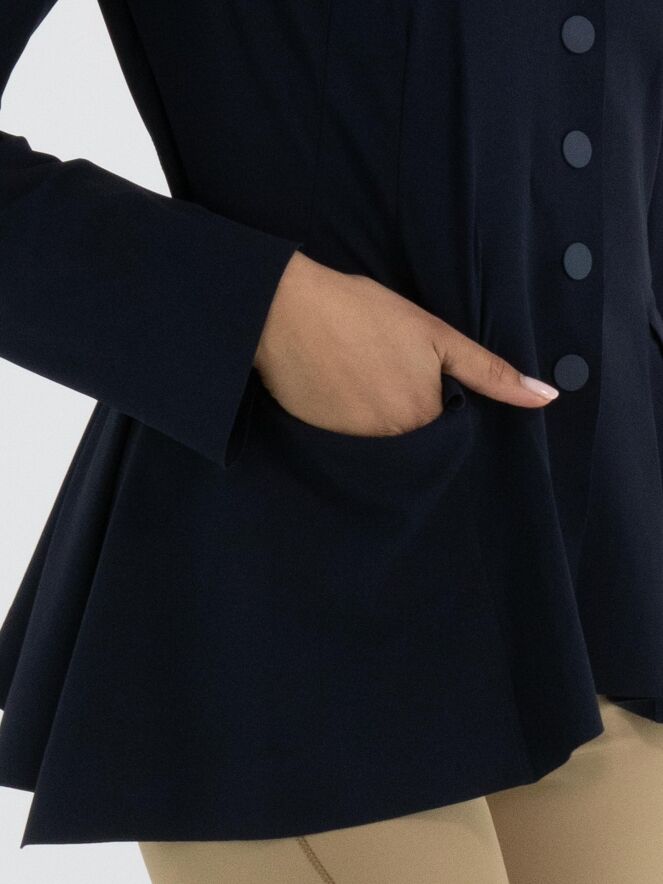 Ein Blazer von High Tech in Marineblau. Der Blazer hat eine Schließe mit fünf Druckknöpfen. Auf der Rückseite befindet sich auf Taillenhöhe eine Naht, von der aus der Stoff nach unten weich und wellenförmig gelegt ist. Oberhalb dieser Naht verlaufen mehrere Taillennähte. Der Blazer ist ungefüttert und kann per Hand gewaschen werden.