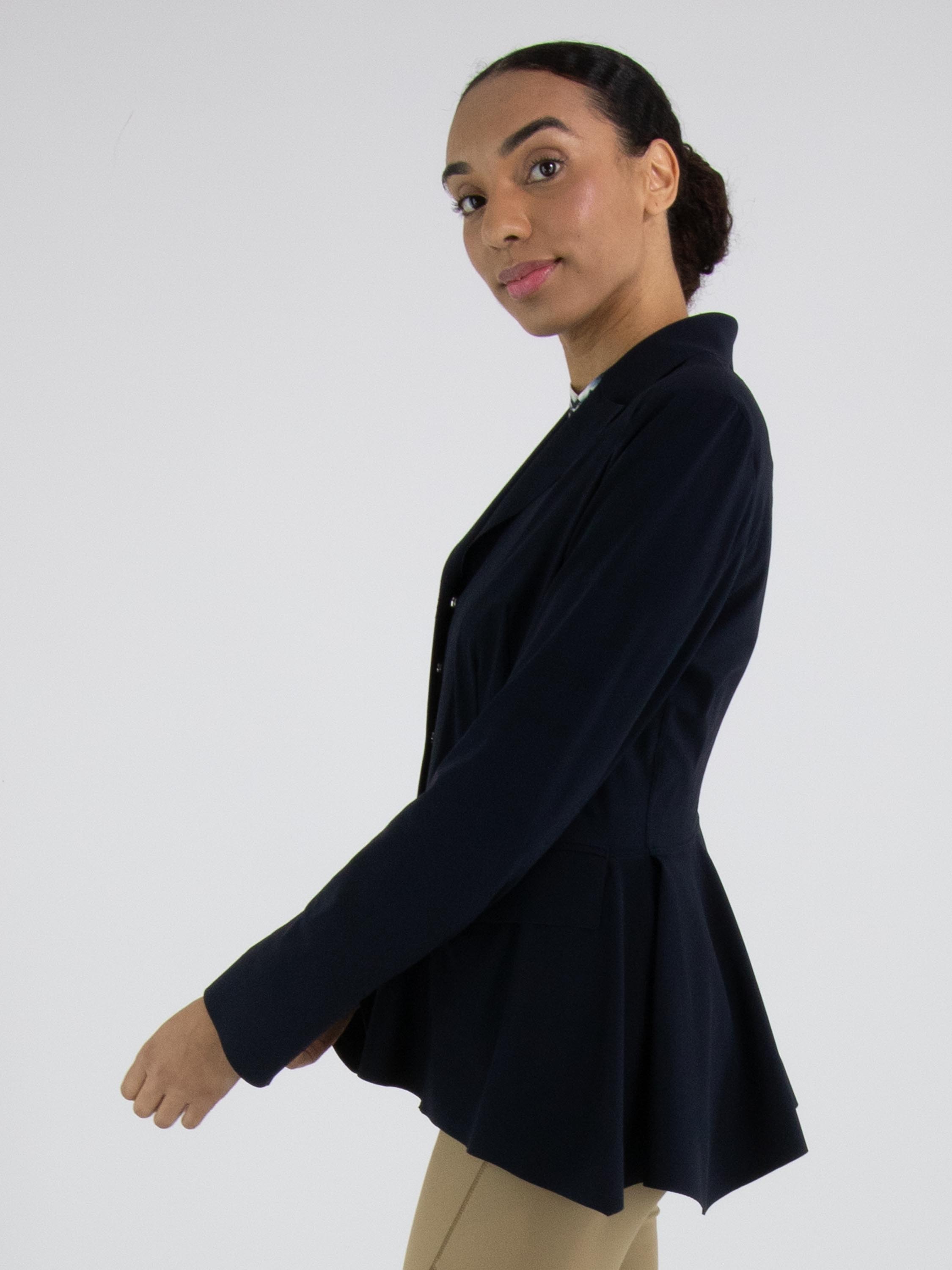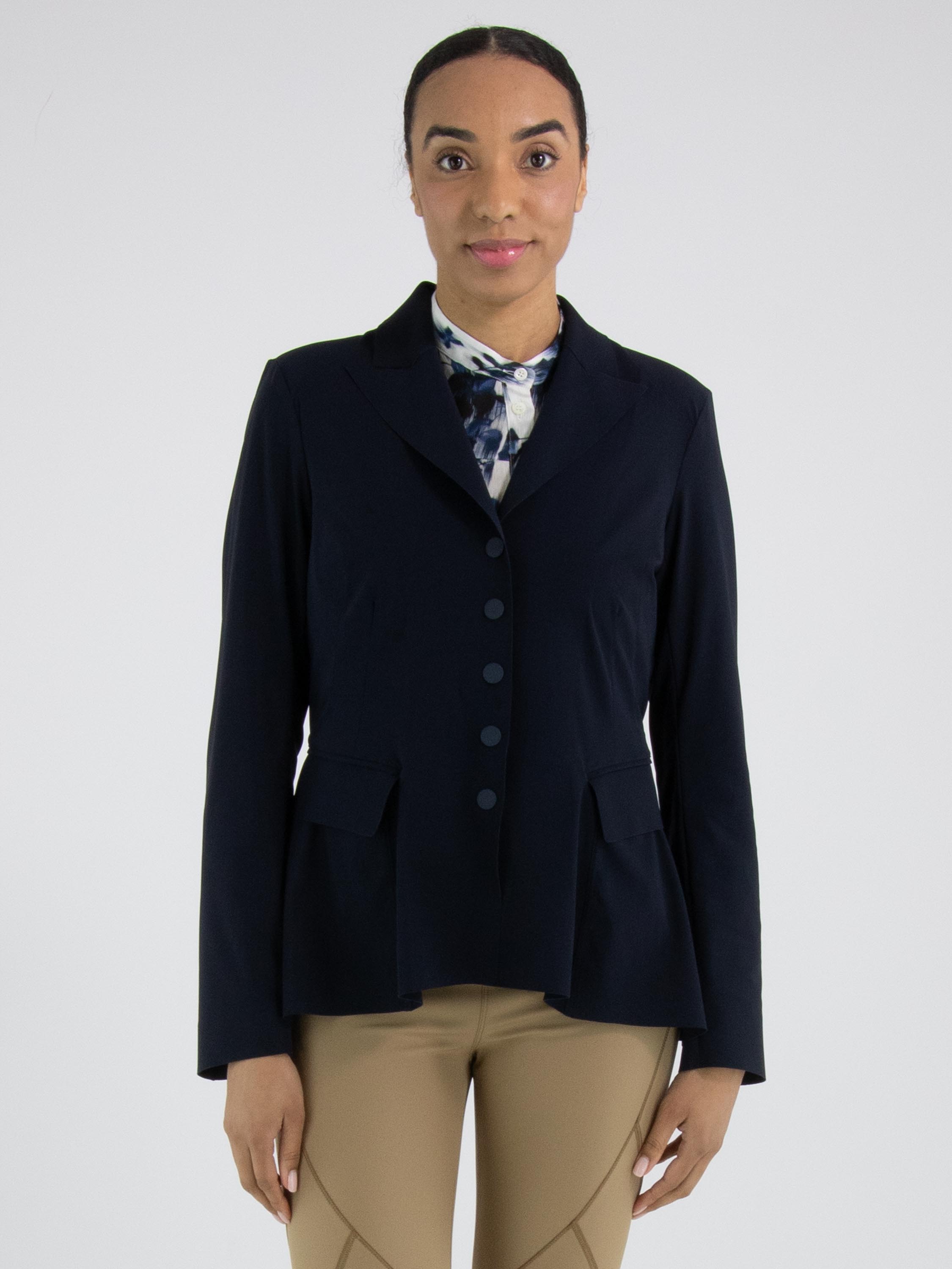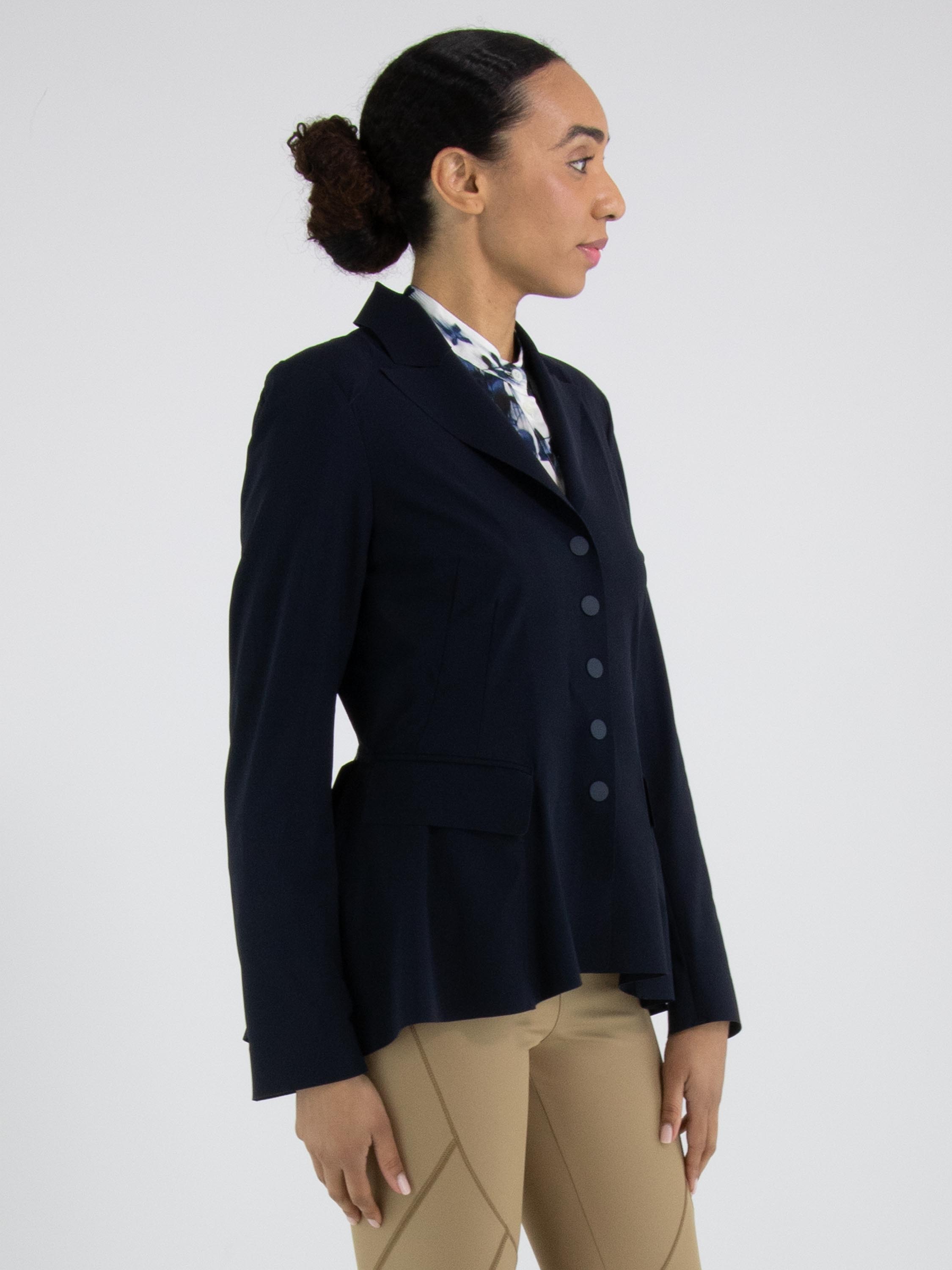Ein Blazer von High Tech in Marineblau. Der Blazer hat eine Schließe mit fünf Druckknöpfen. Auf der Rückseite befindet sich auf Taillenhöhe eine Naht, von der aus der Stoff nach unten weich und wellenförmig gelegt ist. Oberhalb dieser Naht verlaufen mehrere Taillennähte. Der Blazer ist ungefüttert und kann per Hand gewaschen werden.
