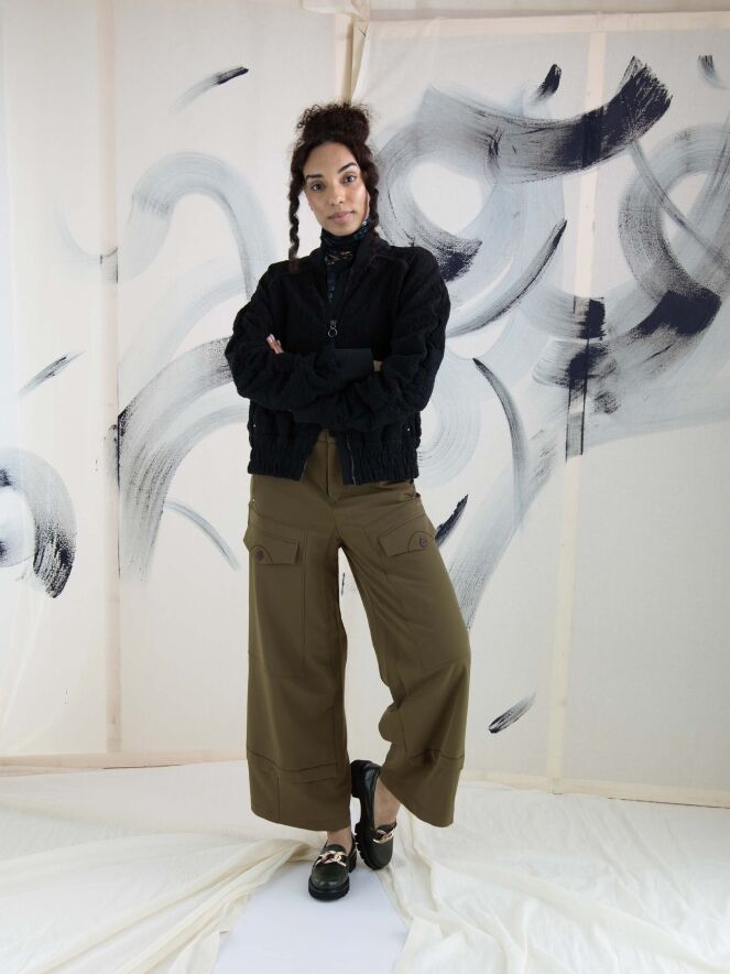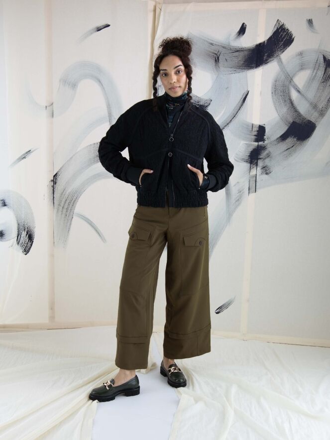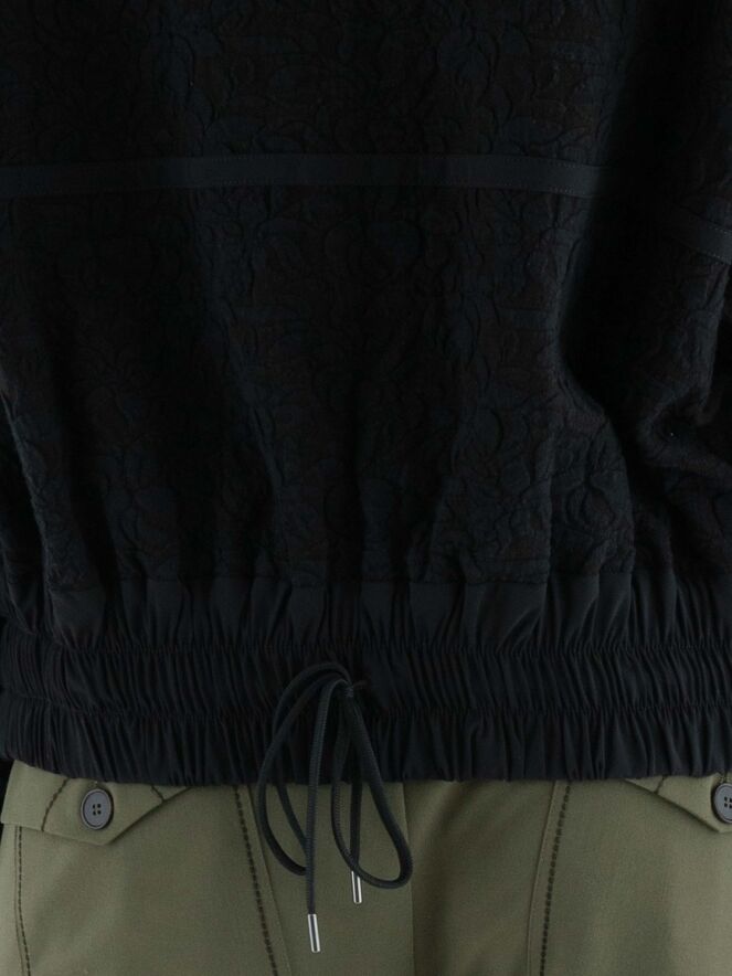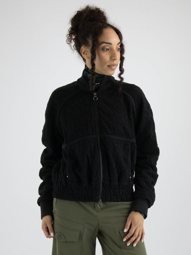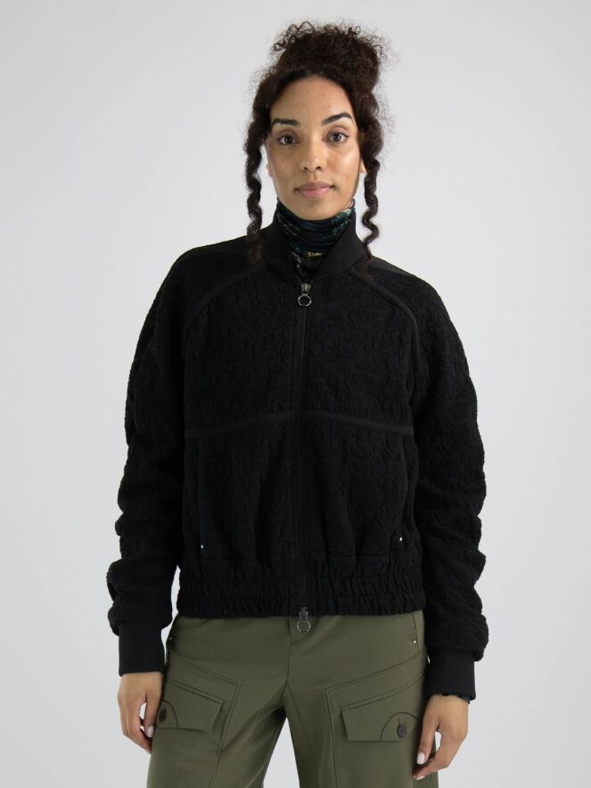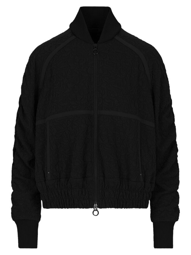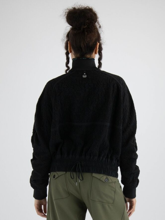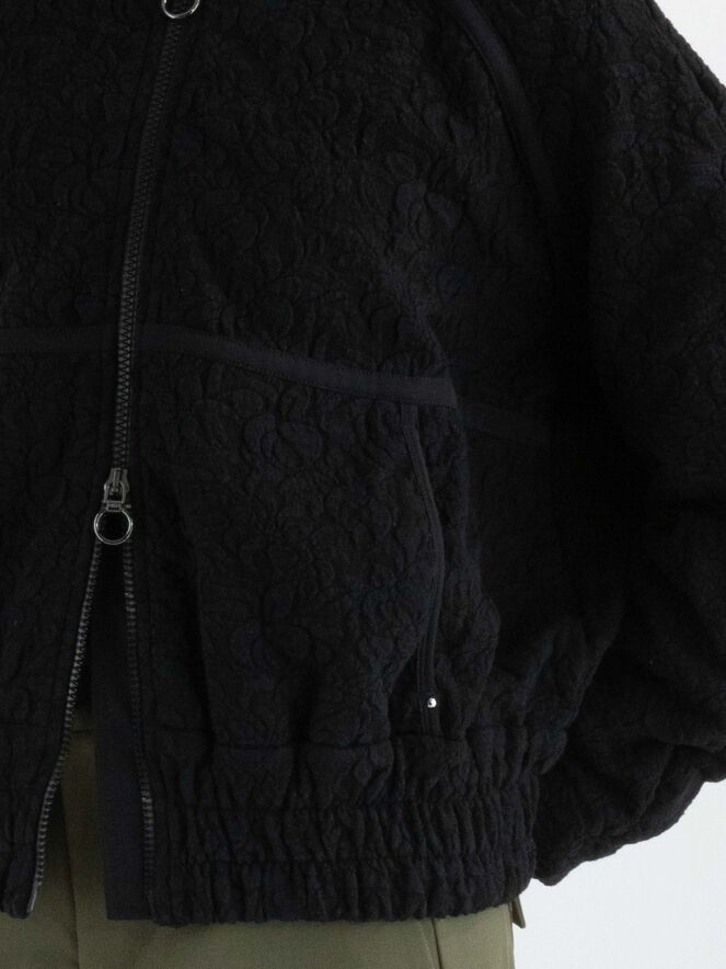 Eine luxuriöse Strickjacke in einem gerafften Blumenmuster in Schwarz. Entlang des Kragenrandes und an den Enden der langen Ärmel befindet sich ein fein geripptes Strickbündchen. Am unteren Rand gibt es ein breites, fein gefaltetes Bündchen mit mehreren Nähten. An den Schultern und im Brustbereich sind Paspeln aus einfarbigem schwarzen Stoff angebracht. Die Strickjacke hat einen Reißverschluss und kann von Hand gewaschen werden.