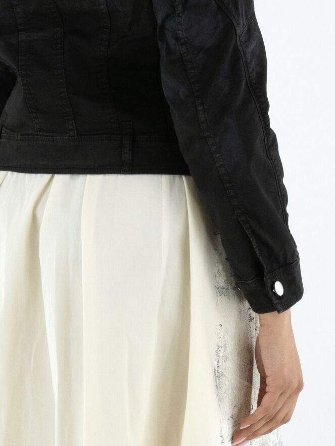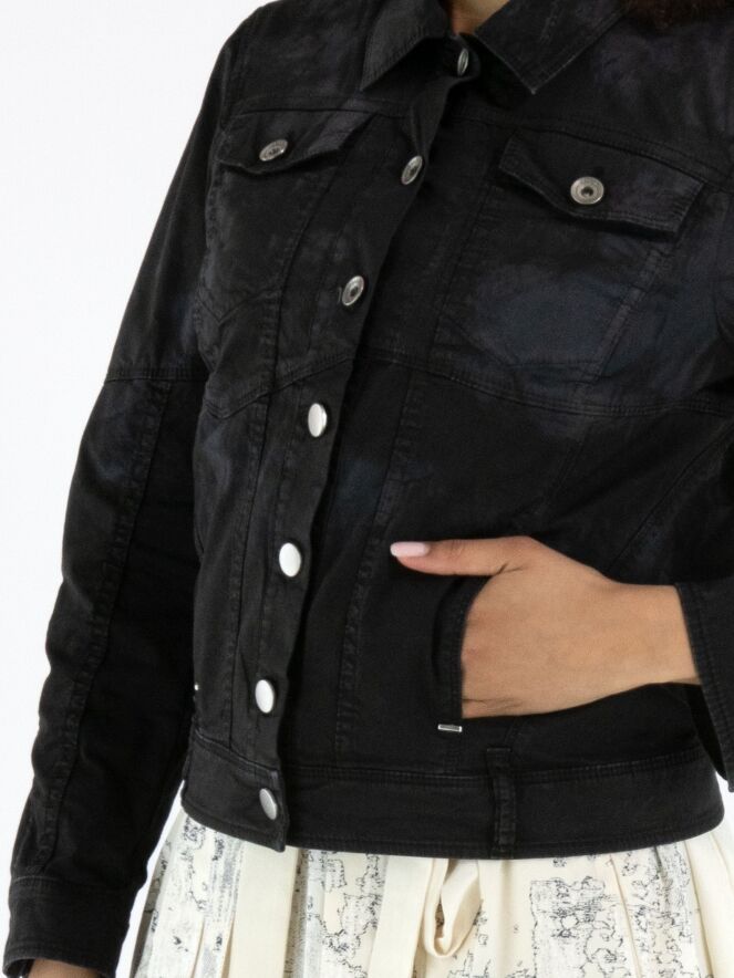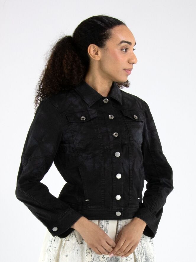 Kurzer Jeansblazer von High mit gesprenkeltem Ton-in-Ton-Print in mehreren Schwarztönen. Der Blazer wird mit Knöpfen geschlossen und verfügt über Eingrifftaschen auf Taillenhöhe. Das Modell überzeugt durch eine moderne und lässige Ausstrahlung. Dieser Blazer kann bei 30 Grad gewaschen werden.
