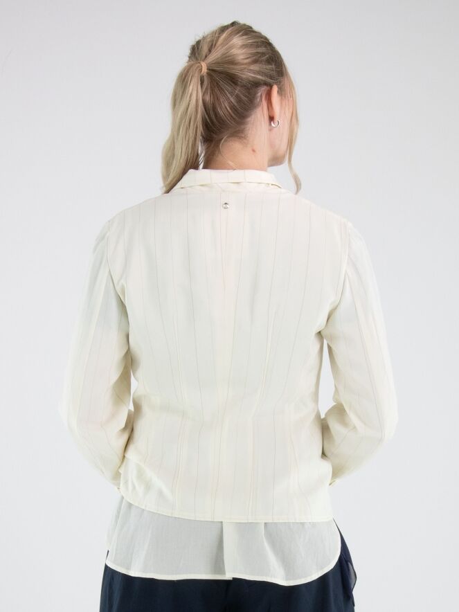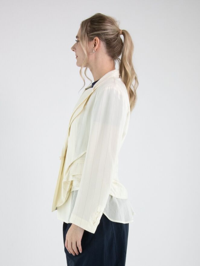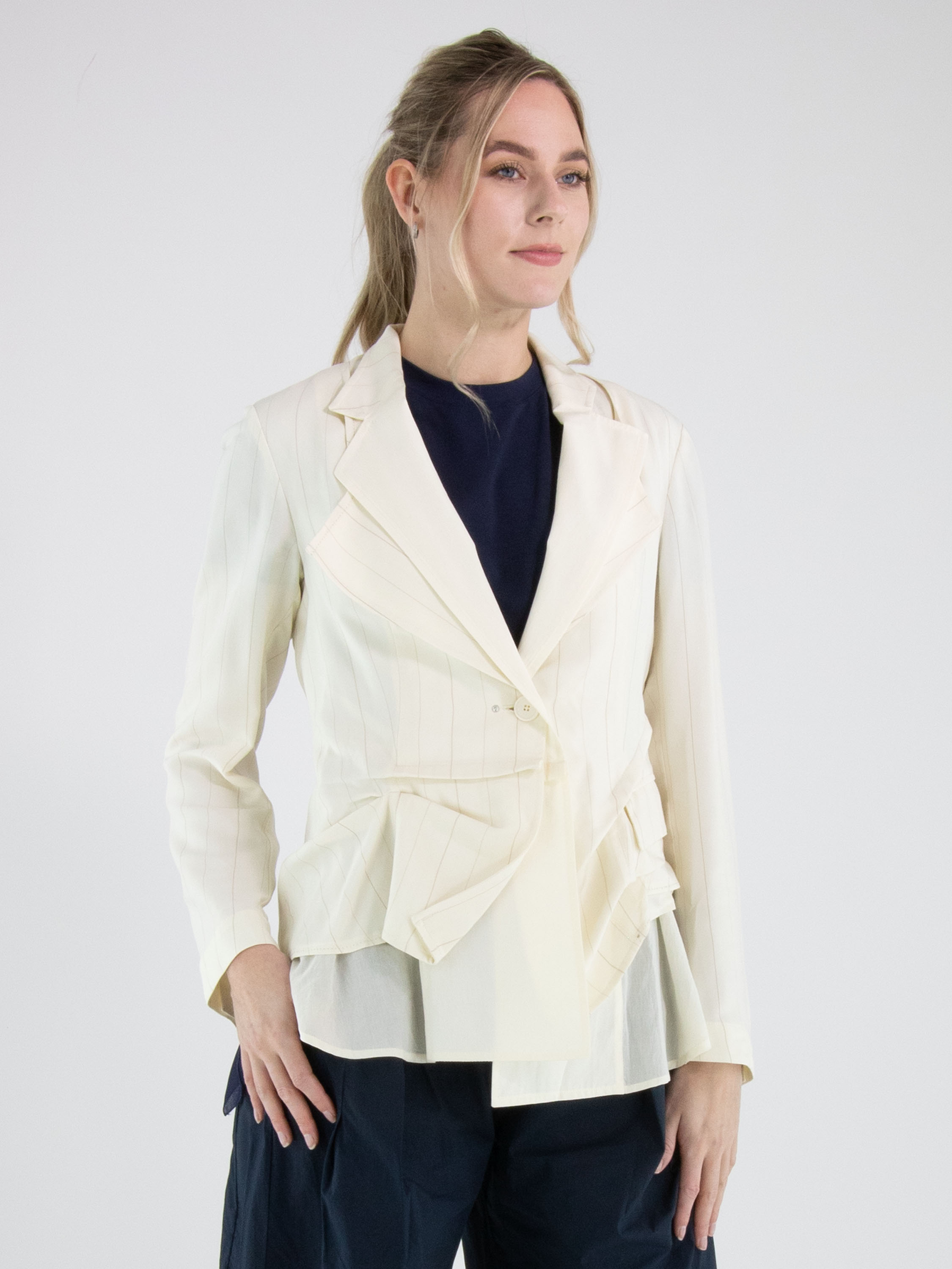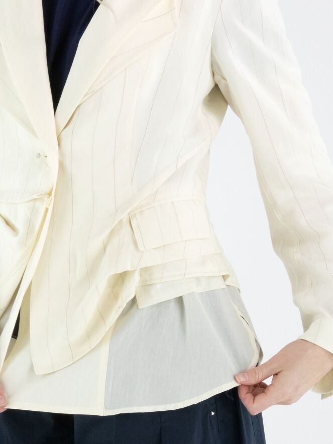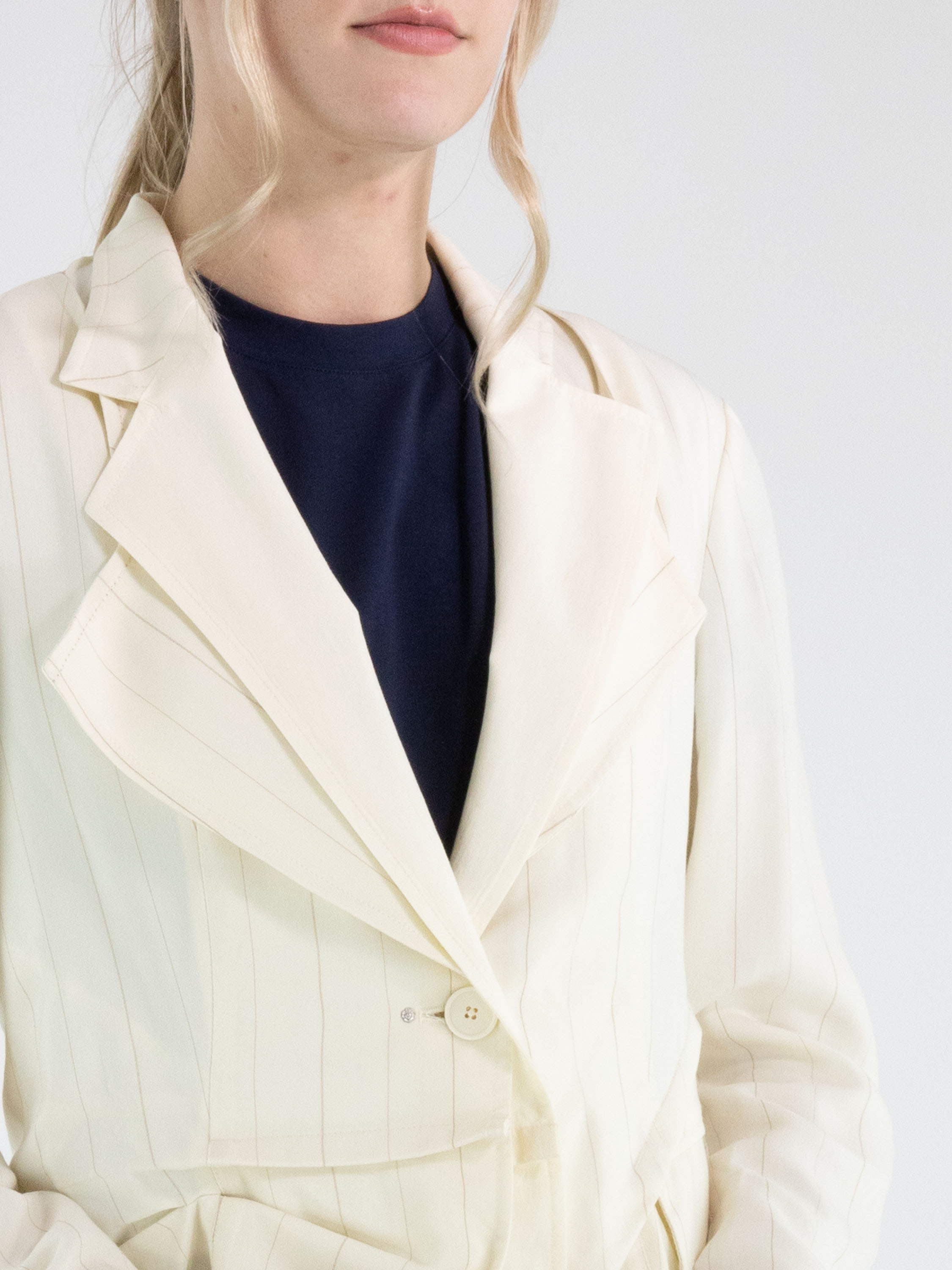 Blazer von High in einem edlen Nadelstreifenmuster in Cremeweiß und Camel. Das Modell ist in doppellagiger Verarbeitung gearbeitet: Der unifarbene Stoff liegt am doppelten Kragen über dem Nadelstreifen, während er am Saum darunter platziert ist und so einen modernen, mehrlagigen Effekt erzeugt. Unterhalb der Taschen ist der Nadelstreifenstoff punktuell fixiert, wodurch ein dezenter Falteneffekt entsteht. Dieser exklusive Designerblazer darf nicht gewaschen werden.