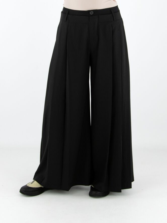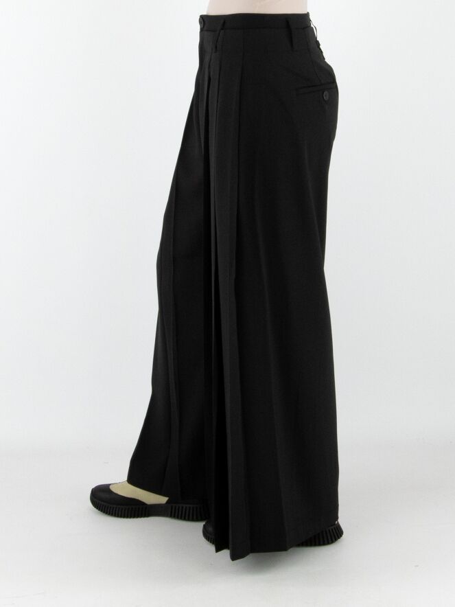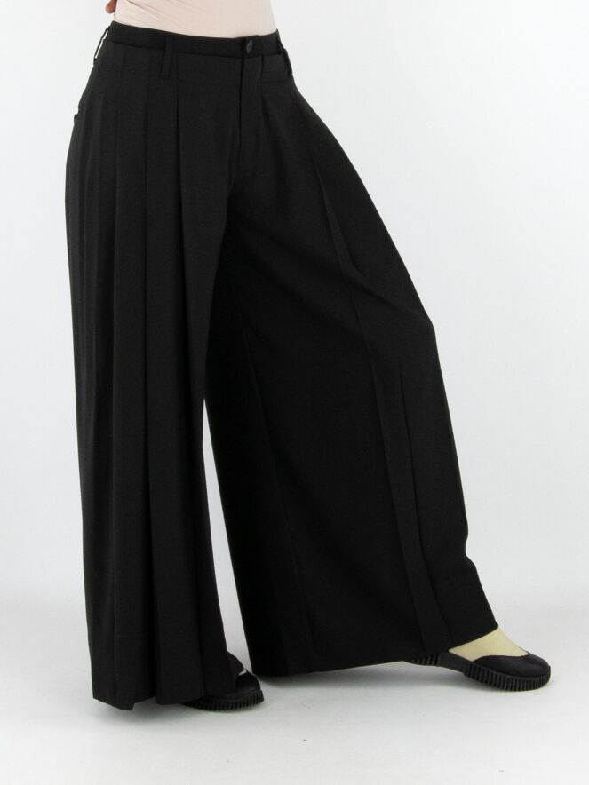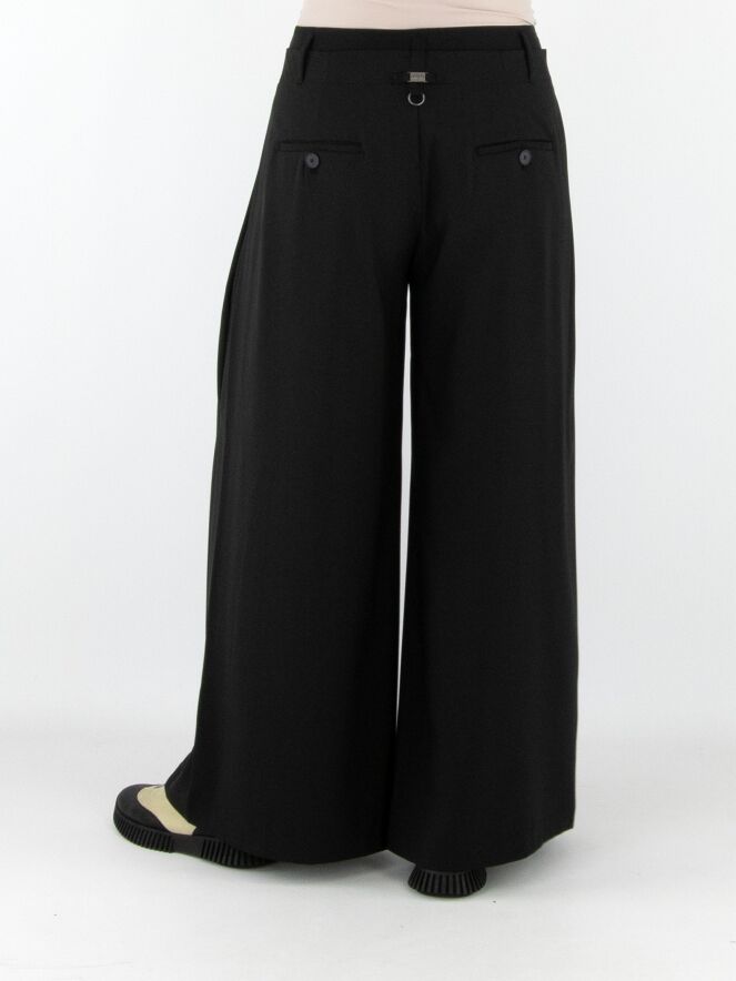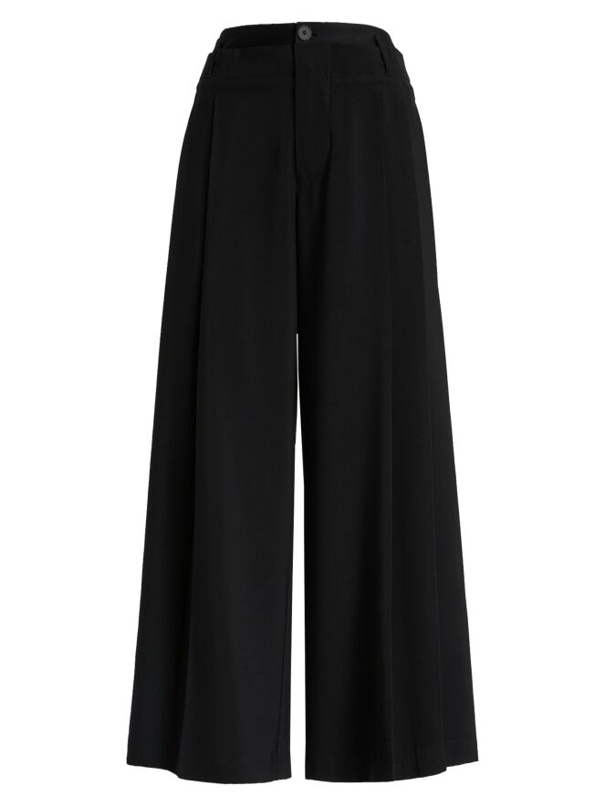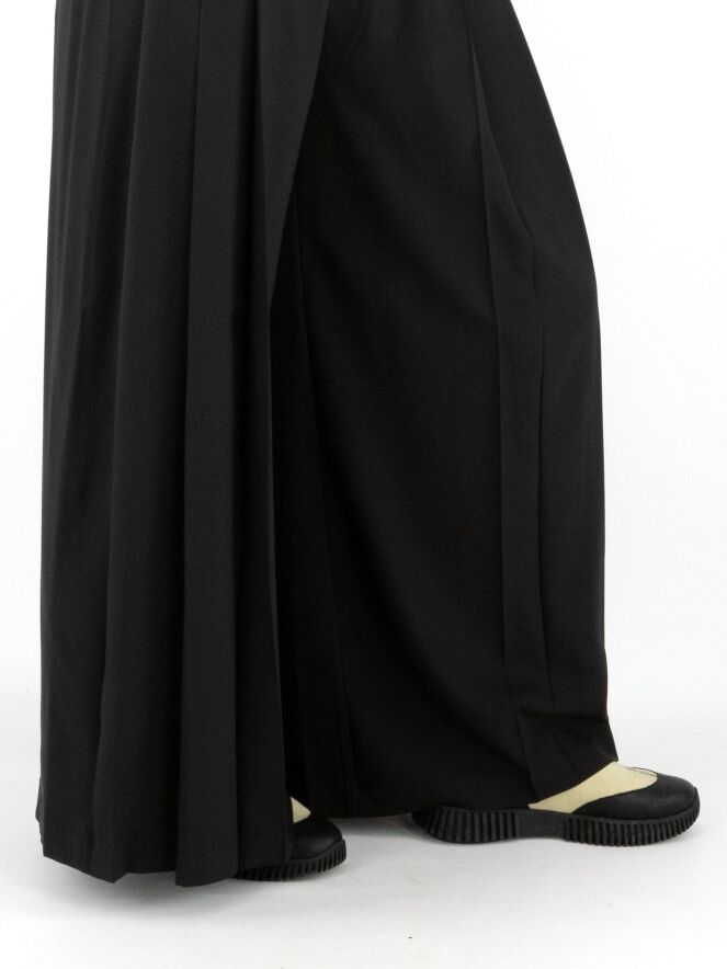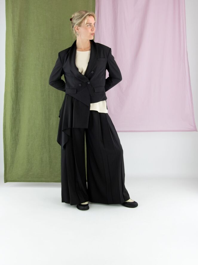 Hose von High in Schwarz. Am Bund liegt eine zweite Lage aus mattem Satin über dem Hauptstoff. An beiden Seiten ist der Stoff in feine Falten gelegt. Die Hose hat Eingrifftaschen und sollte von Hand gewaschen werden.