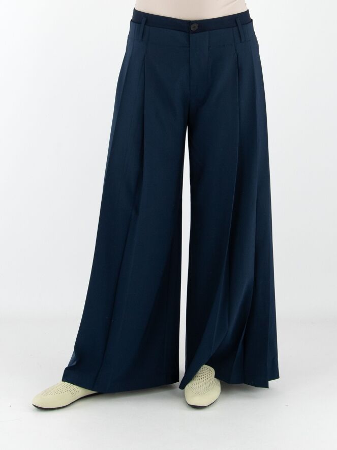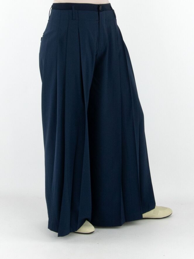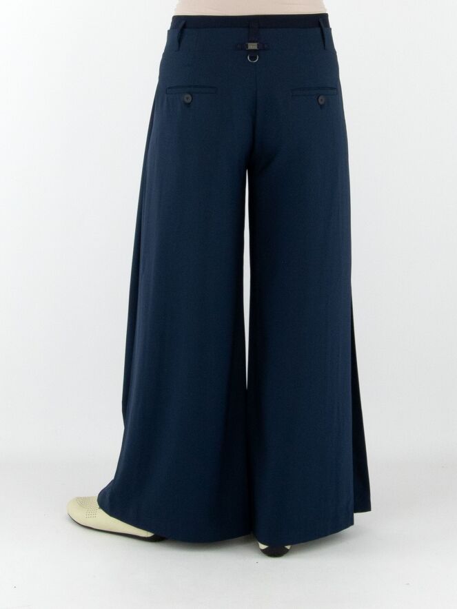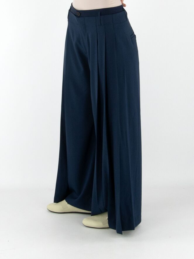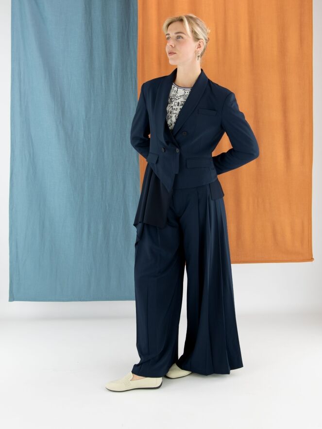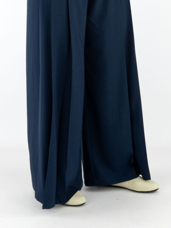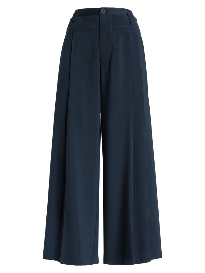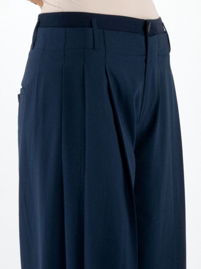 Hose von High in Nachtblau. Im Taillenbereich liegt eine zweite Lage aus mattem Satin über dem Grundmaterial. An beiden Seiten ist der Stoff in einige Falten gelegt. Die Hose hat Eingrifftaschen und sollte von Hand gewaschen werden.