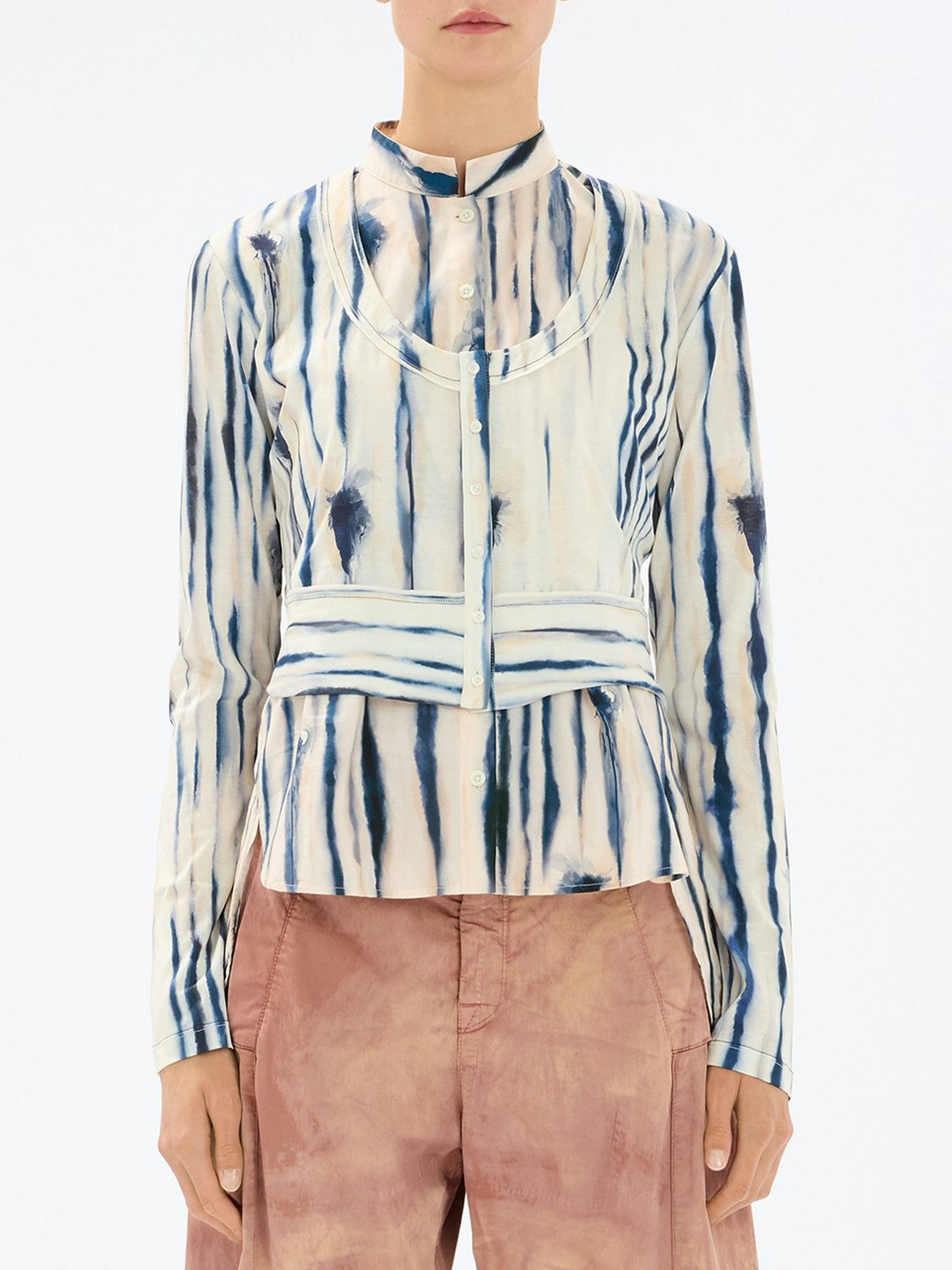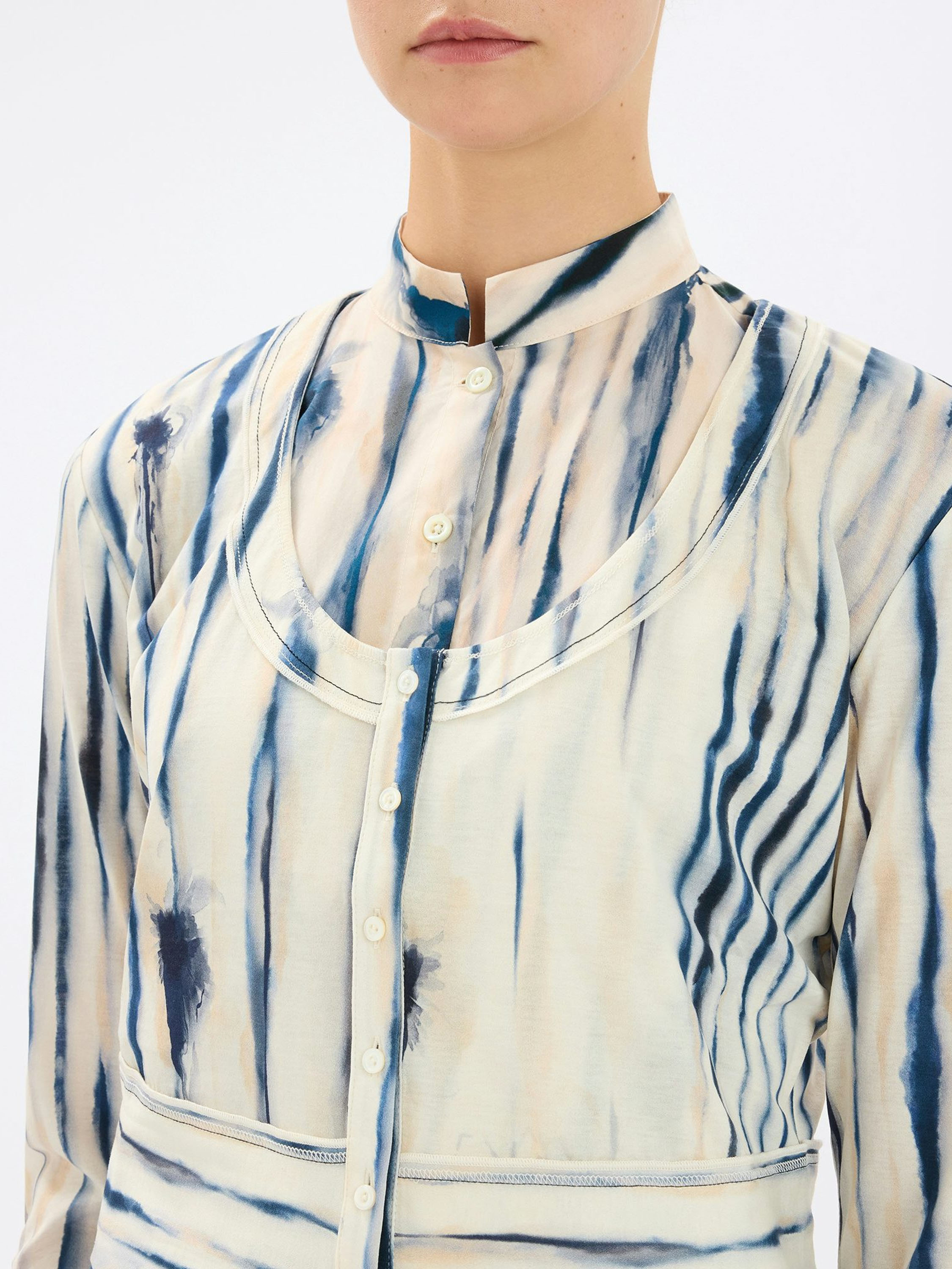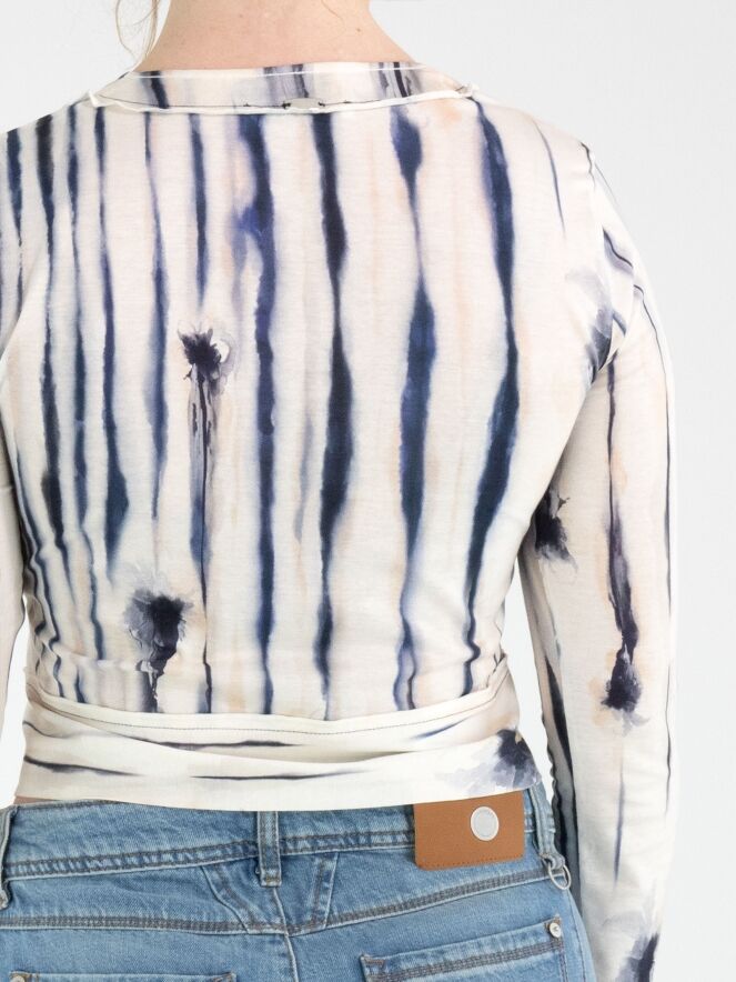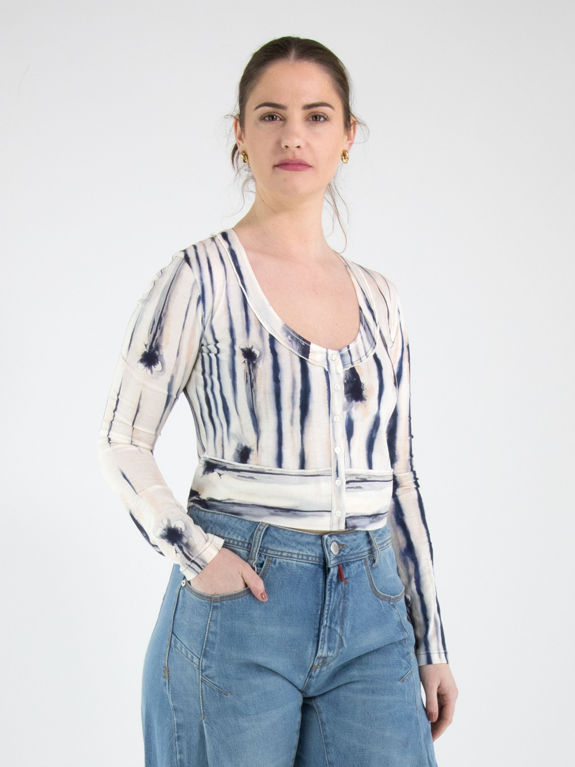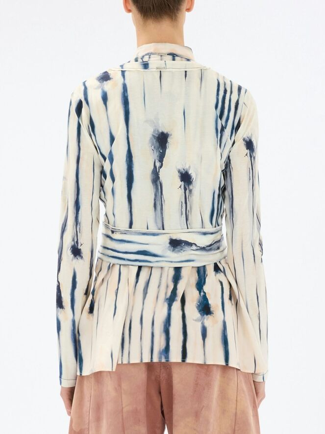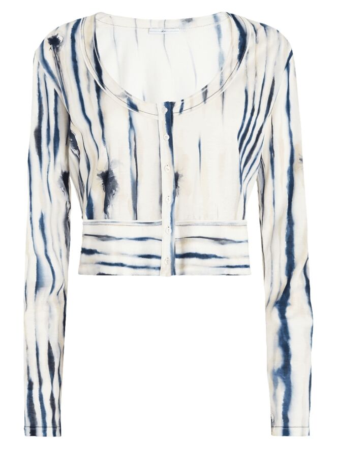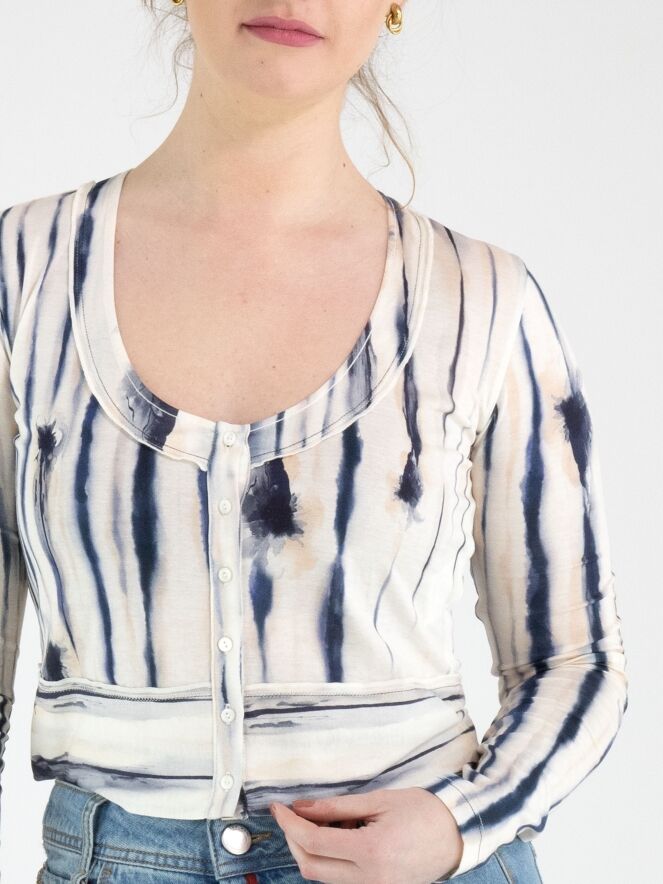 Ein kurzes Strickjacke von High mit einem gemalten Streifenprint in Schwarz, Blau und Nude auf cremeweißem Grund. Die Strickjacke hat einen tiefen Rundhalsausschnitt und eine Knopfleiste. Diese Strickjacke kann per Hand gewaschen werden.