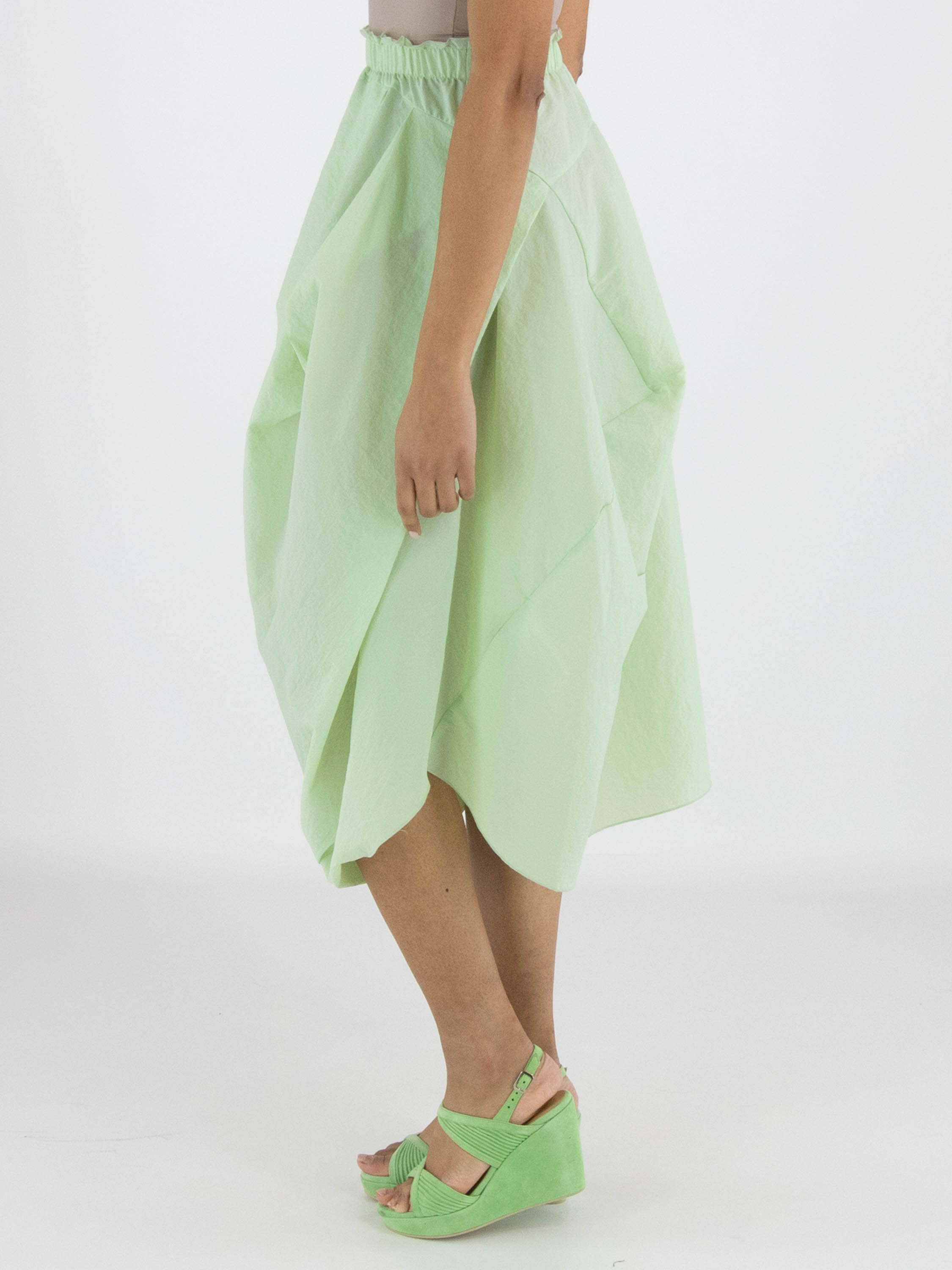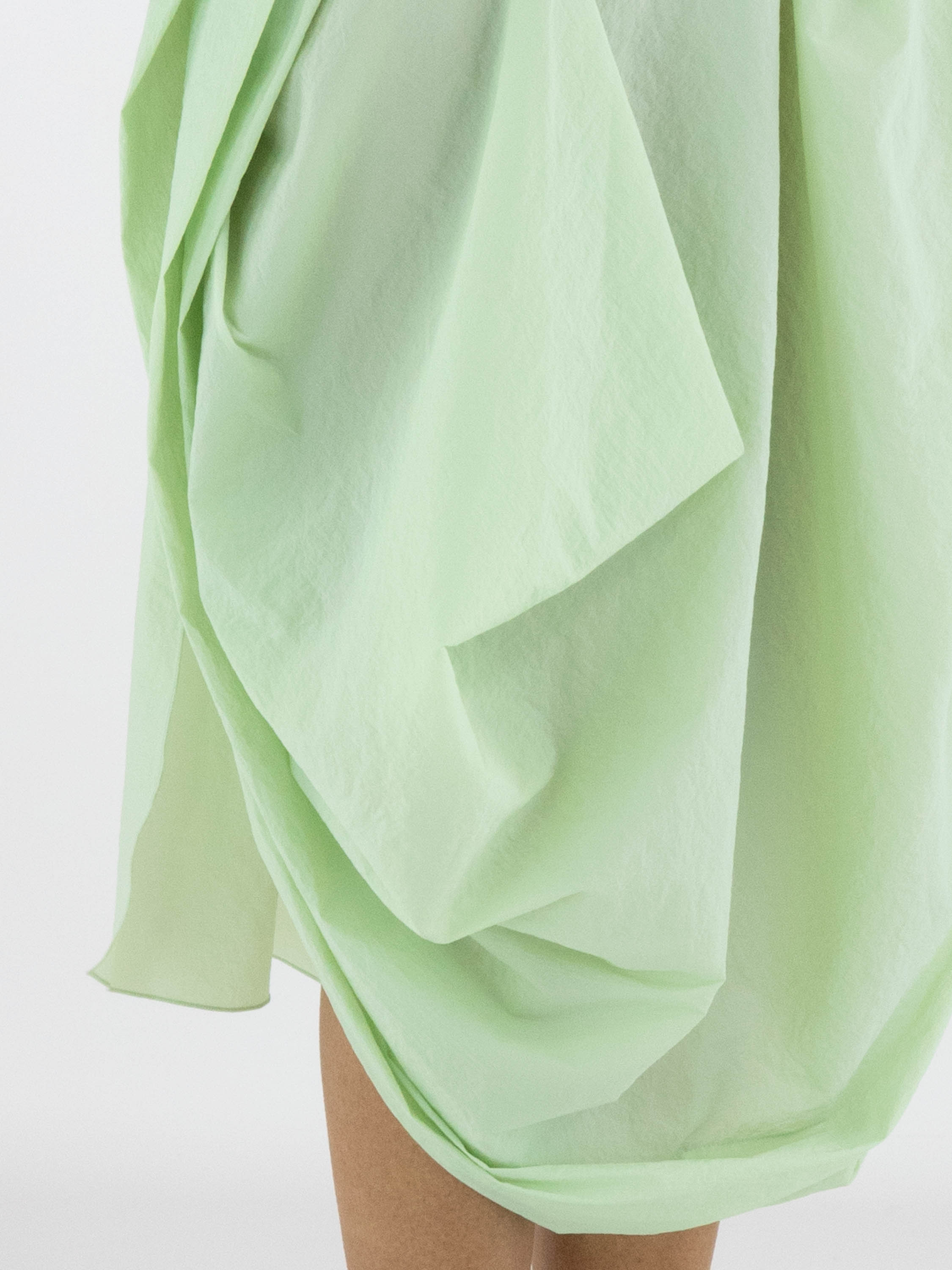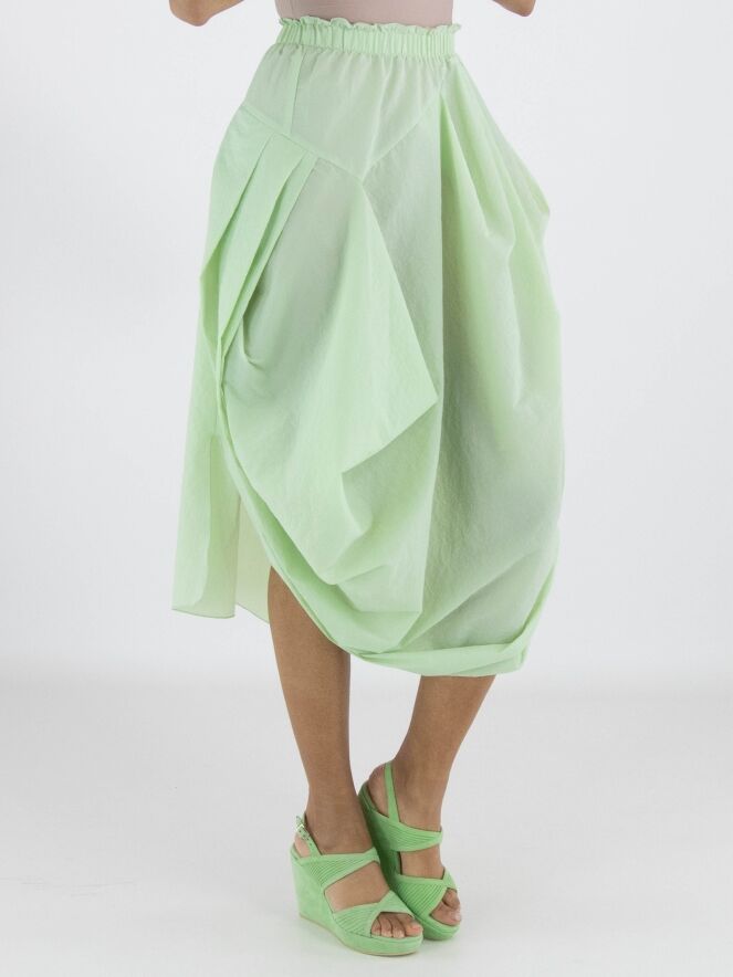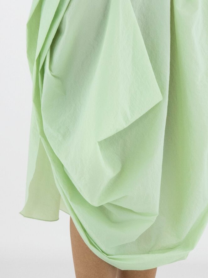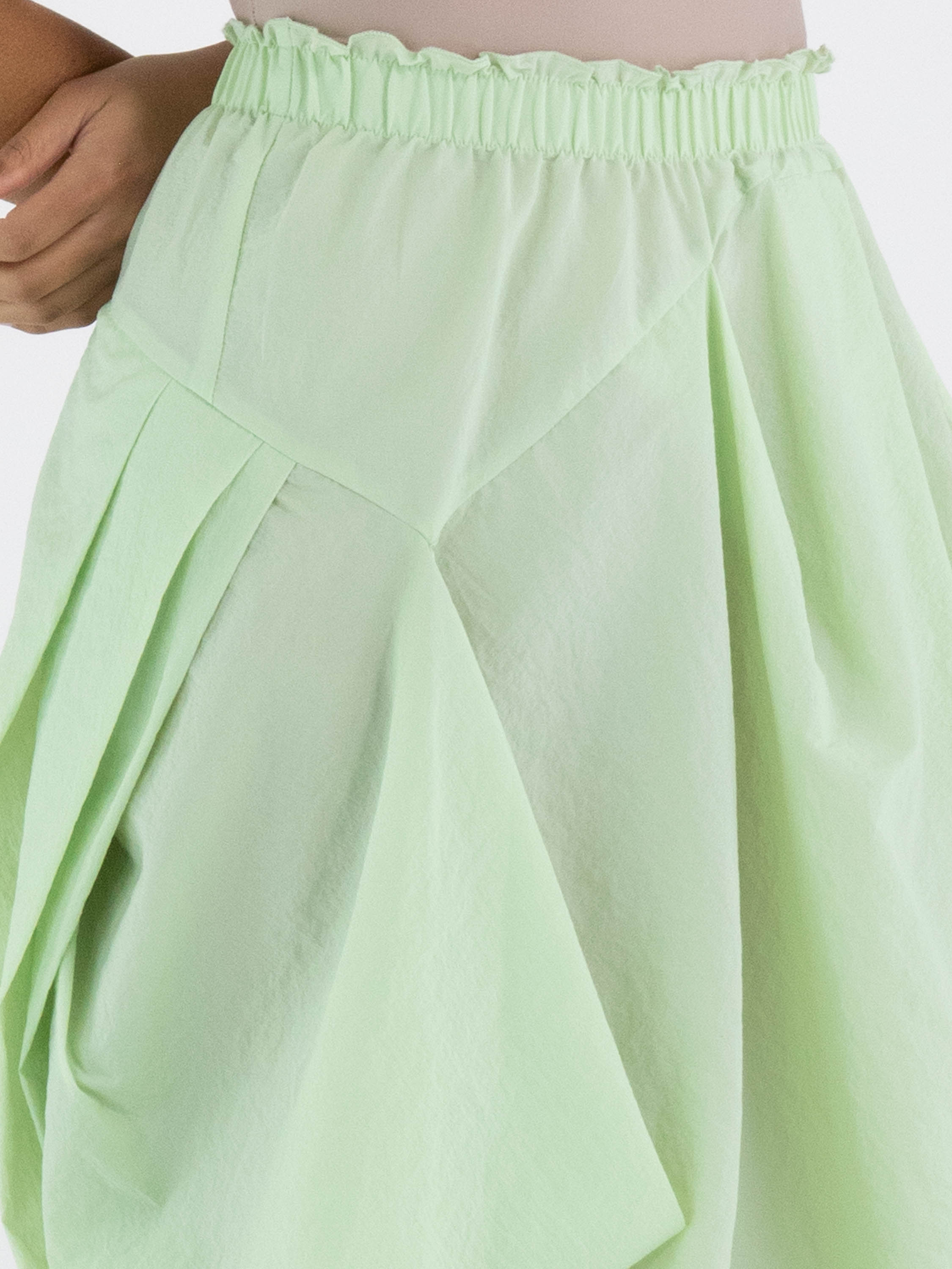 Ein Rock von High Lab aus einem nicht transparenten Fallschirmstoff in einem sanften Mintgrün. In der Taille befindet sich ein fein gereihter elastischer Bund. Der Rock hat eine Ballonform mit mehreren Falten, Nähten und diagonalen Plissees. Dieser Rock kann per Hand gewaschen werden.