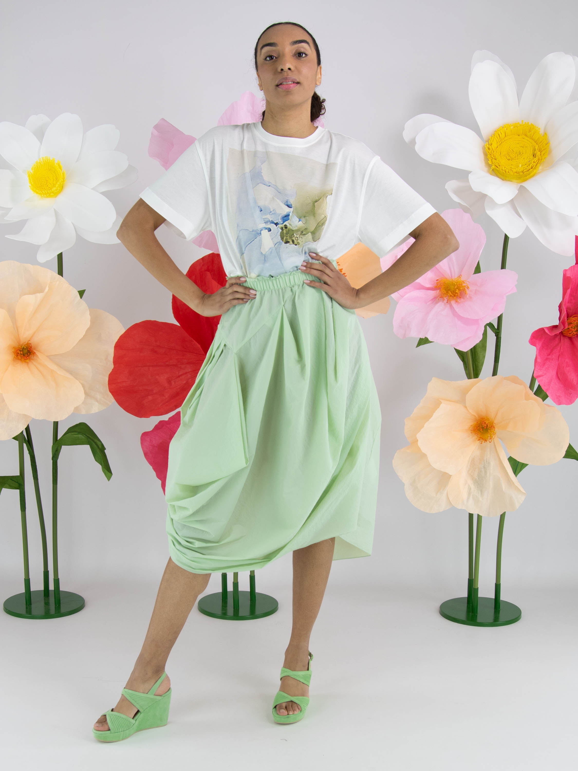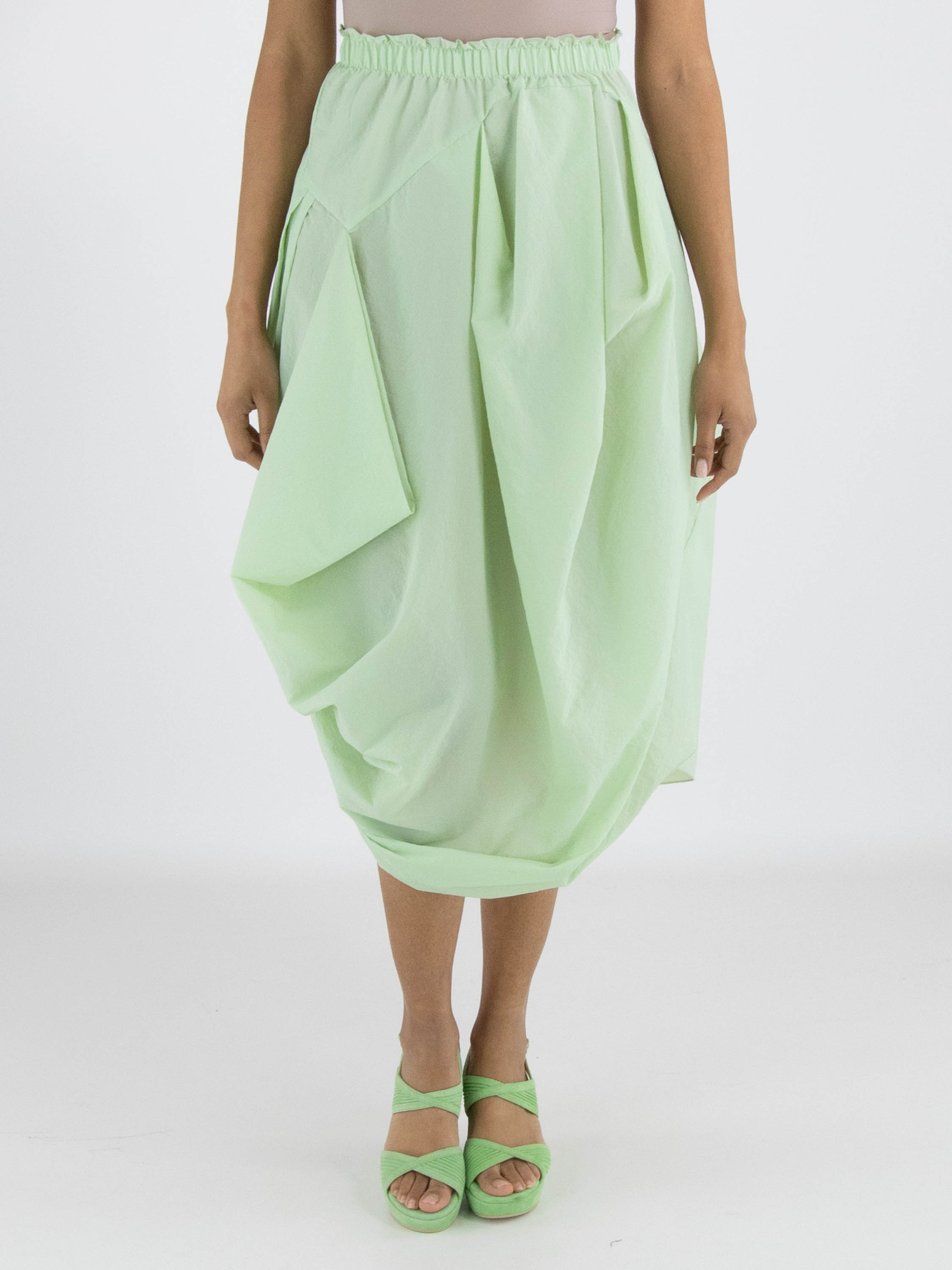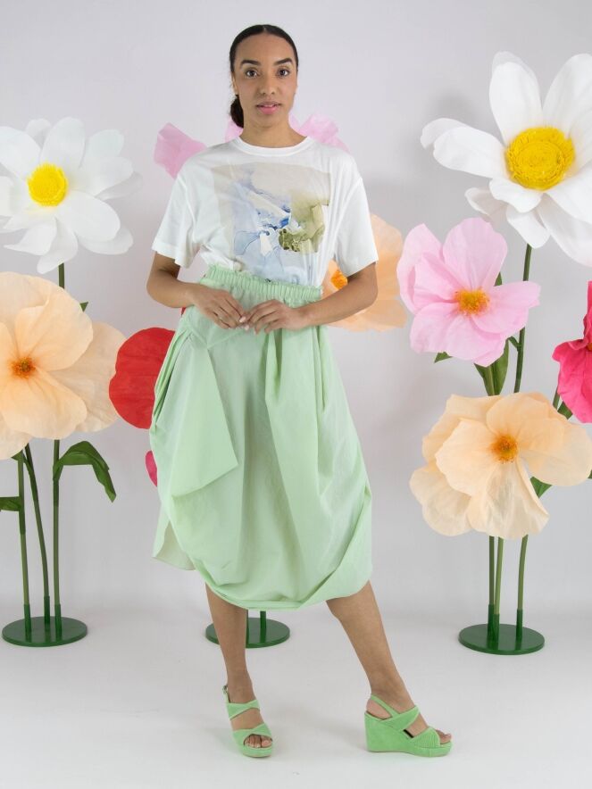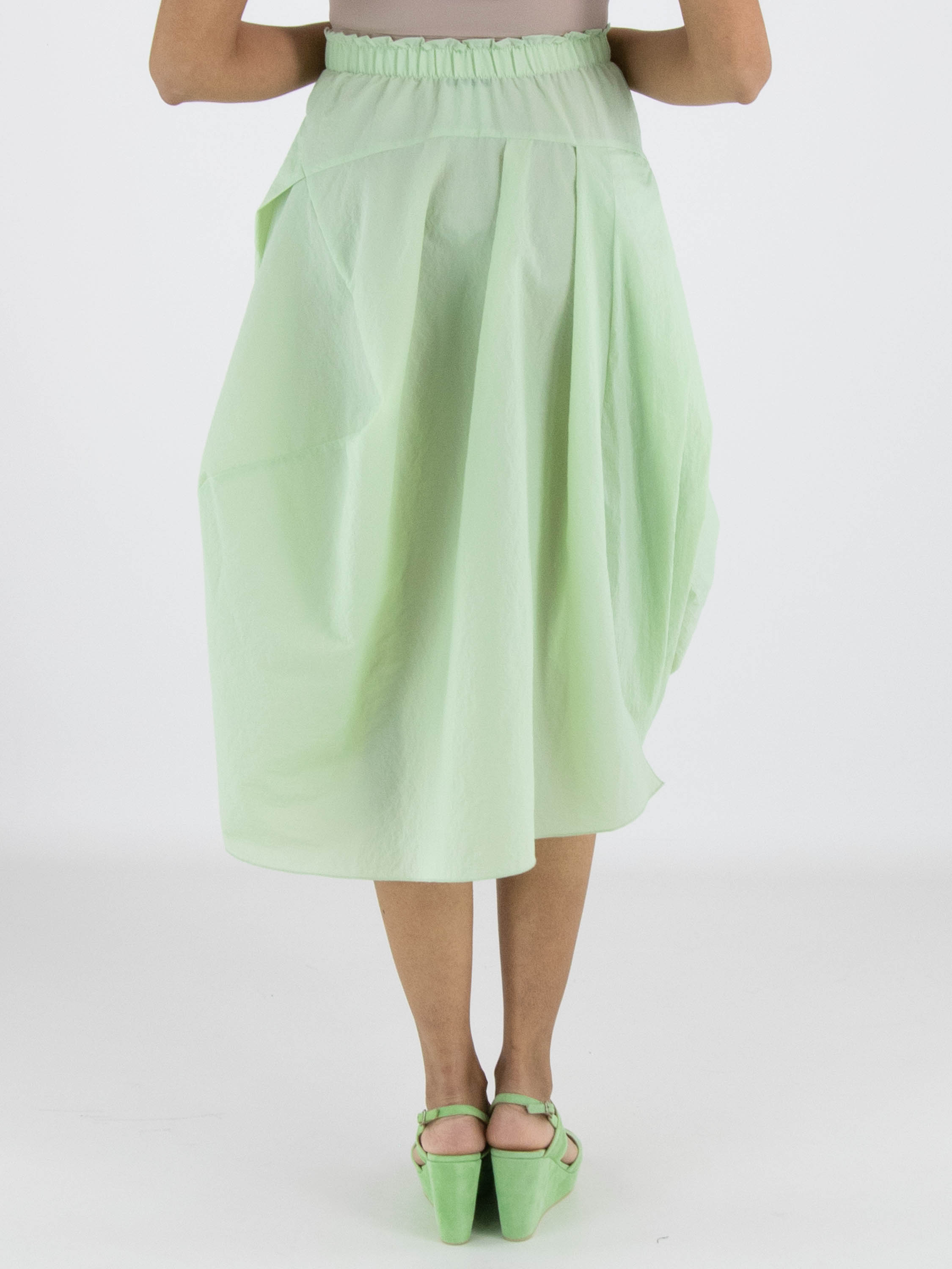 Ein Rock von High Lab aus einem nicht transparenten Fallschirmstoff in einem sanften Mintgrün. In der Taille befindet sich ein fein gereihter elastischer Bund. Der Rock hat eine Ballonform mit mehreren Falten, Nähten und diagonalen Plissees. Dieser Rock kann per Hand gewaschen werden.