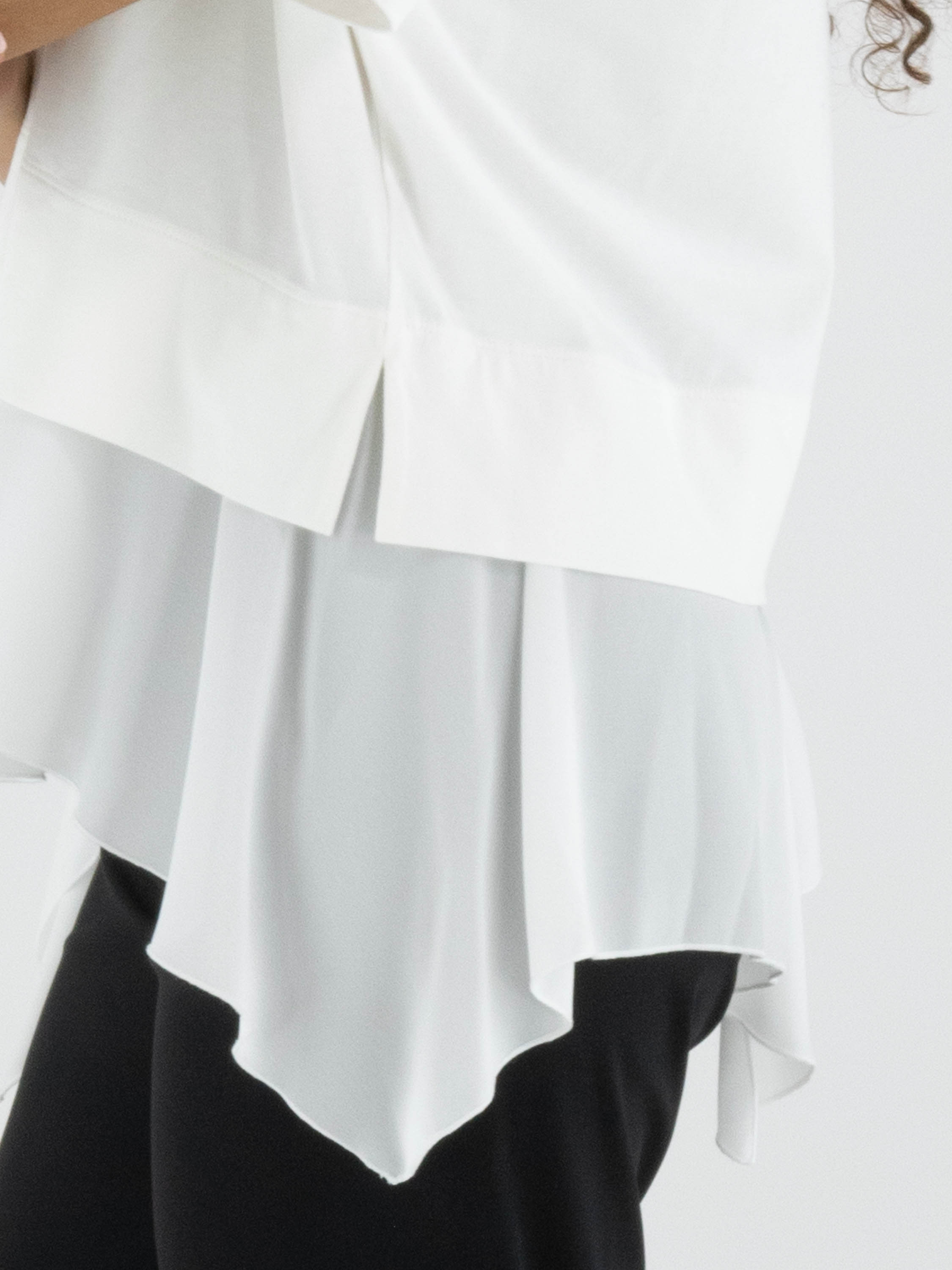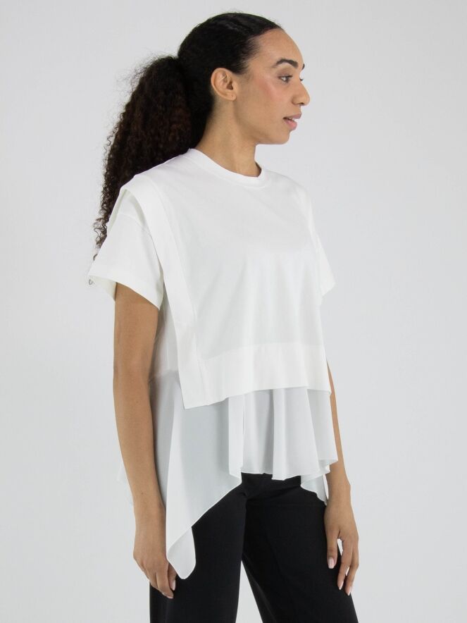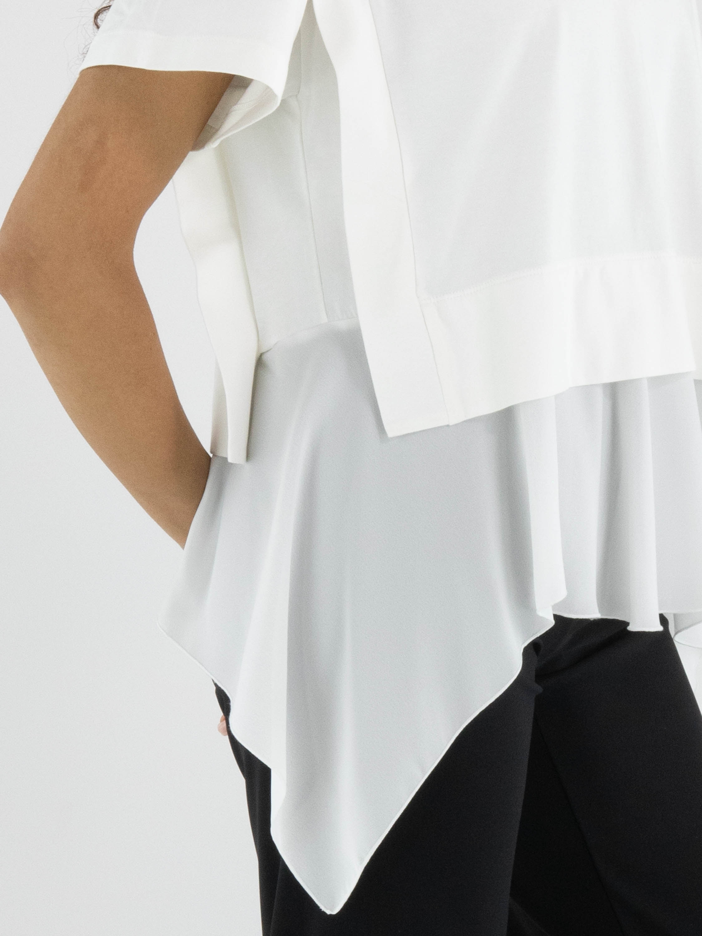 Shirt von High in Cremeweiß. Mit Rundhalsausschnitt und kurzen Ärmeln gearbeitet, verläuft an der rechten Seite eine Naht, nach der der Stoff dezent weiterfällt und so einen modernen, verspielten Effekt erzeugt. Am Saum tritt zusätzlich eine rund geschnittene, plissierte Voile-Schicht hervor und sorgt für eine raffinierte, mehrlagige Optik. Dieses exklusive Designershirt sollte per Hand gewaschen werden.