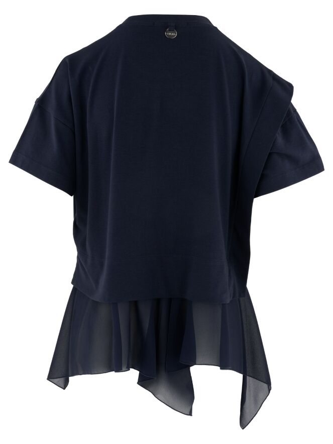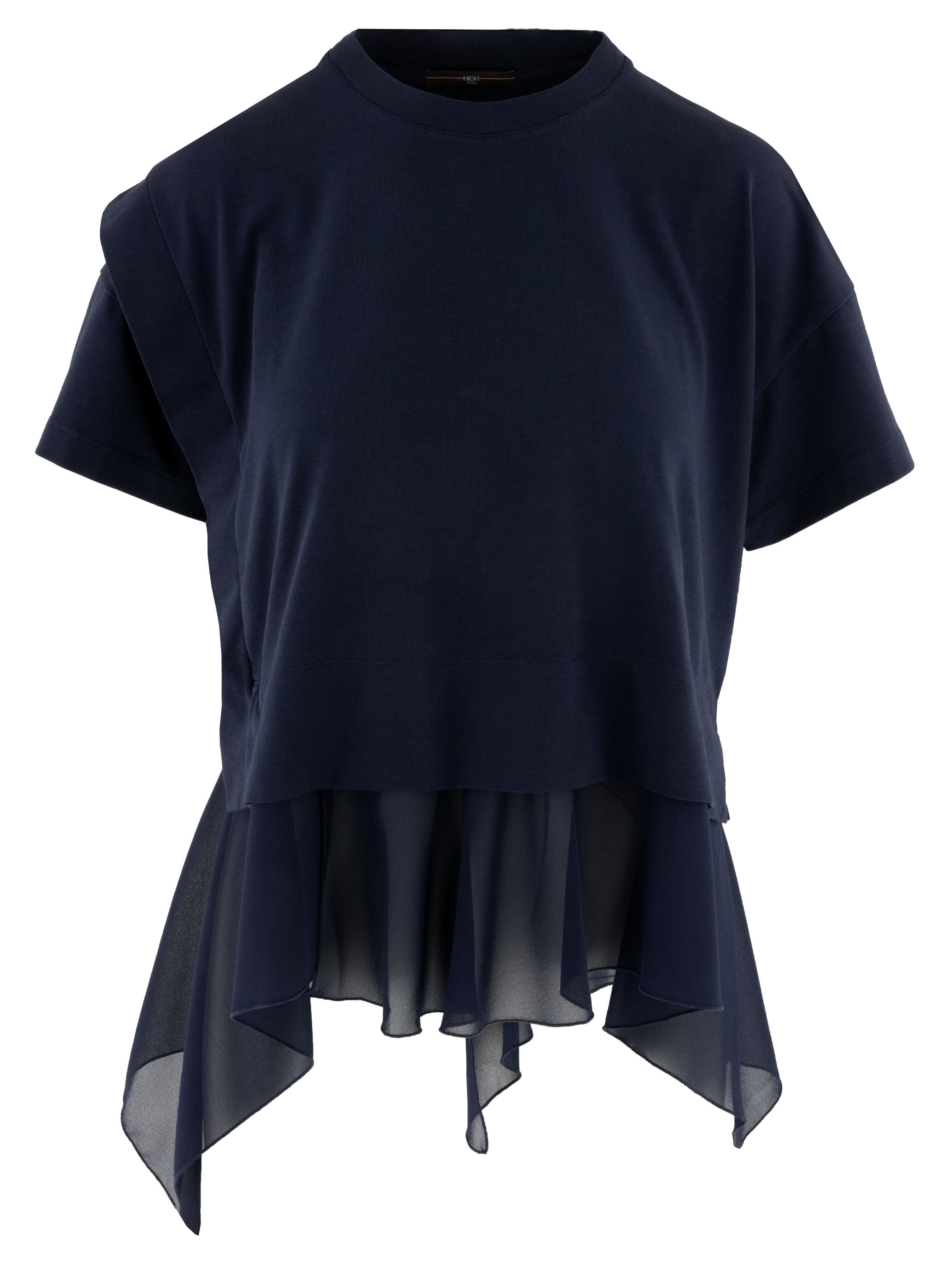 Shirt von High in Marineblau. Mit Rundhalsausschnitt und kurzen Ärmeln gestaltet, zeigt es an der rechten Seite eine Naht, an der der Stoff dezent weiterläuft und so einen asymmetrischen Effekt erzeugt. Am Saum setzt sich der Stoff fort und gibt eine rund geschnittene, fein plissierte Voile-Schicht frei, die dem Design Leichtigkeit und Raffinesse verleiht. Dieses exklusive Designershirt sollte per Hand gewaschen werden.