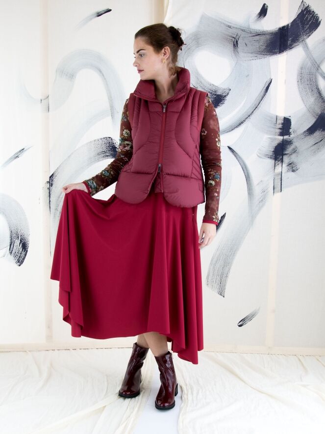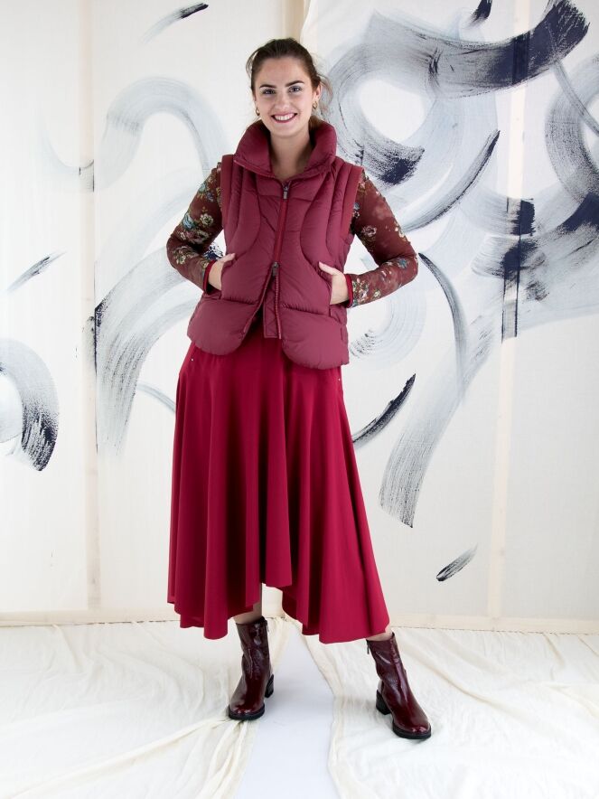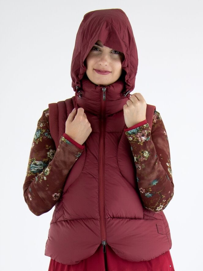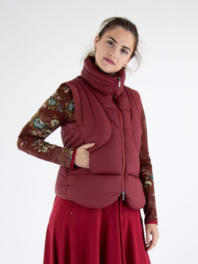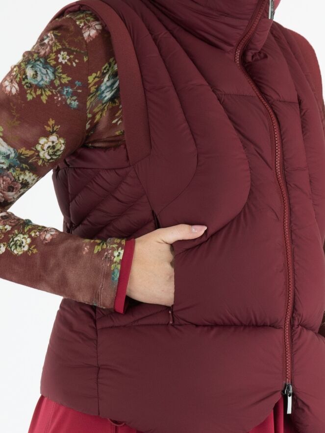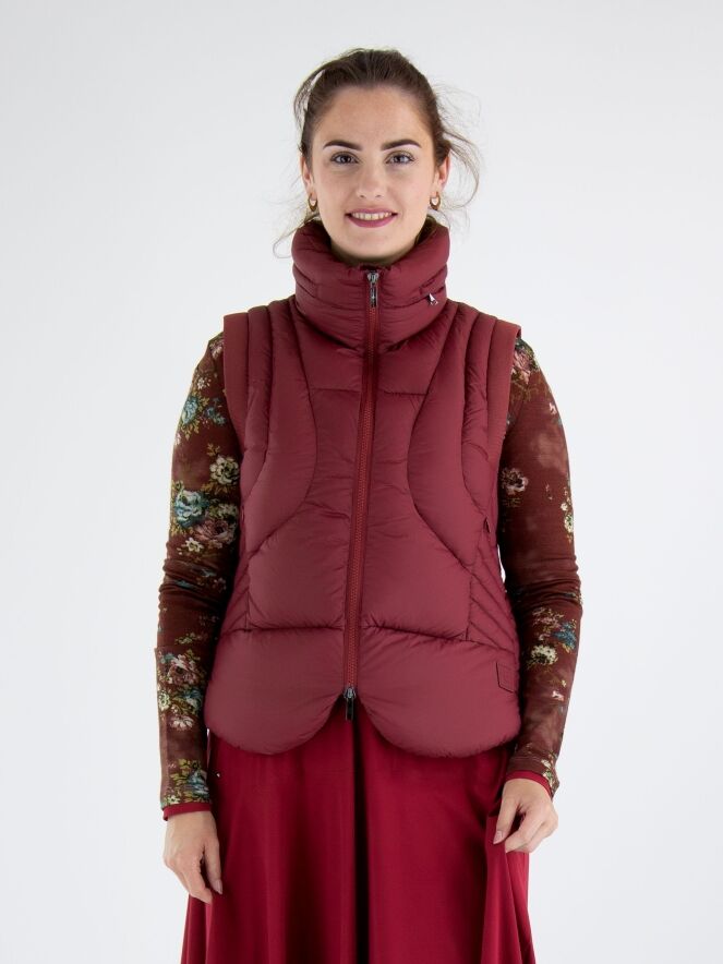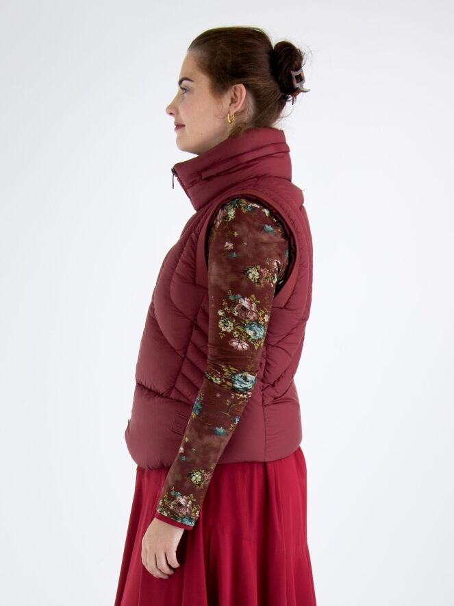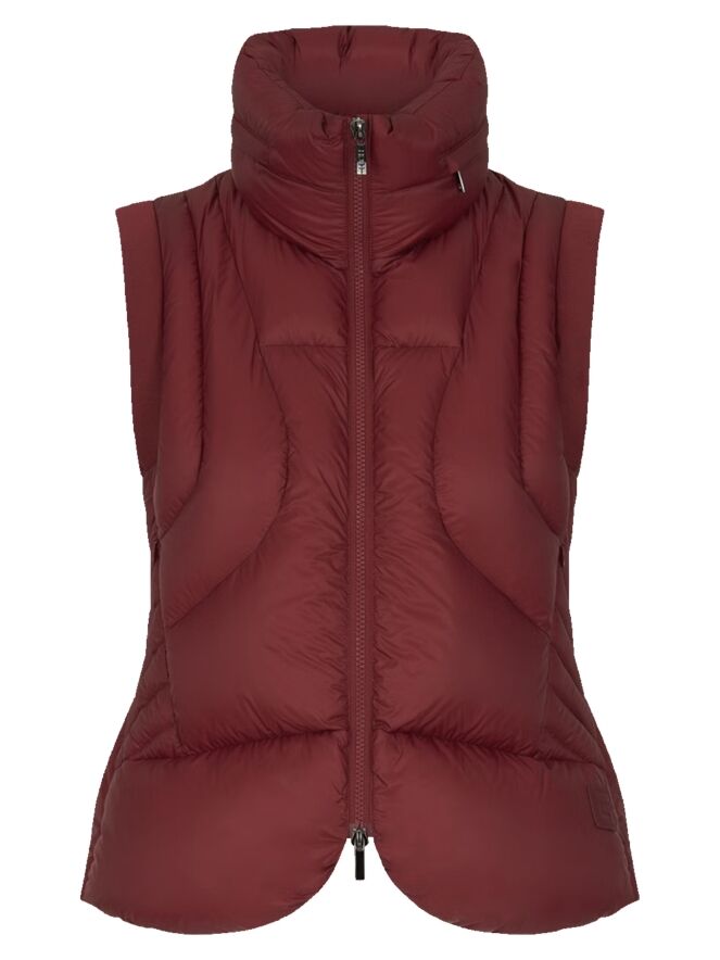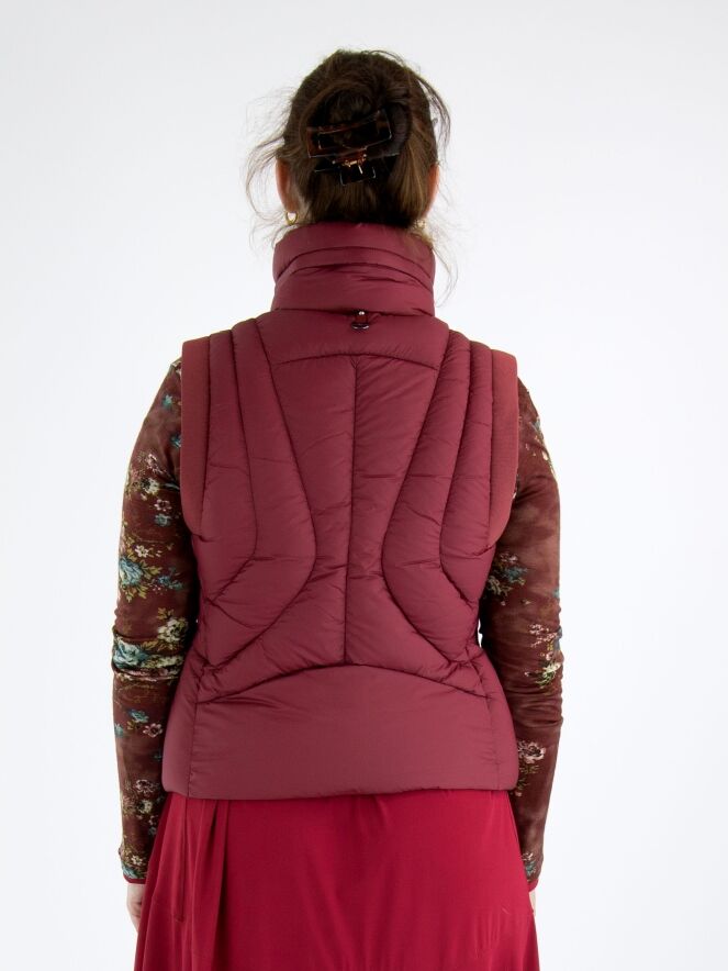 Eine gesteppte Weste von High in Bordeauxrot. Die Weste verfügt über Einschubtaschen mit Reißverschluss und Kordeln am Saum, um einen Plissee-Effekt zu erzeugen. Entlang der Kanten der Armausschnitte befinden sich fein gerippte Strickbündchen. Diese Weste kann bei 30 Grad gewaschen werden.