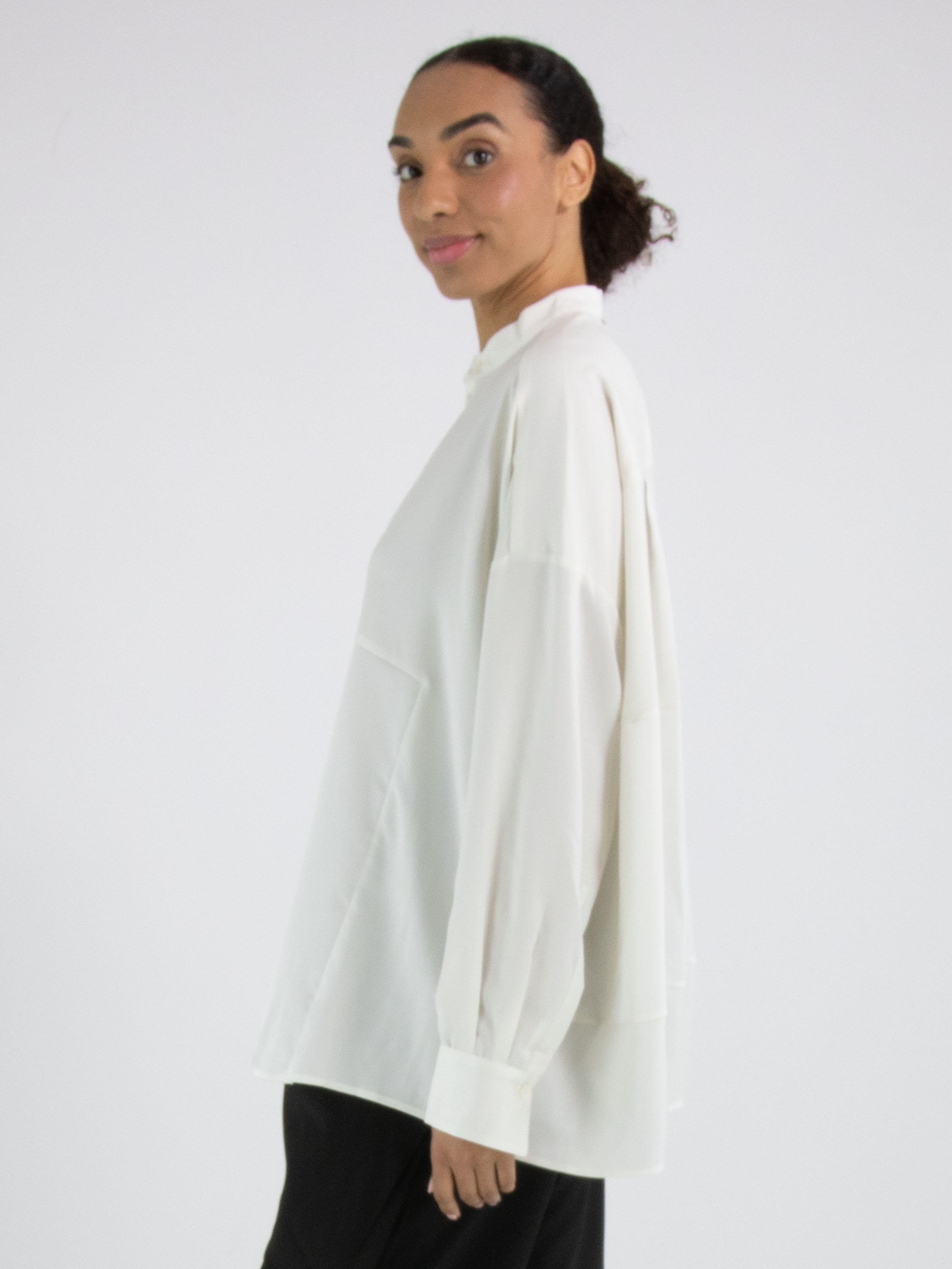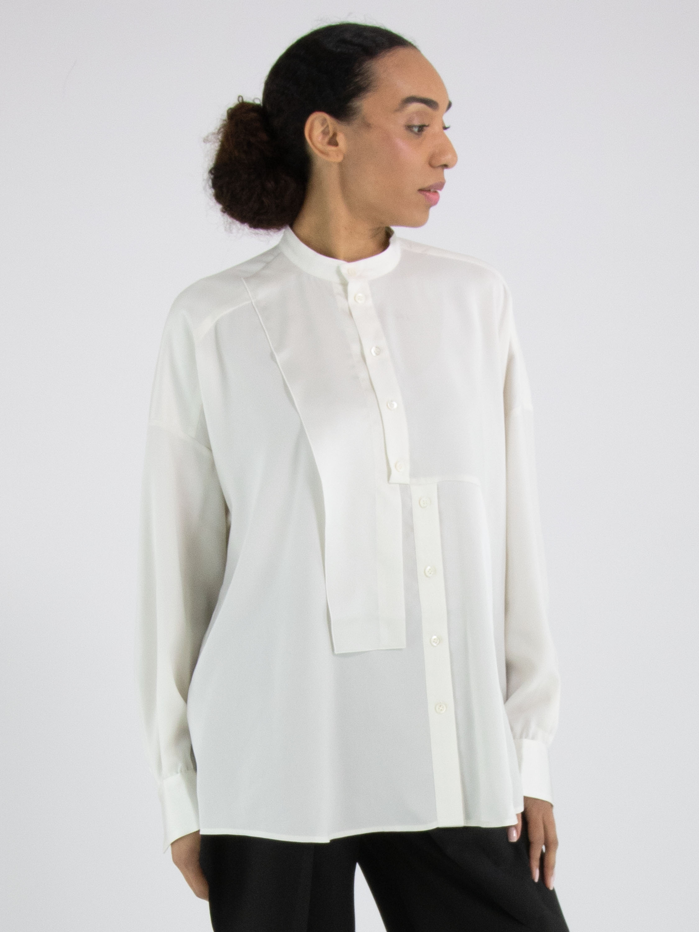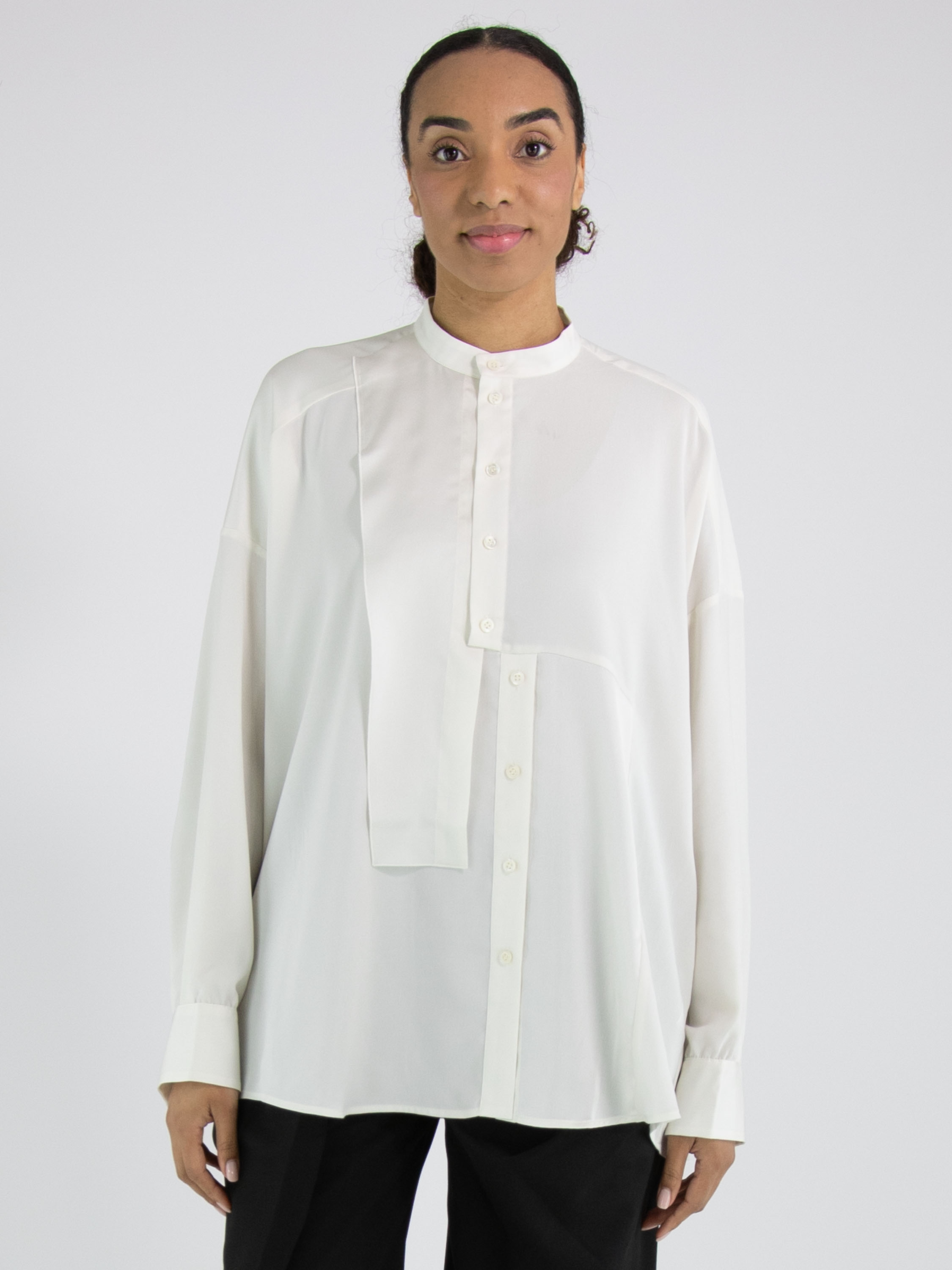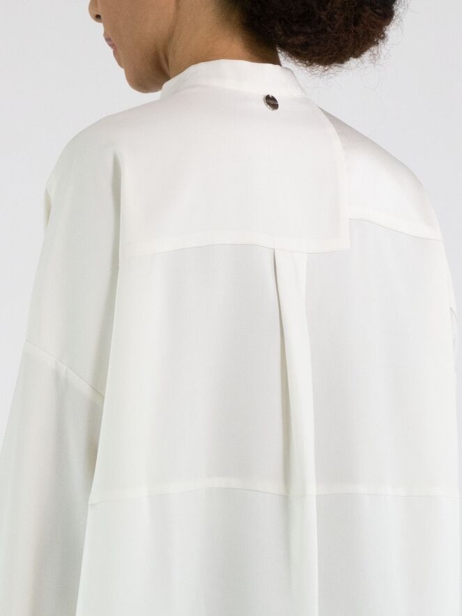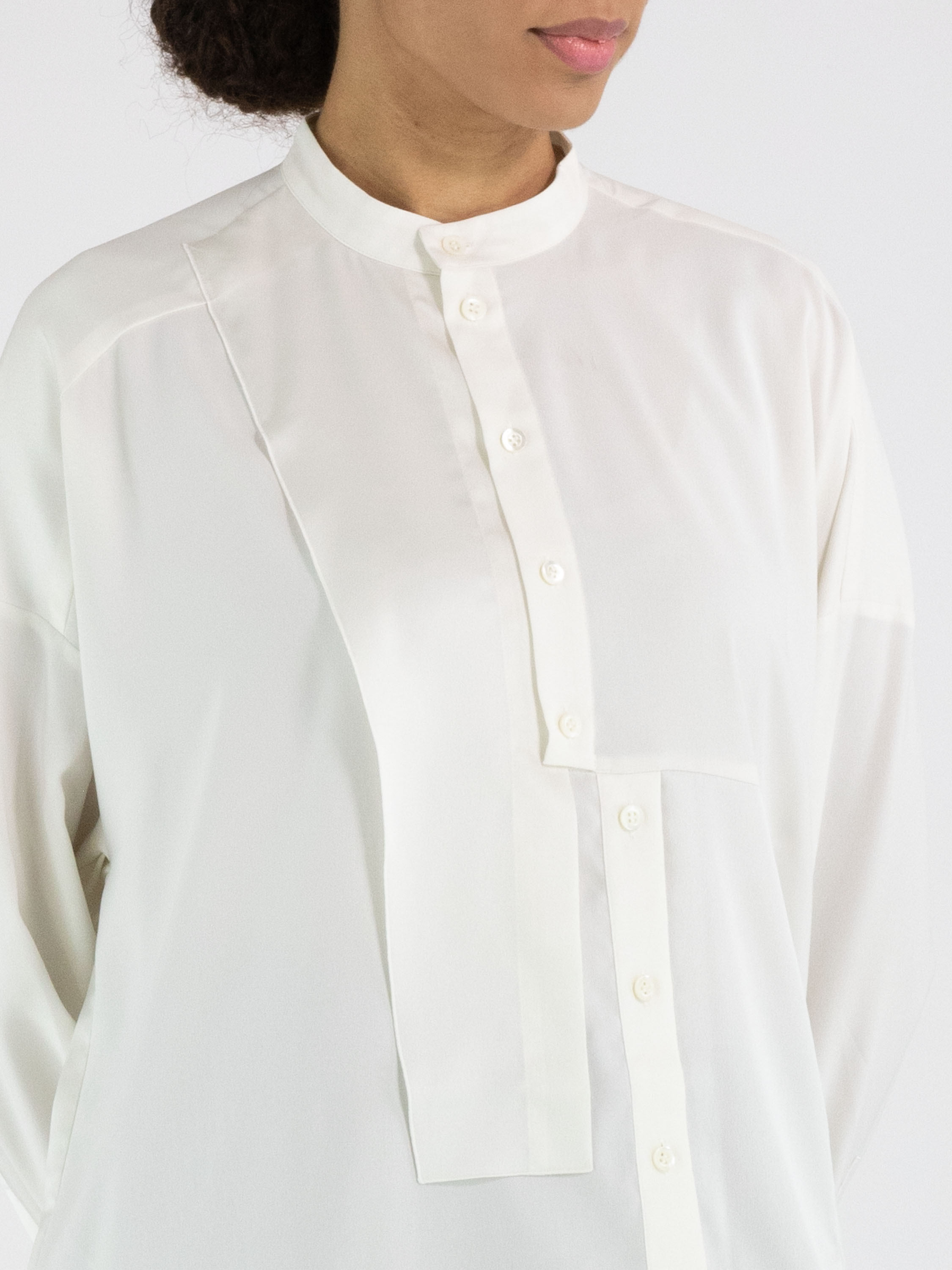 Eine Bluse von High Tech in Cremeweiß. Der Stoff ist teils matt und teils matt satiniert. Vom Halsausschnitt bis unterhalb der Brust ist die Knopfleiste mittig platziert. Ab unterhalb der Brust ist die Knopfleiste einige Zentimeter nach rechts versetzt, wodurch sich die Bluse nicht vollständig öffnen lässt. An den Kanten der Manschetten der langen Ärmel ist der Stoff fein gelegt. Diese Bluse kann per Hand gewaschen werden.