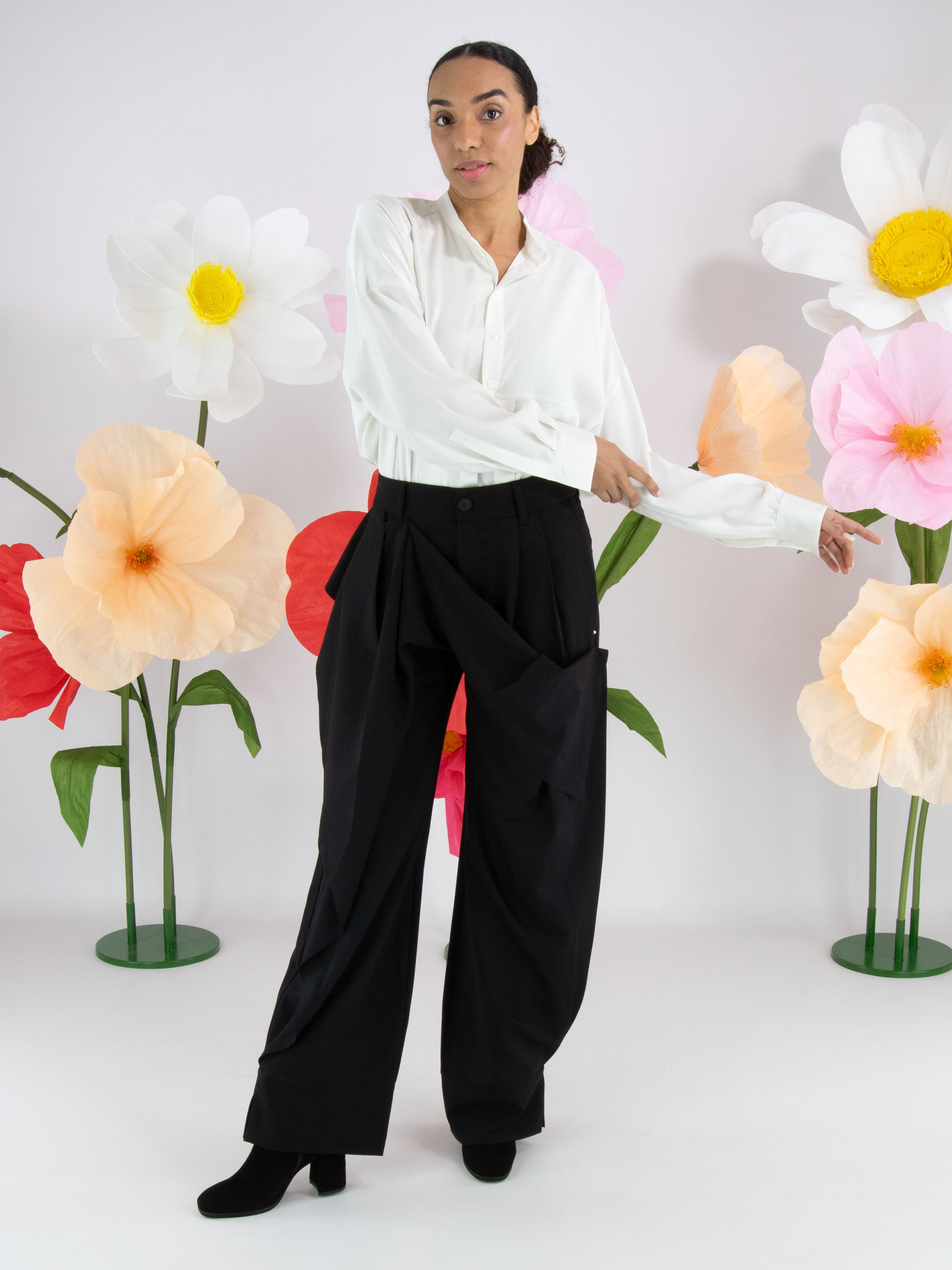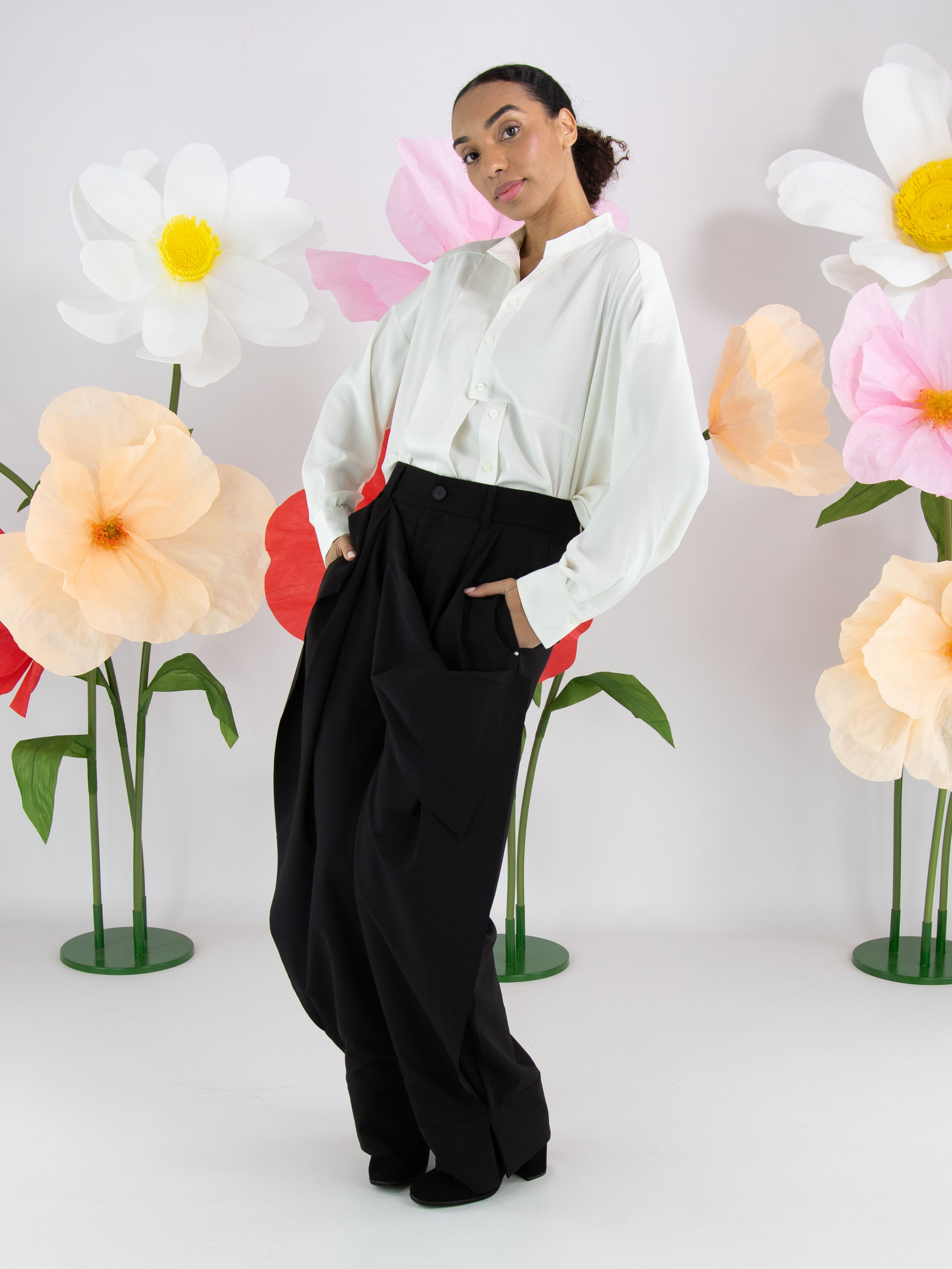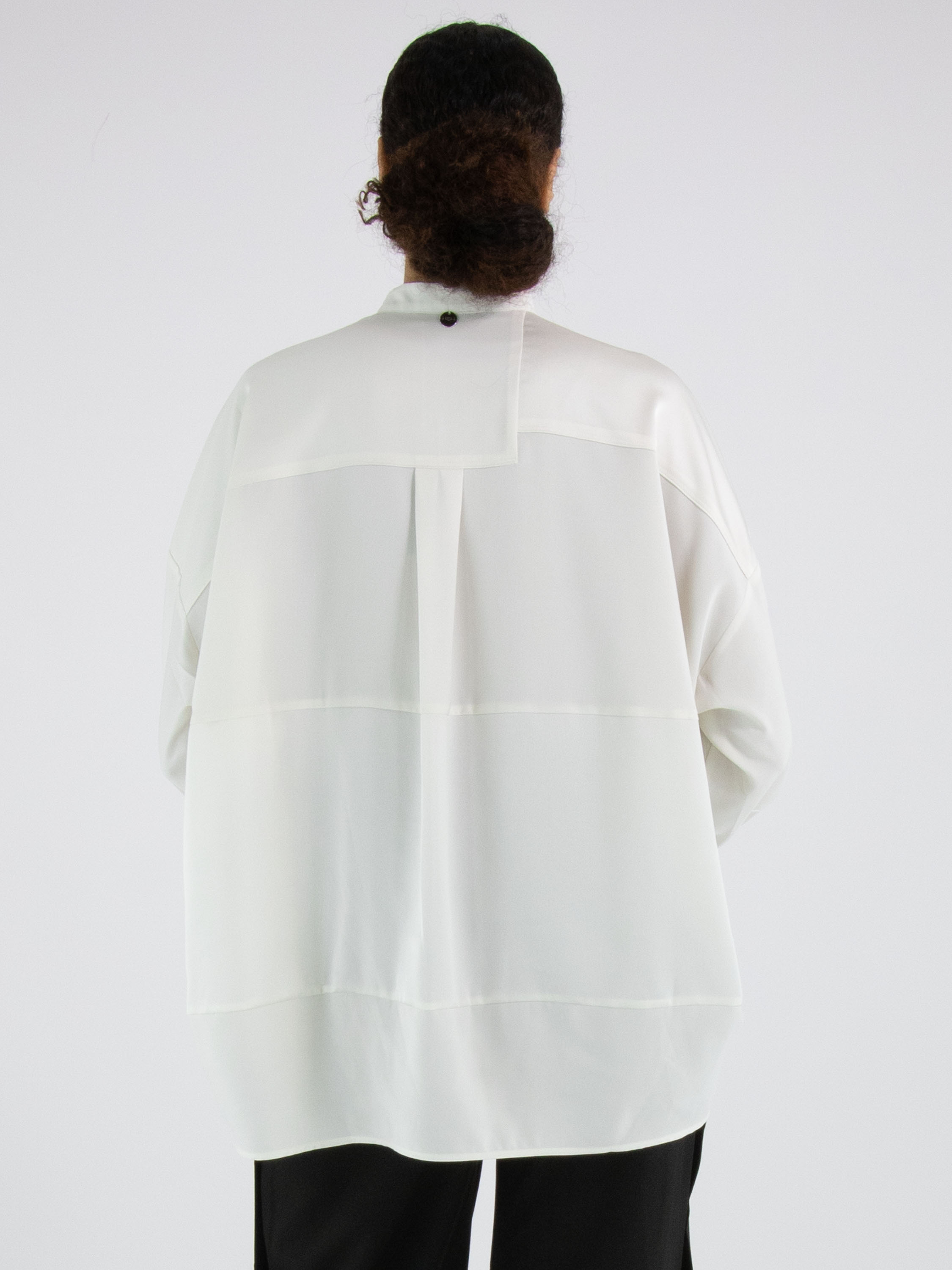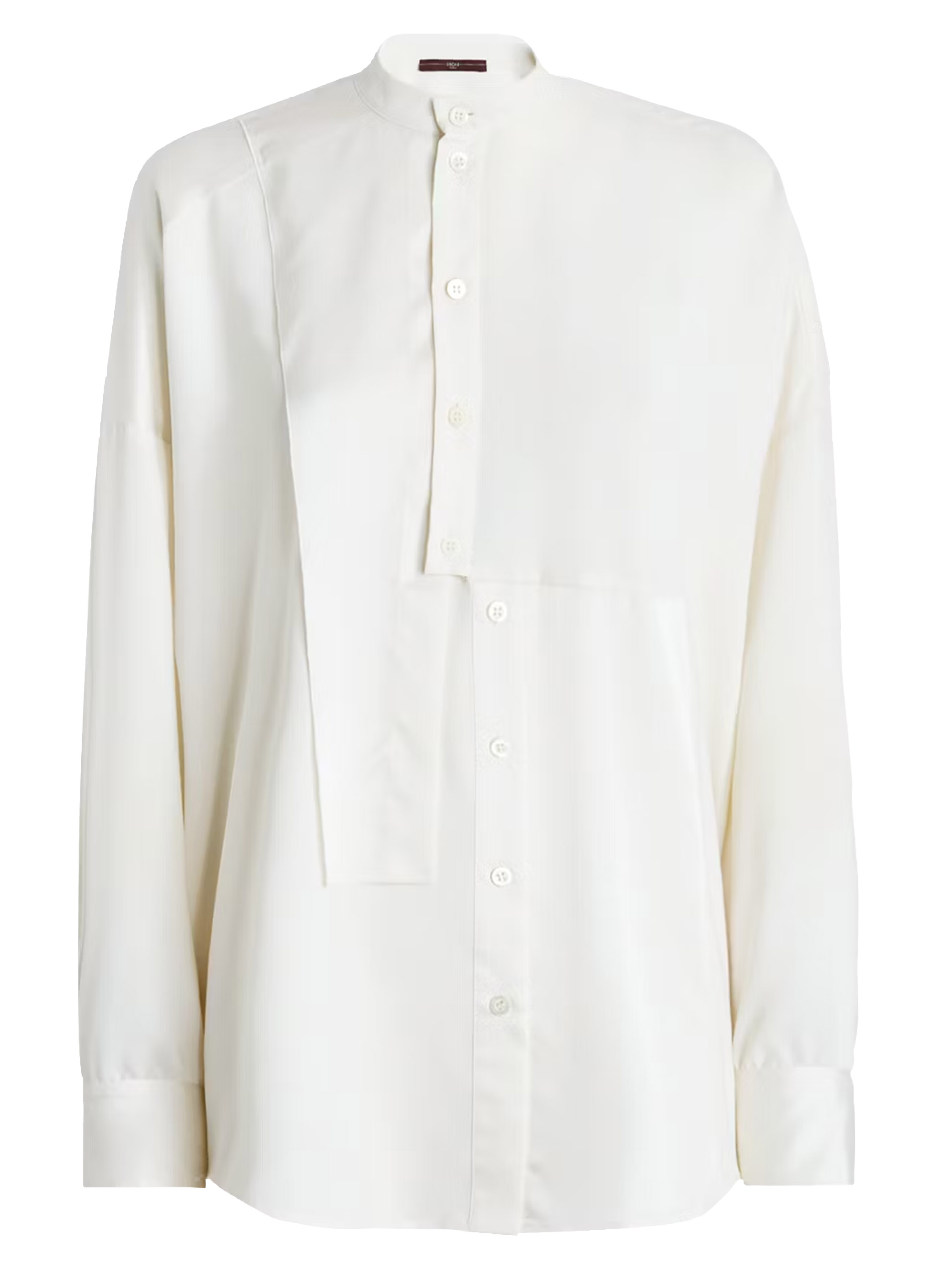Eine Bluse von High Tech in Cremeweiß. Der Stoff ist teils matt und teils matt satiniert. Vom Halsausschnitt bis unterhalb der Brust ist die Knopfleiste mittig platziert. Ab unterhalb der Brust ist die Knopfleiste einige Zentimeter nach rechts versetzt, wodurch sich die Bluse nicht vollständig öffnen lässt. An den Kanten der Manschetten der langen Ärmel ist der Stoff fein gelegt. Diese Bluse kann per Hand gewaschen werden.