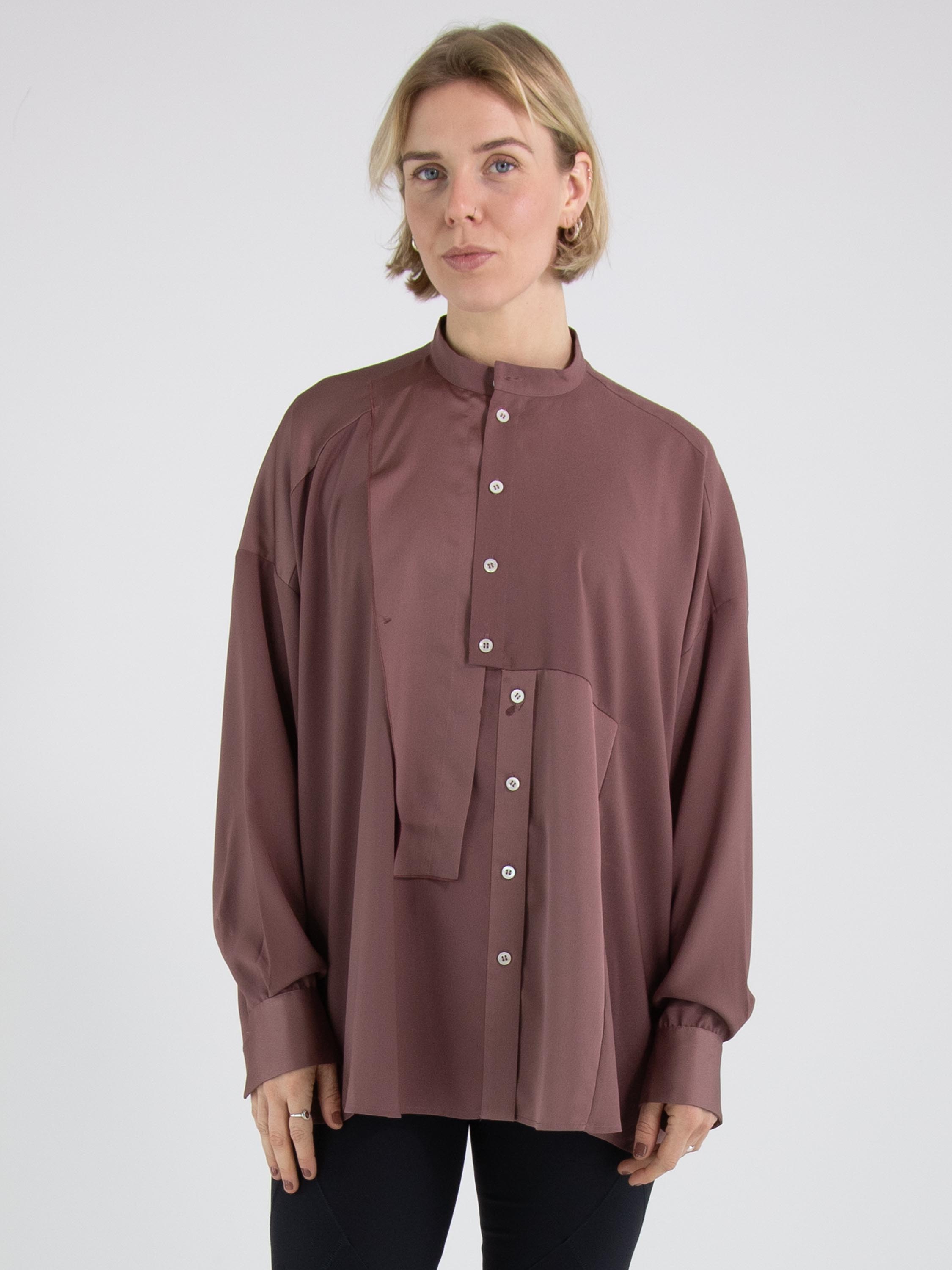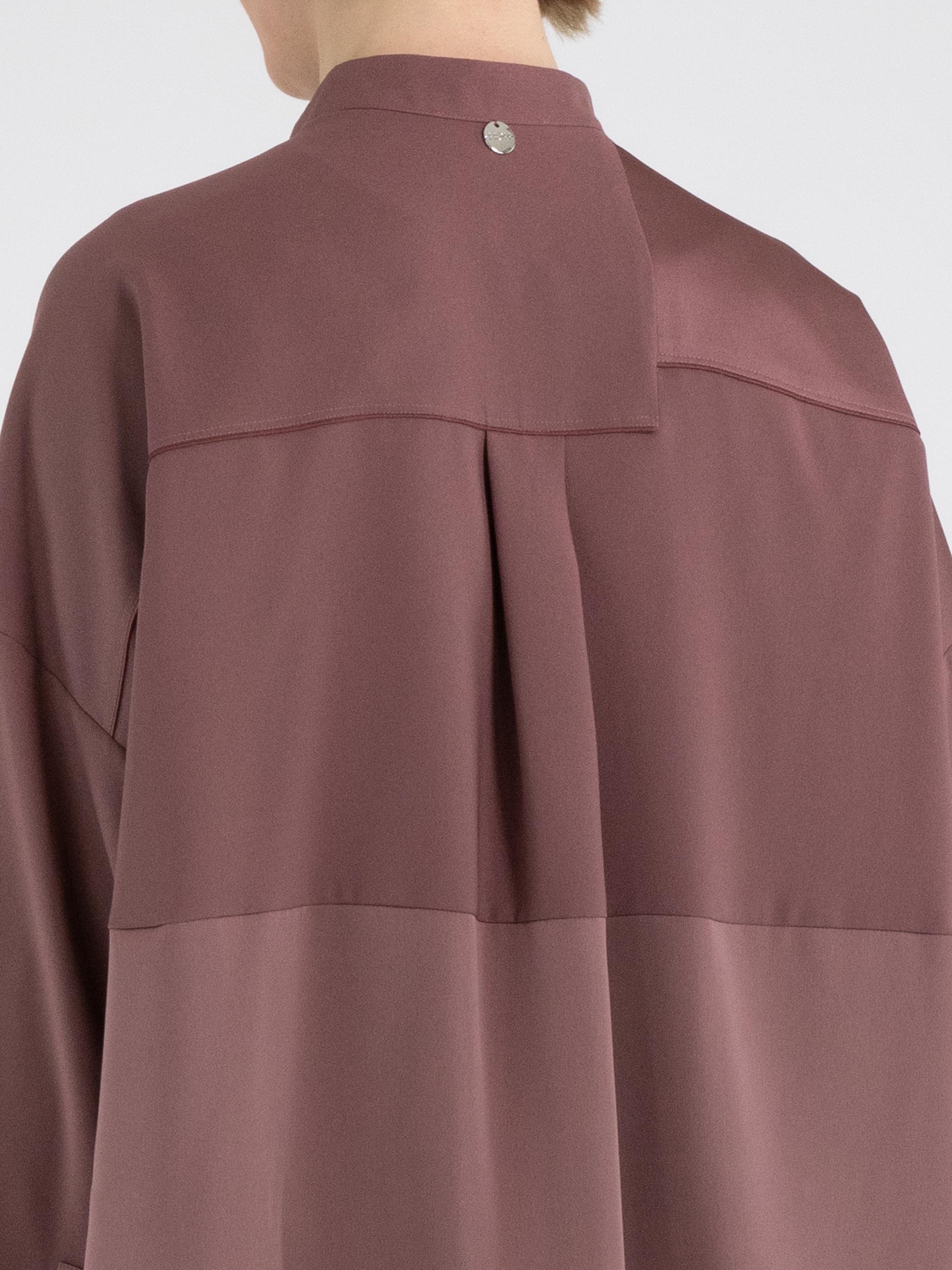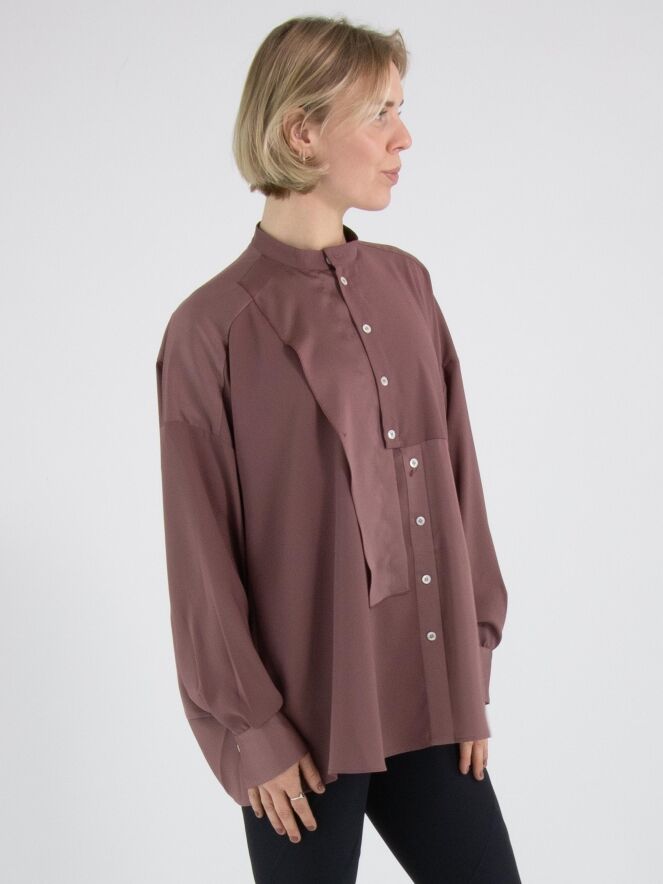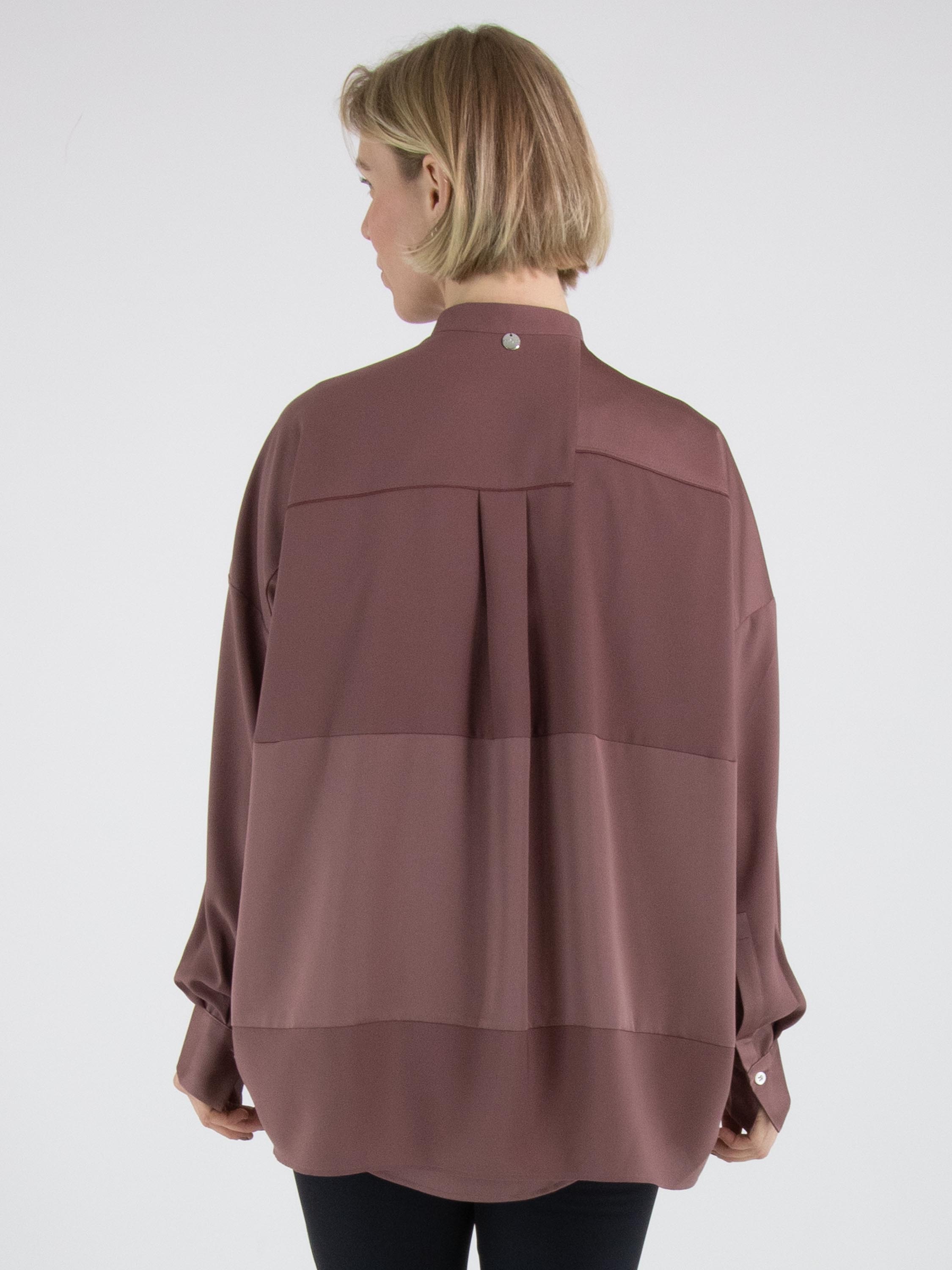 Eine Bluse von High Tech in der Farbe Mauve. Der Stoff ist teilweise matt und teilweise matt satiniert. Vom Halsausschnitt bis unter die Brust ist die Knopfleiste zentriert. Ab unterhalb der Brust ist die Knopfleiste um einige Zentimeter nach rechts versetzt, wodurch sich die Bluse nicht vollständig öffnen lässt. Entlang der Kanten der langen Ärmelmanschetten ist der Stoff fein gelegt. Diese Bluse kann per Hand gewaschen werden.