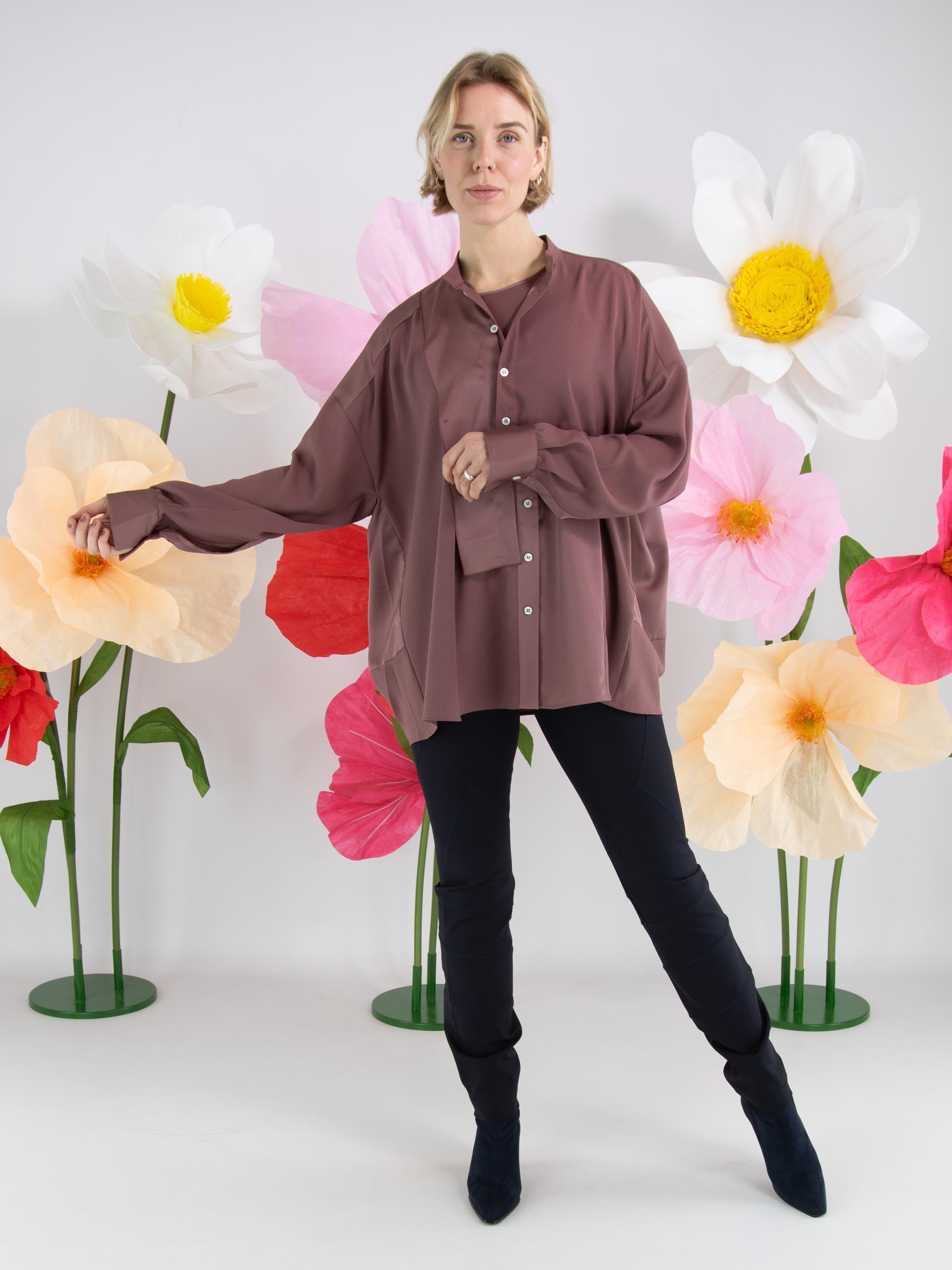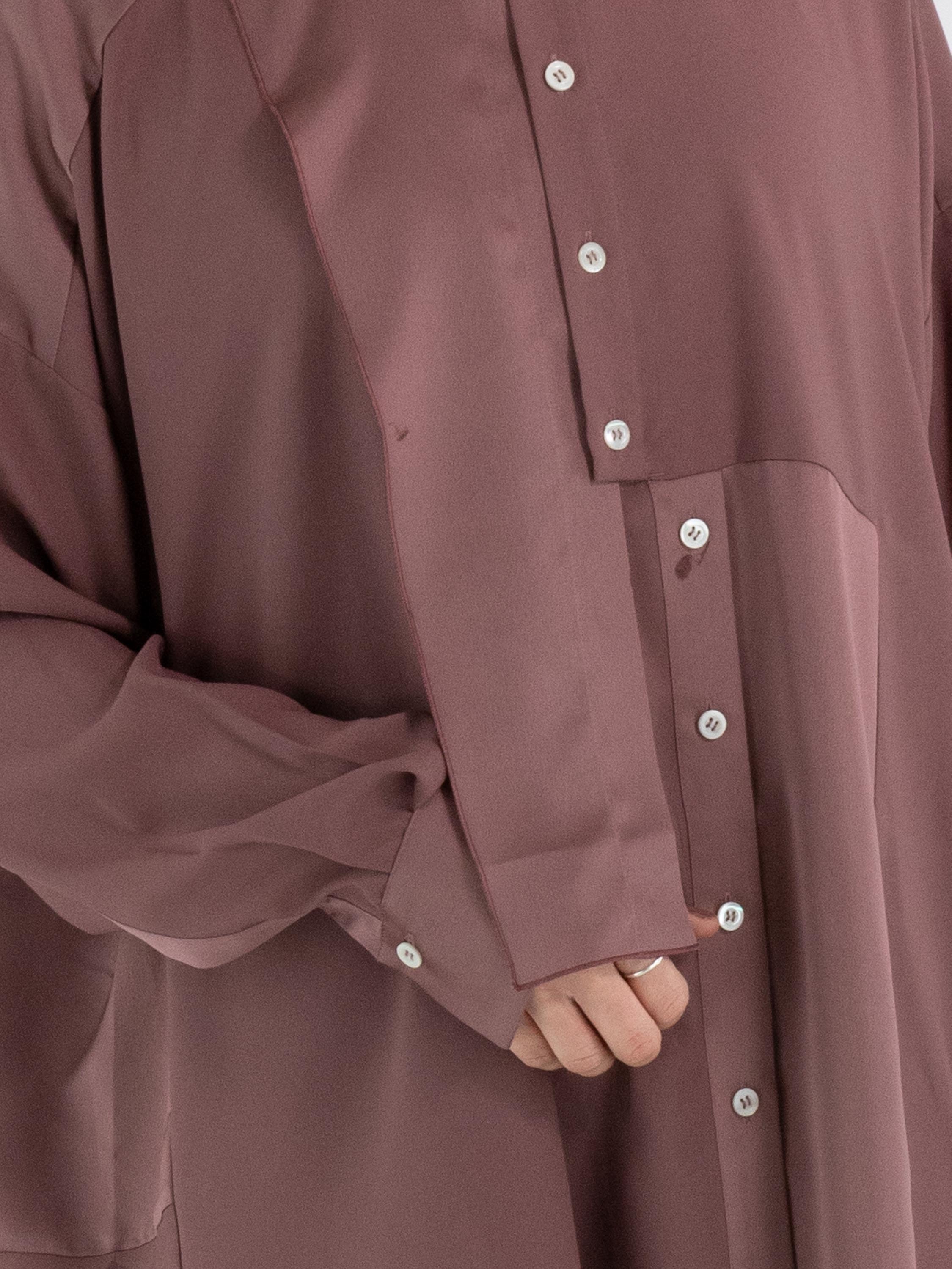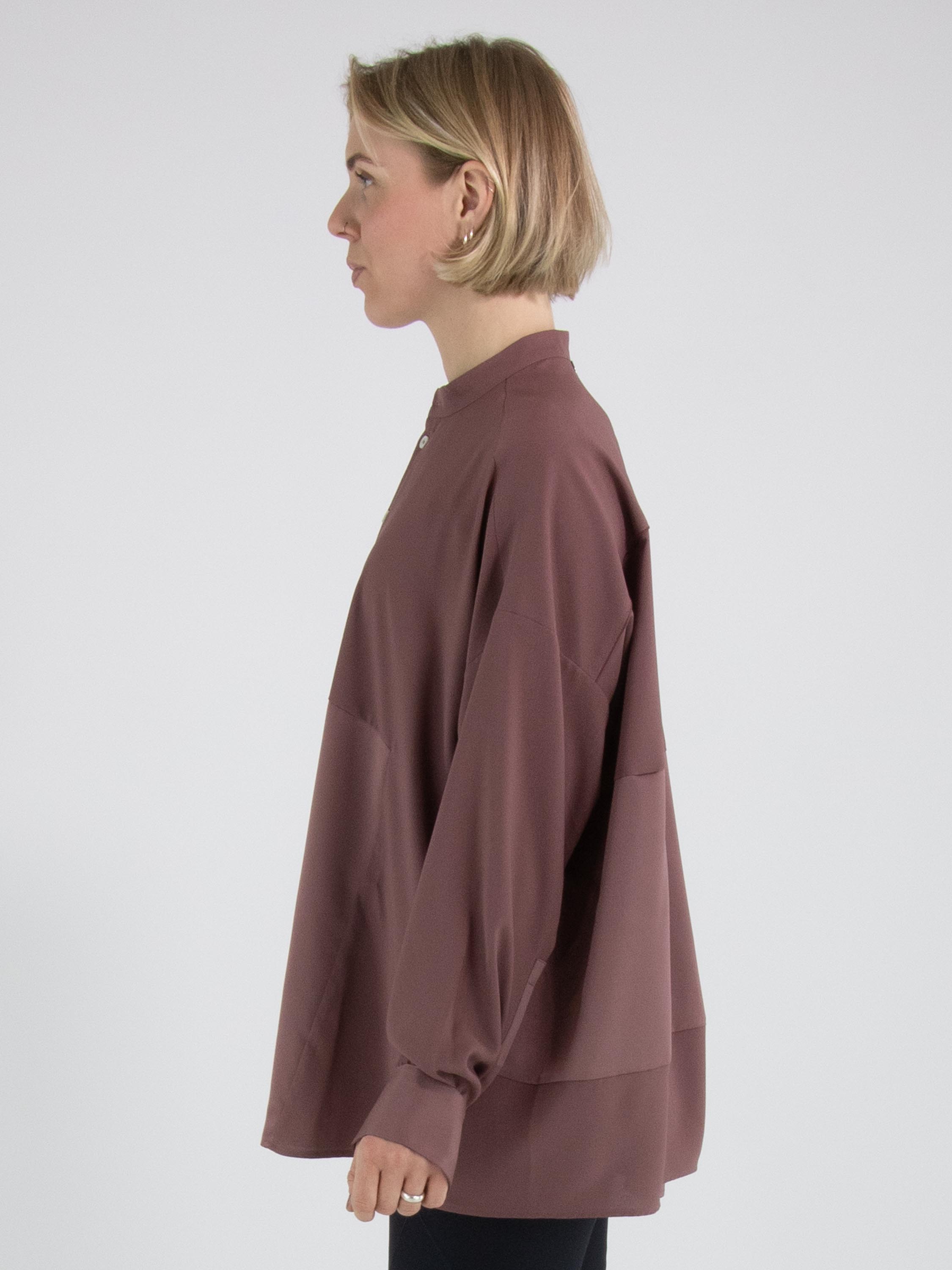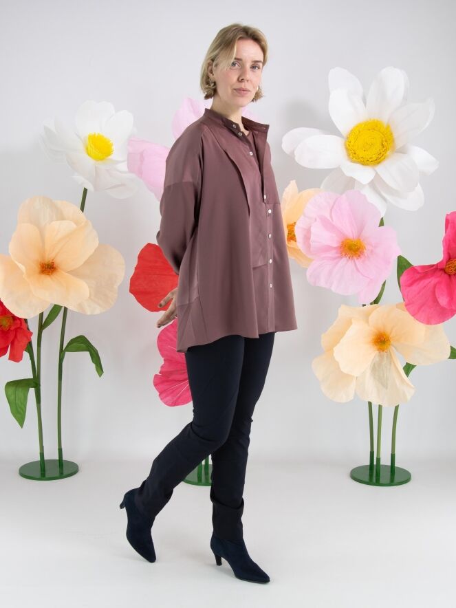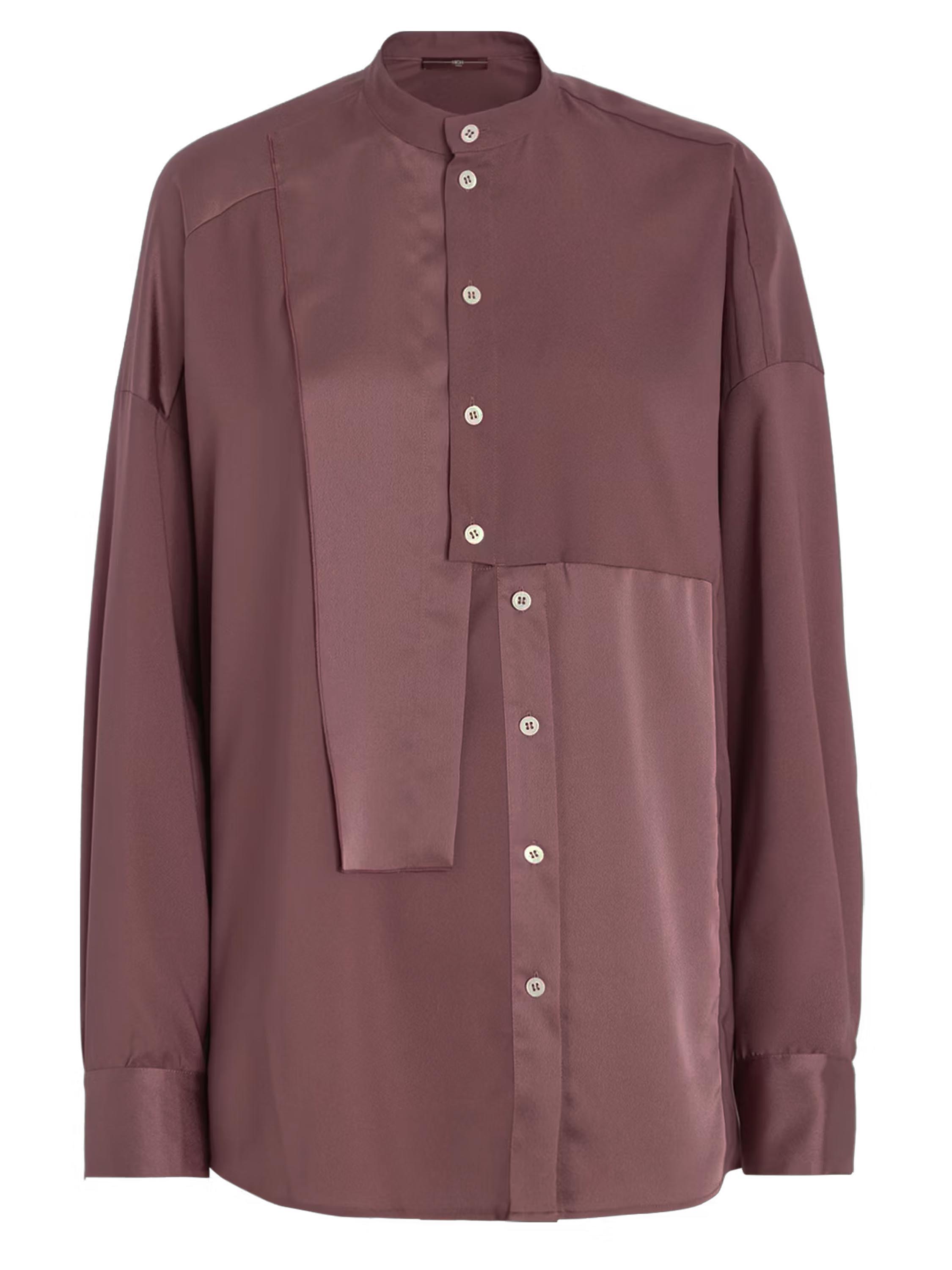 Eine Bluse von High Tech in der Farbe Mauve. Der Stoff ist teilweise matt und teilweise matt satiniert. Vom Halsausschnitt bis unter die Brust ist die Knopfleiste zentriert. Ab unterhalb der Brust ist die Knopfleiste um einige Zentimeter nach rechts versetzt, wodurch sich die Bluse nicht vollständig öffnen lässt. Entlang der Kanten der langen Ärmelmanschetten ist der Stoff fein gelegt. Diese Bluse kann per Hand gewaschen werden.