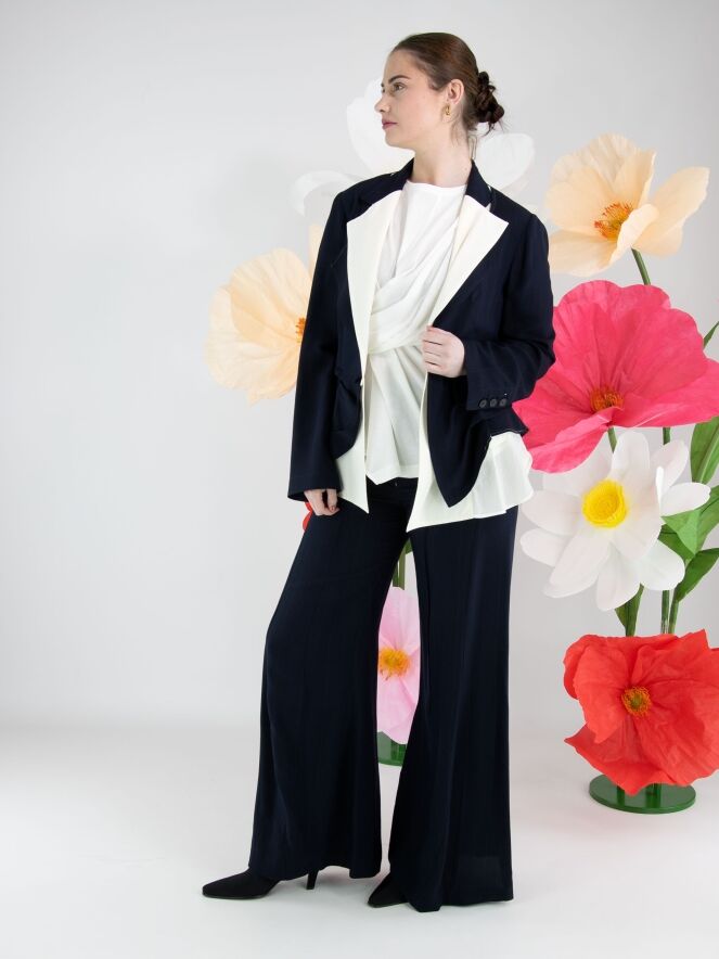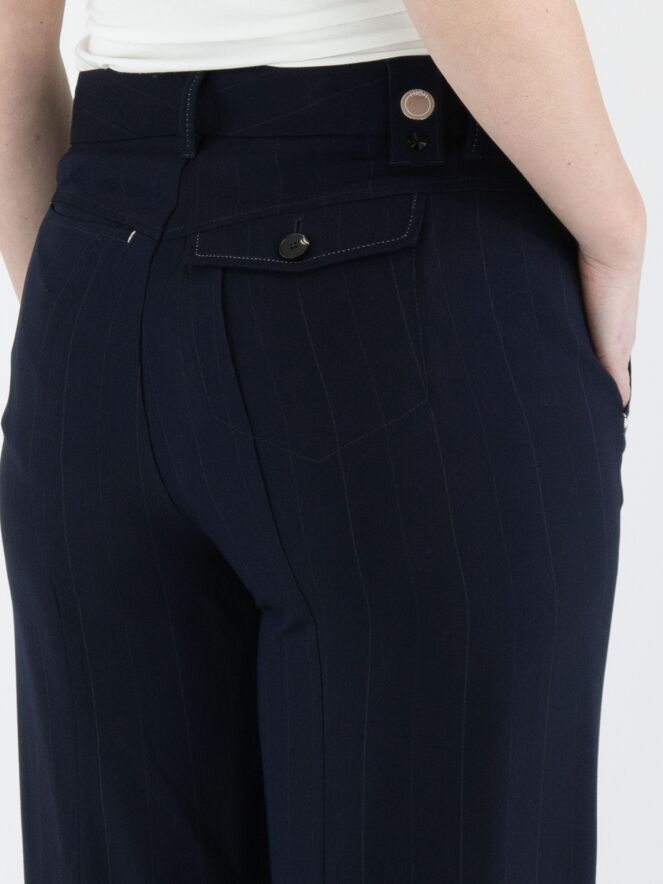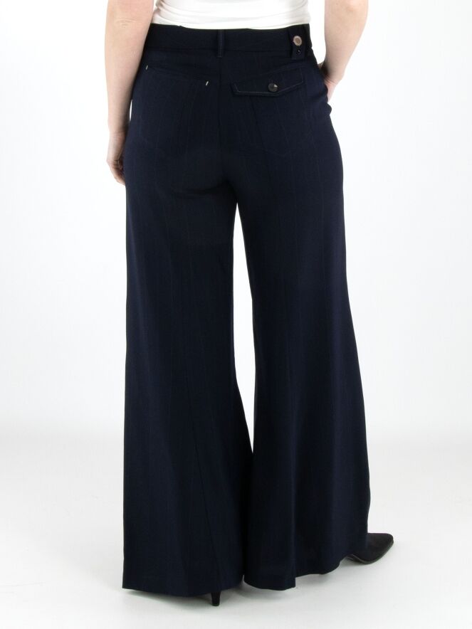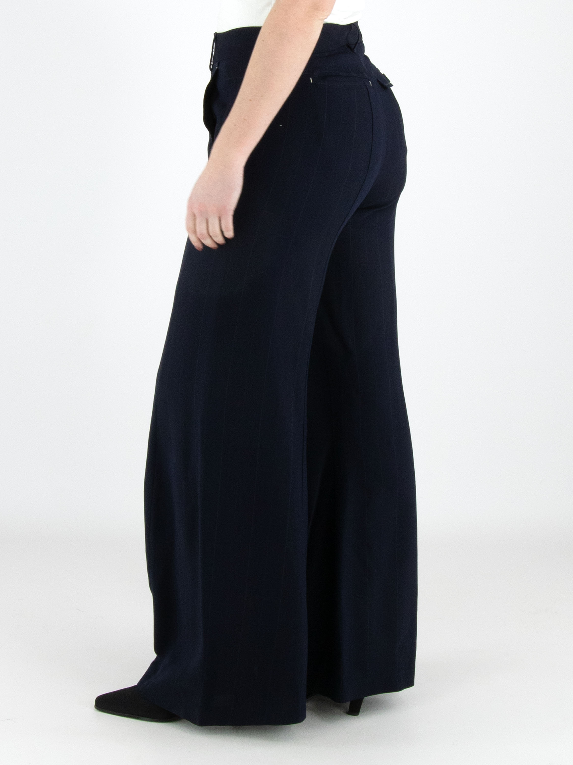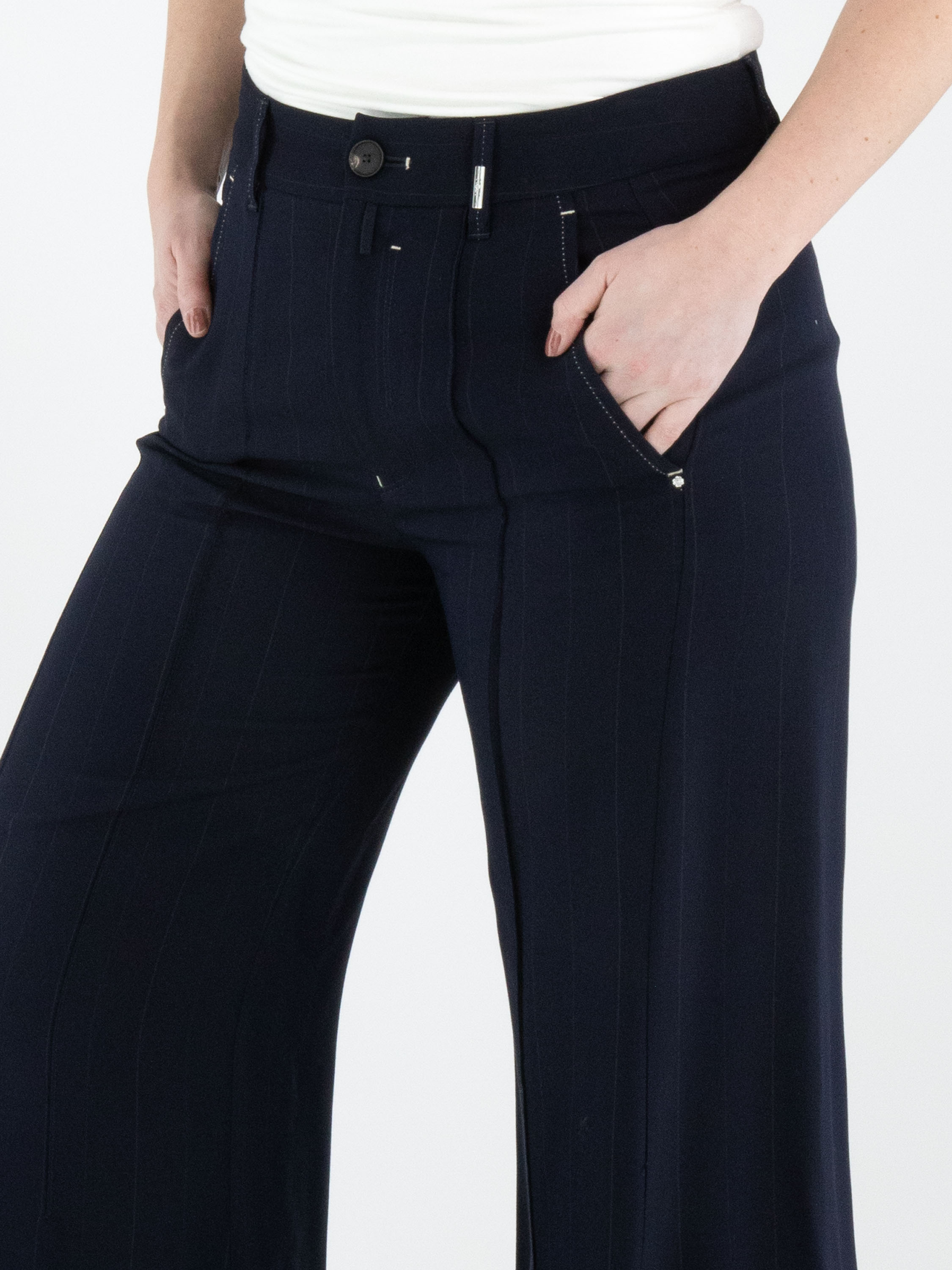 Eine Design-Schlaghose von High, die am unteren Ende sehr weit ausgestellt ist. Der Stoff ist in einem Nadelstreifenmuster gearbeitet. Vorne verläuft eine Naht und eine umgekehrte Naht. In den Rändern der Eingrifftaschen ist ein weißer Faden eingearbeitet. Hinten hat die Hose zwei Taschen, eine davon mit Umschlag. Diese Hose darf nicht gewaschen werden.