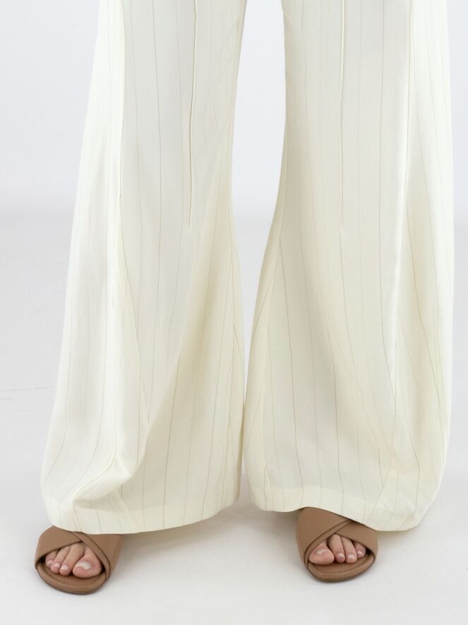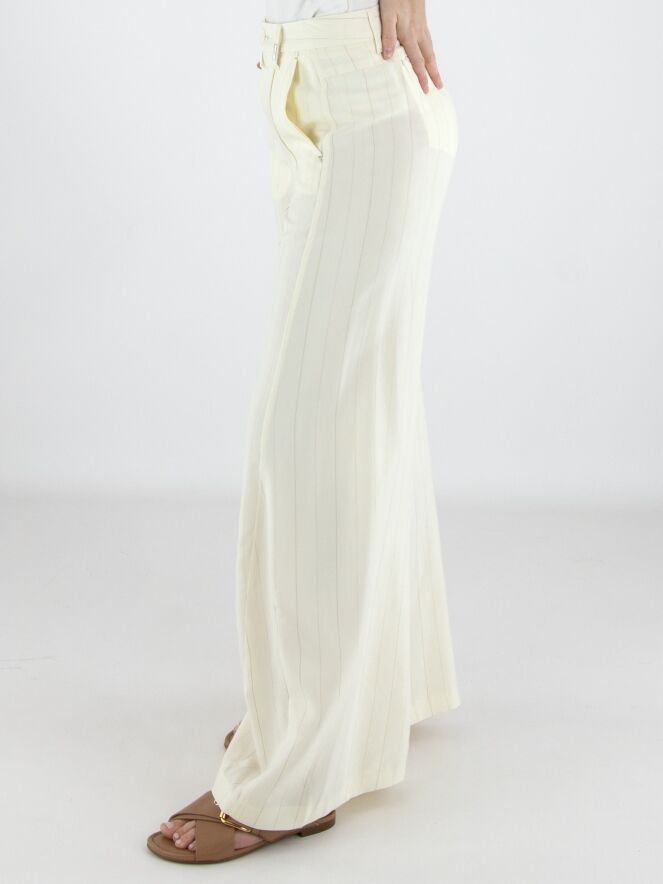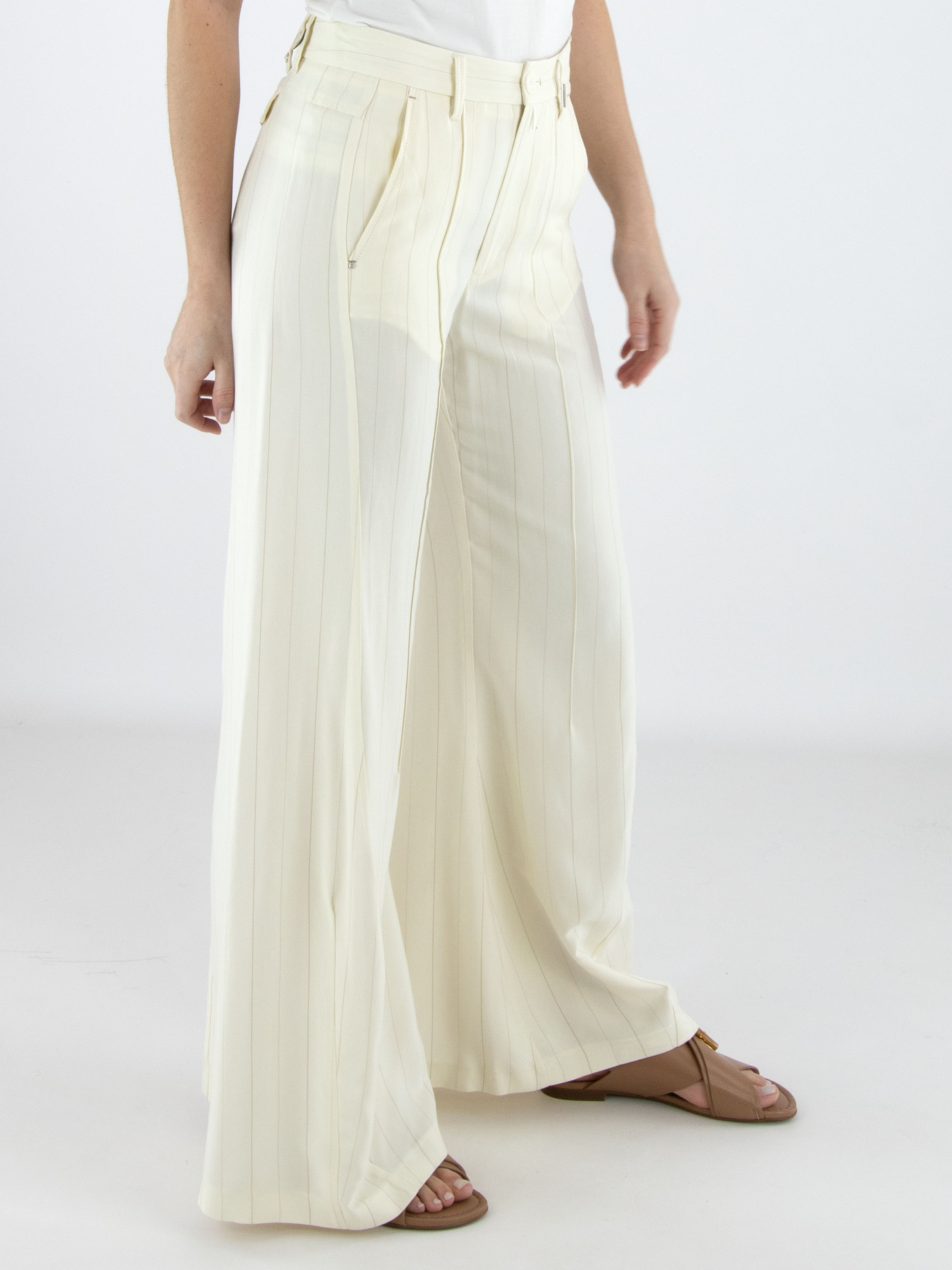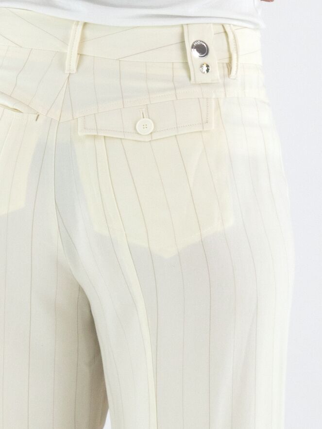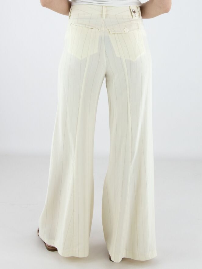 Weite Hose von High in einem edlen Nadelstreifenmuster in Cremeweiß und Camel. Die Hosenbeine verlaufen in einer dezenten Flared-Linie und verleihen dem Modell eine feminine, moderne Silhouette. Mit Eingrifftaschen versehen, darf diese exklusive Designerhose nicht gewaschen werden.