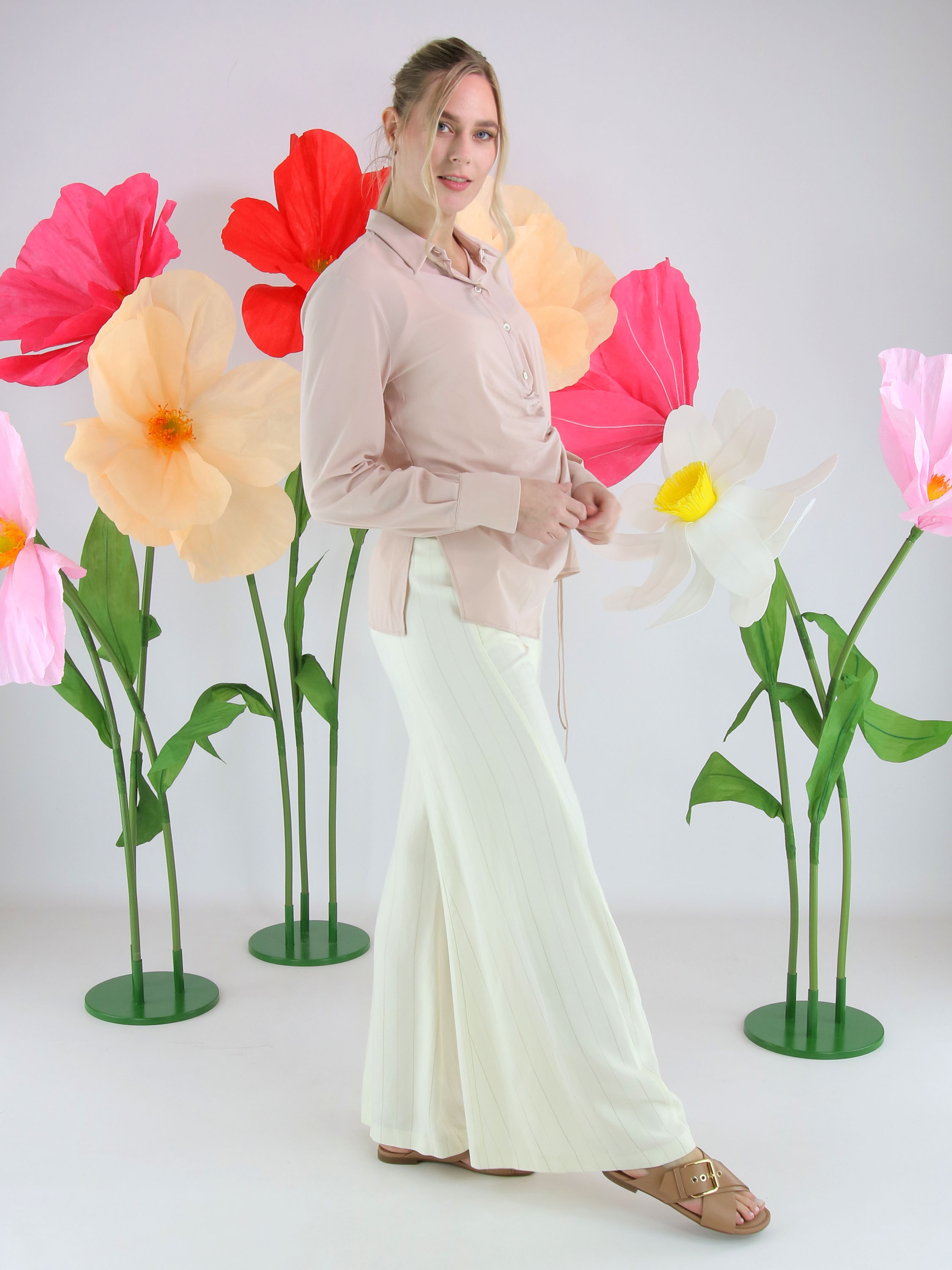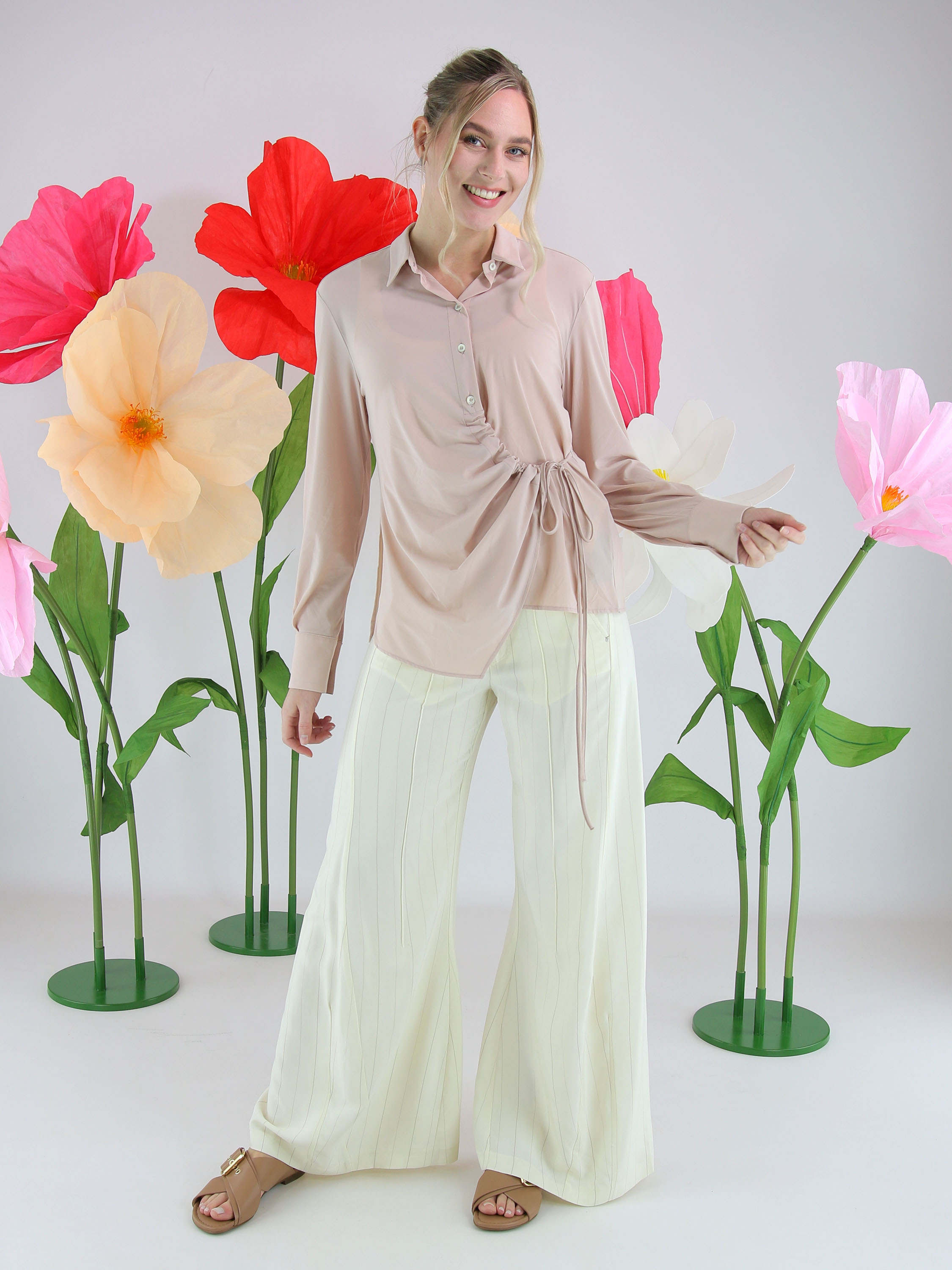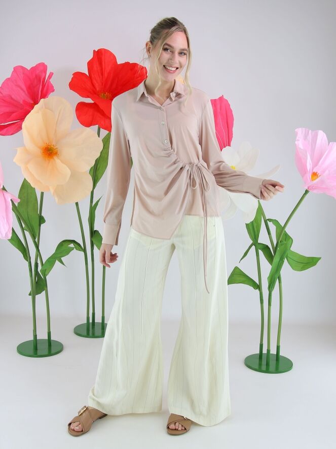 Weite Hose von High in einem edlen Nadelstreifenmuster in Cremeweiß und Camel. Die Hosenbeine verlaufen in einer dezenten Flared-Linie und verleihen dem Modell eine feminine, moderne Silhouette. Mit Eingrifftaschen versehen, darf diese exklusive Designerhose nicht gewaschen werden.